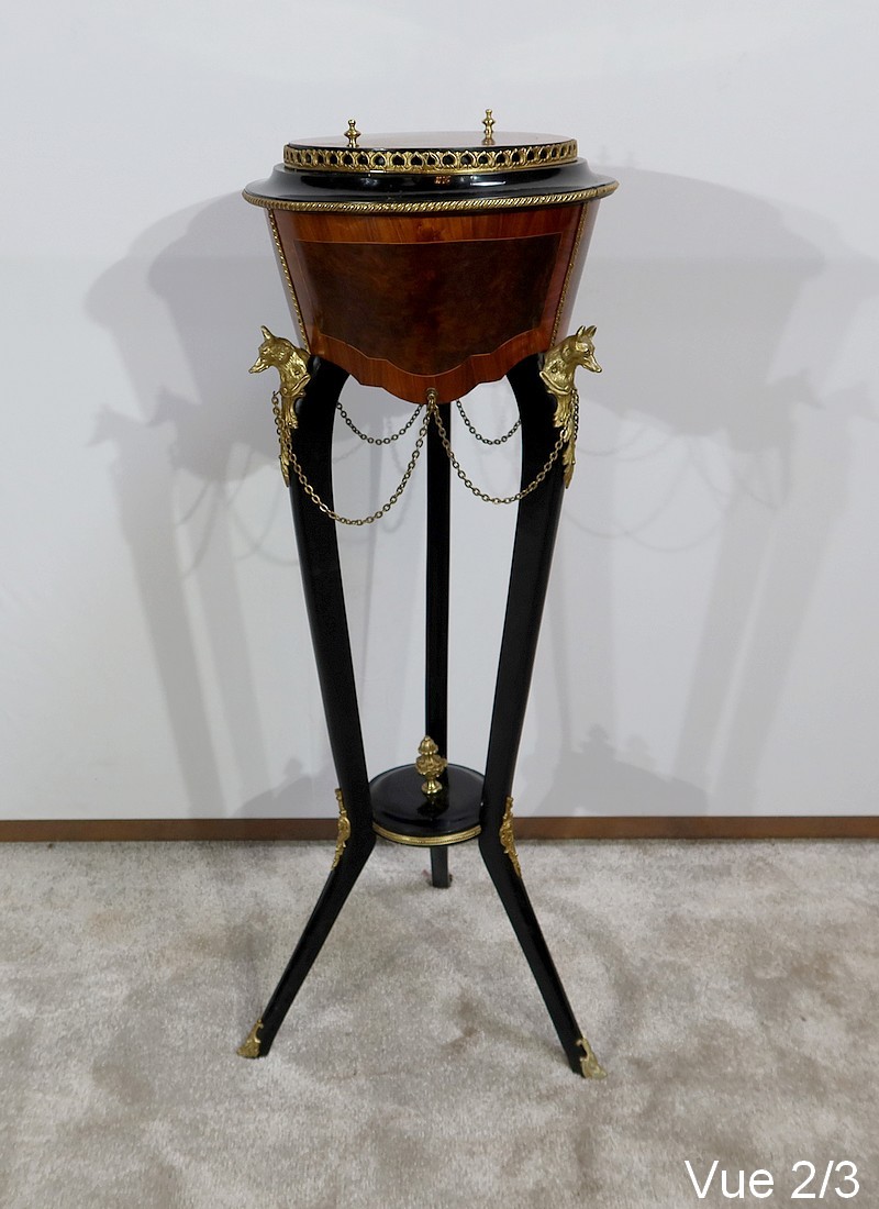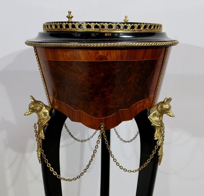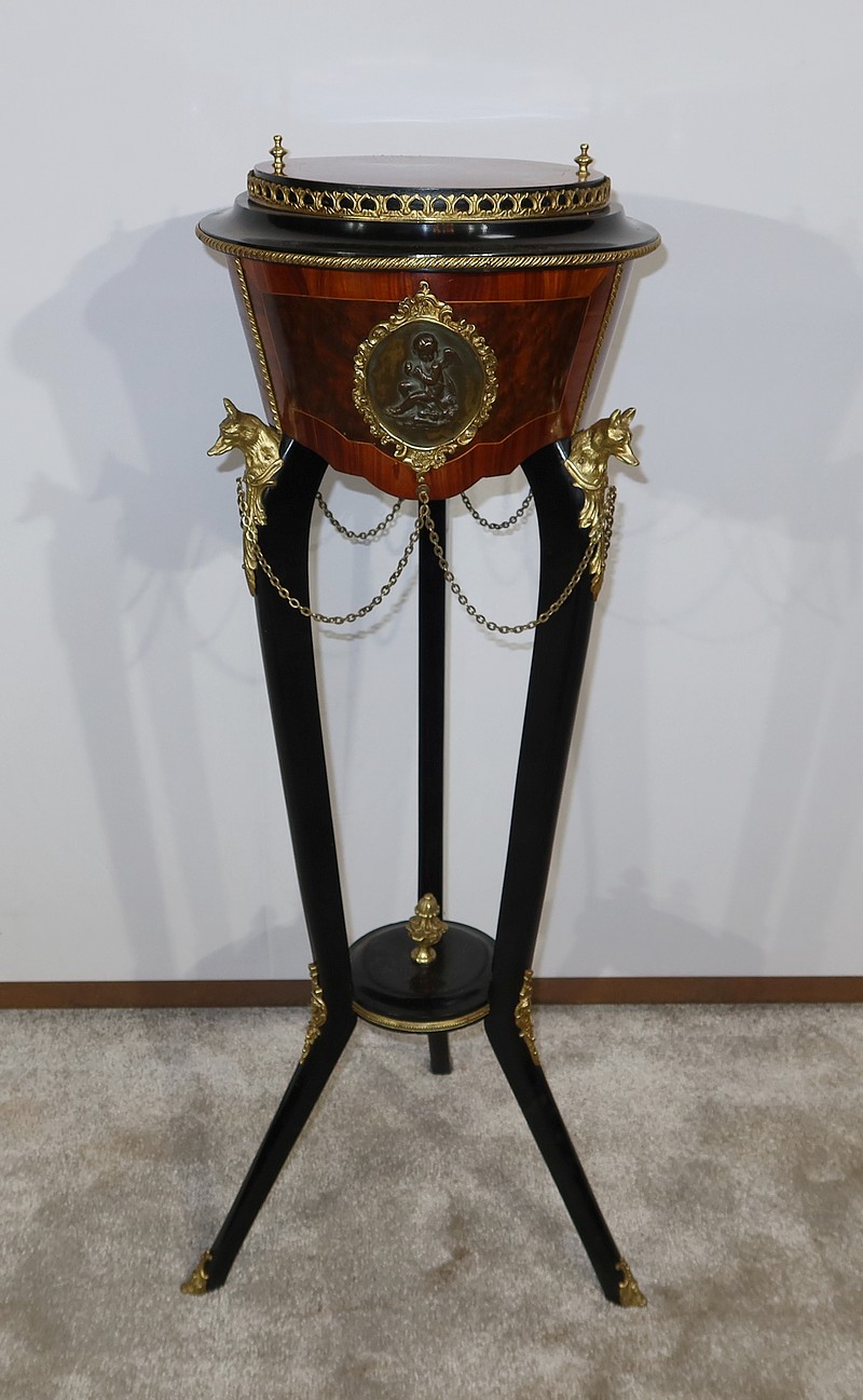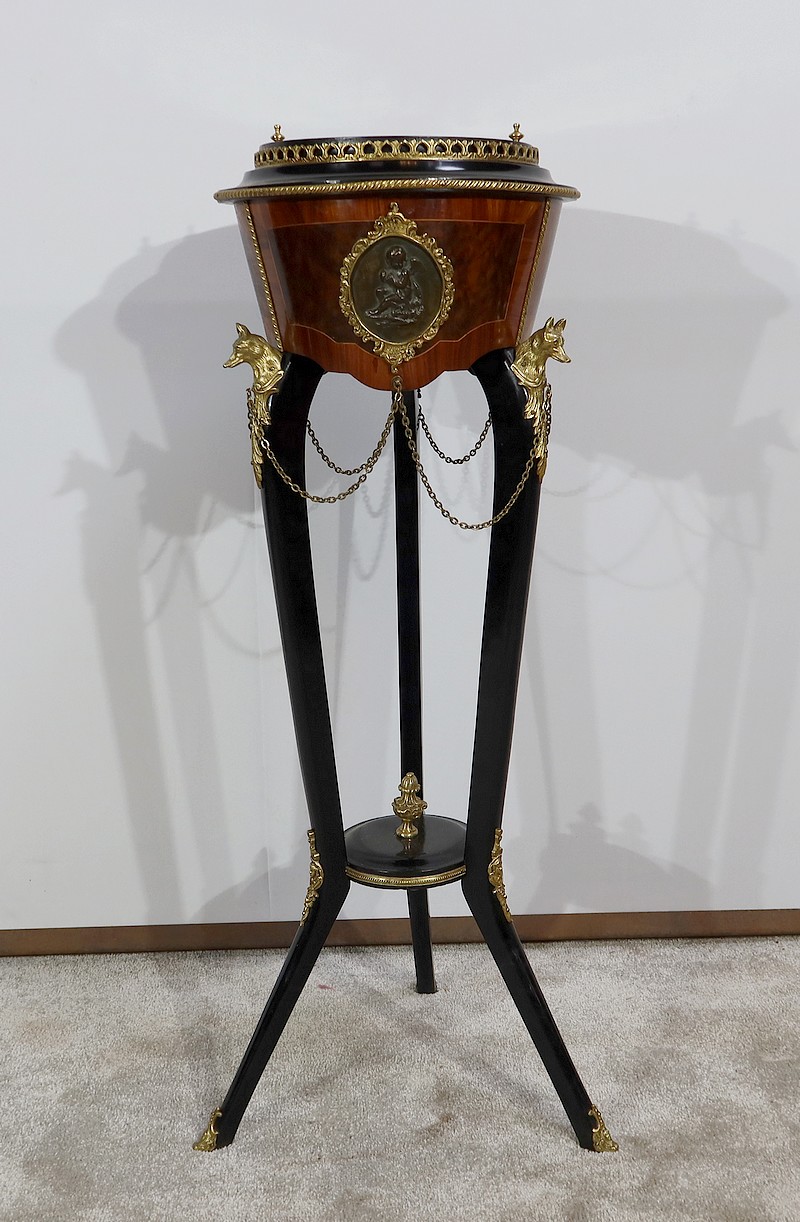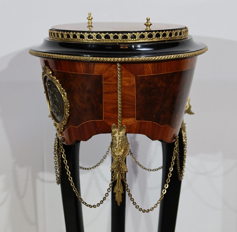 Élégante et rare athénienne formant jardinière, munie d’une ceinture cylindrique, conique et à découpe, avec au centre un placage de thuya entouré d’un filet de citronnier et d’un encadrement en bois de rose. Un grand médaillon ovale avec frise feuillagée en bronze doré entoure un ange en relief en bronze à patine verte. De ce médaillon partent des chainettes en chapelet rejoignant des têtes de loups en bronze doré se terminant par une feuille d’acanthe.