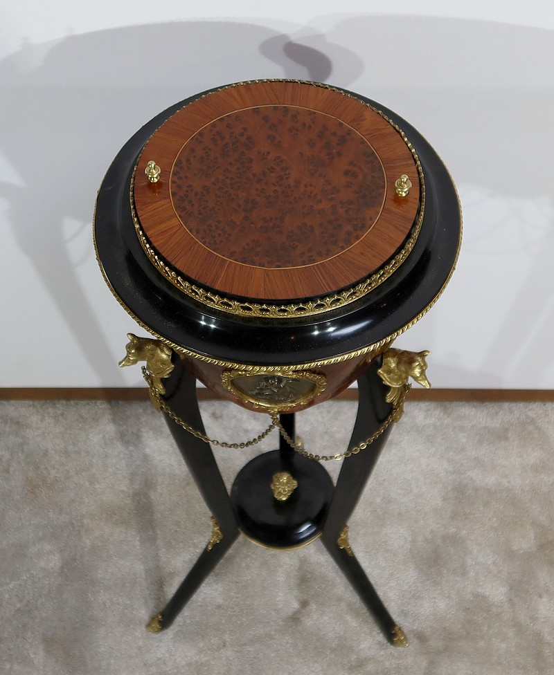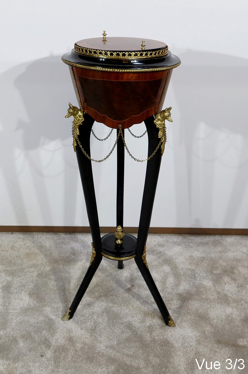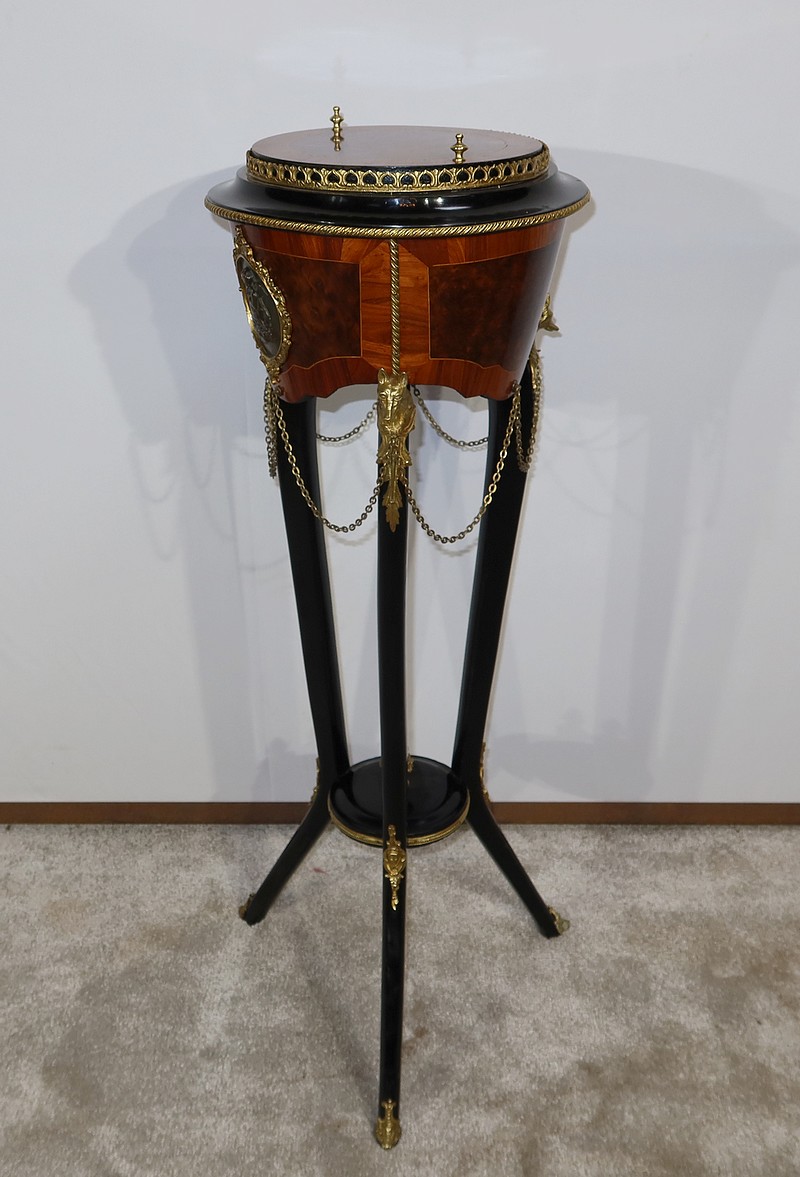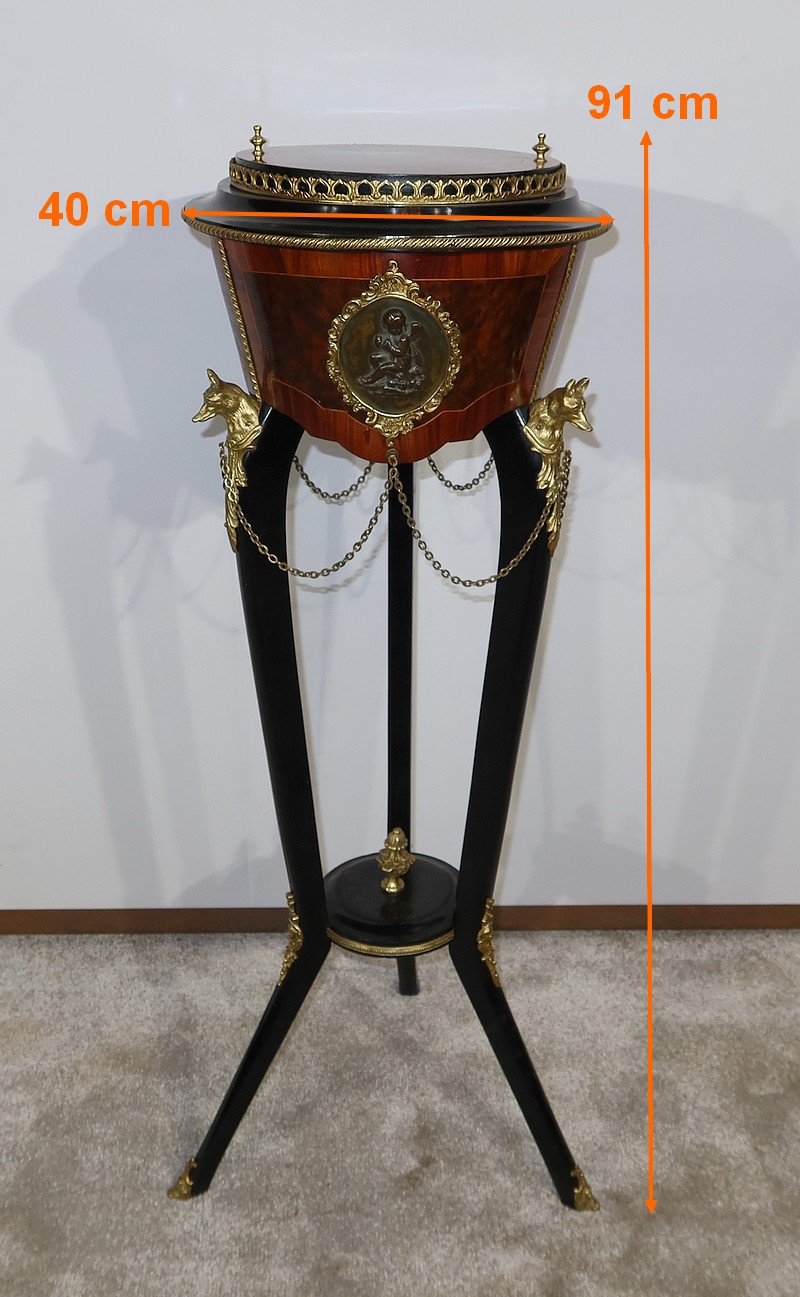 Élégante et rare athénienne formant jardinière, munie d’une ceinture cylindrique, conique et à découpe, avec au centre un placage de thuya entouré d’un filet de citronnier et d’un encadrement en bois de rose. Un grand médaillon ovale avec frise feuillagée en bronze doré entoure un ange en relief en bronze à patine verte. De ce médaillon partent des chainettes en chapelet rejoignant des têtes de loups en bronze doré se terminant par une feuille d’acanthe.