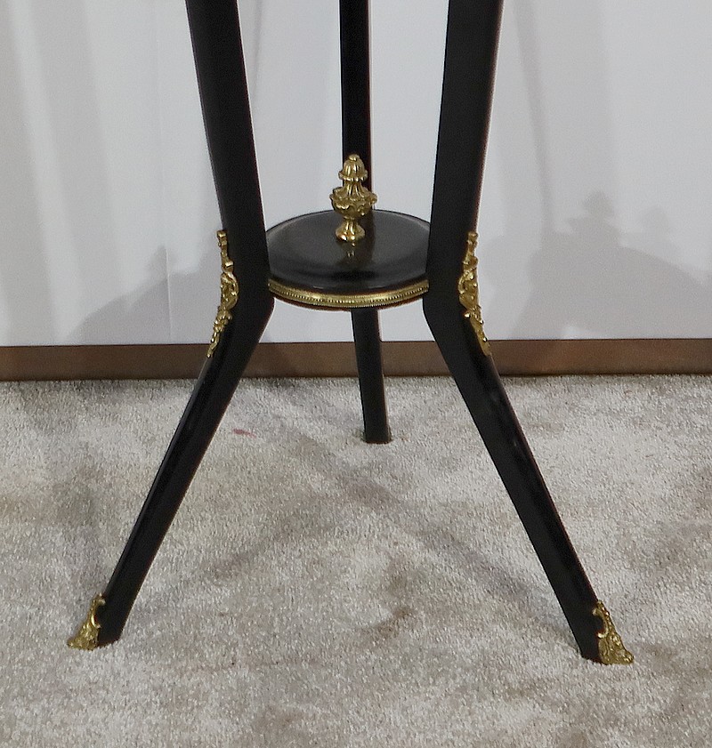Les pieds sont reliés par un plateau circulaire mouluré et habillé d’une frise en bronze et garni d’une pomme de pin en son centre.