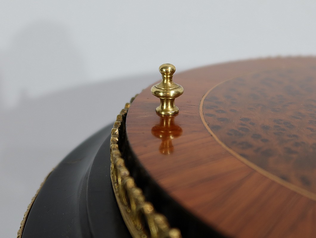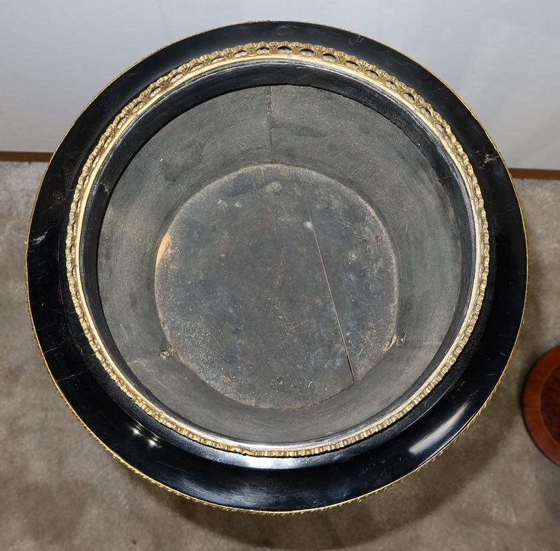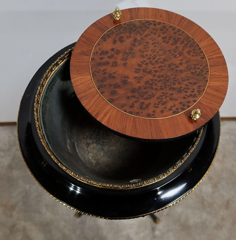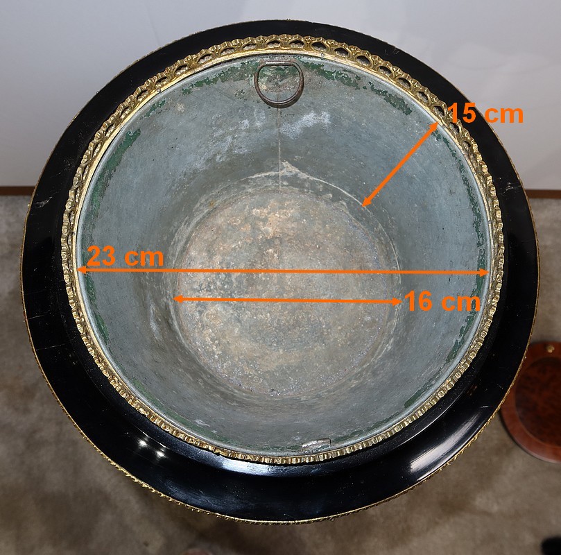 La partie haute de cette athénienne est composée d’une large moulure à débordement en bois noirci dont le chant est habillé d’une baguette ciselée en bronze. Au dessus, une galerie ajourée en bronze entoure un couvercle amovible avec placage de thuya entouré d’un filet de citronnier et de bois de rose. Celui-ci est muni de deux petits éléments tournés en bronze permettant l’ouverture. A l’intérieur, un bac en zinc également amovible.