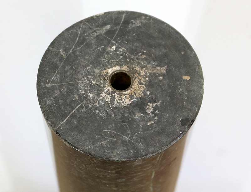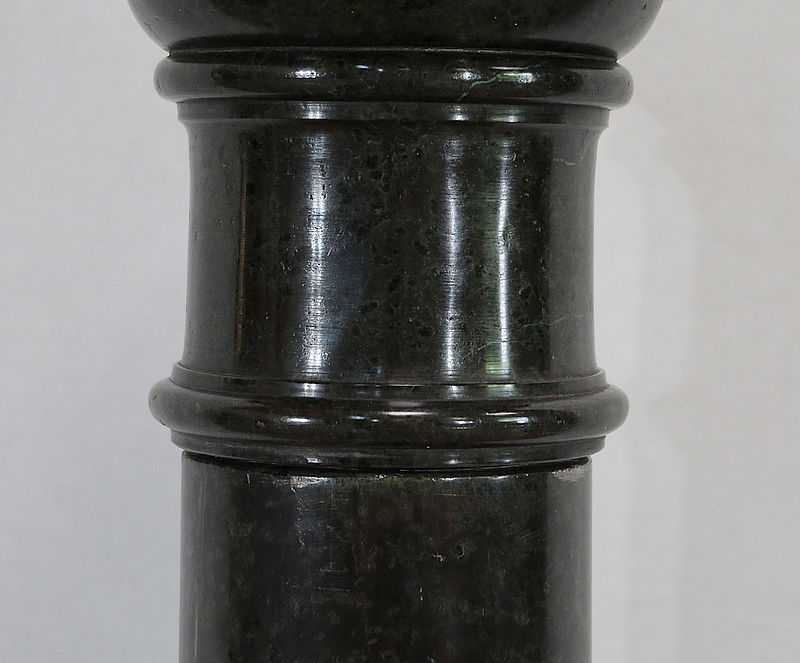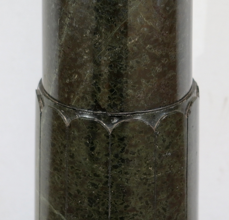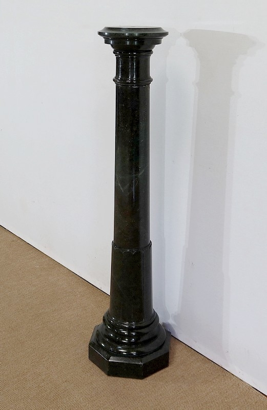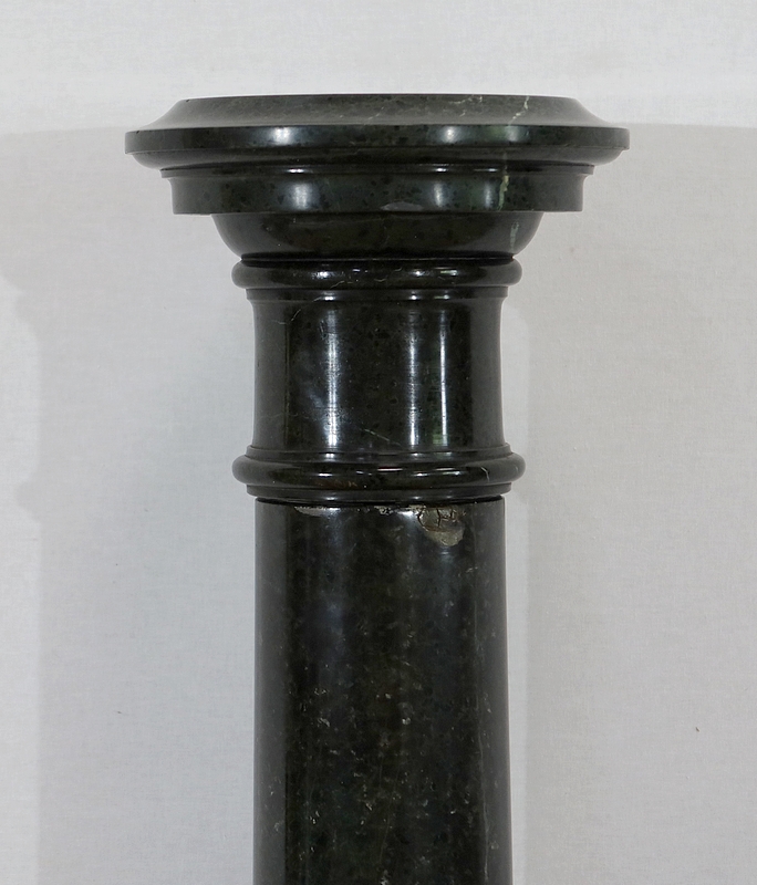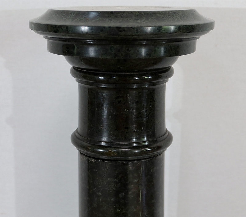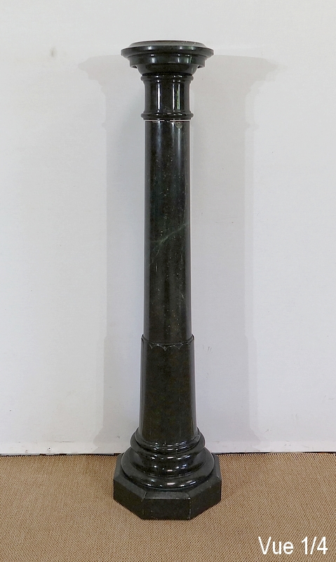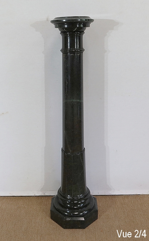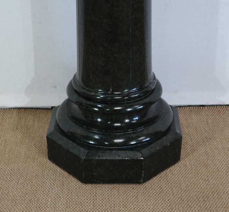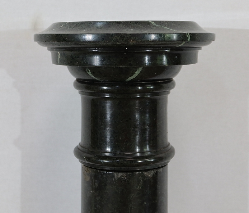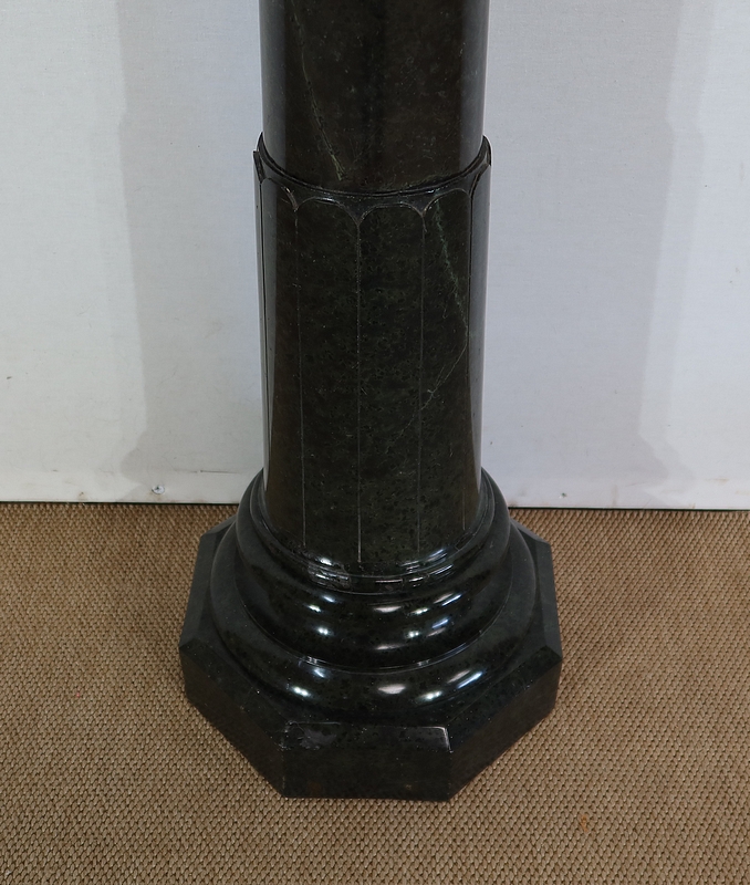 Belle colonne en marbre vert de mer, appelé également vert de Gênes, reposant sur un socle octogonal chanfreiné composé d’importantes moulures surplombé d’une partie festonnée. Cette colonne raffinée est dotée d’un fût cylindrique s’amincissant vers le haut et d’un plateau tournant circulaire à débordement.
