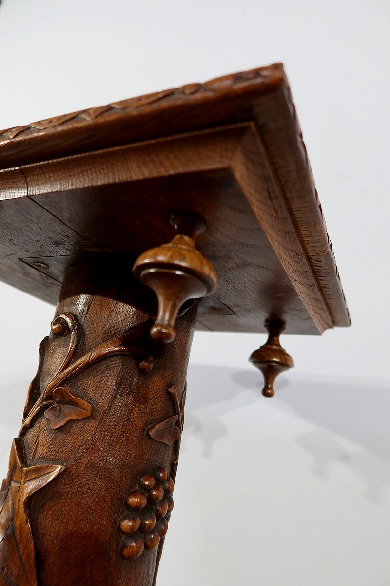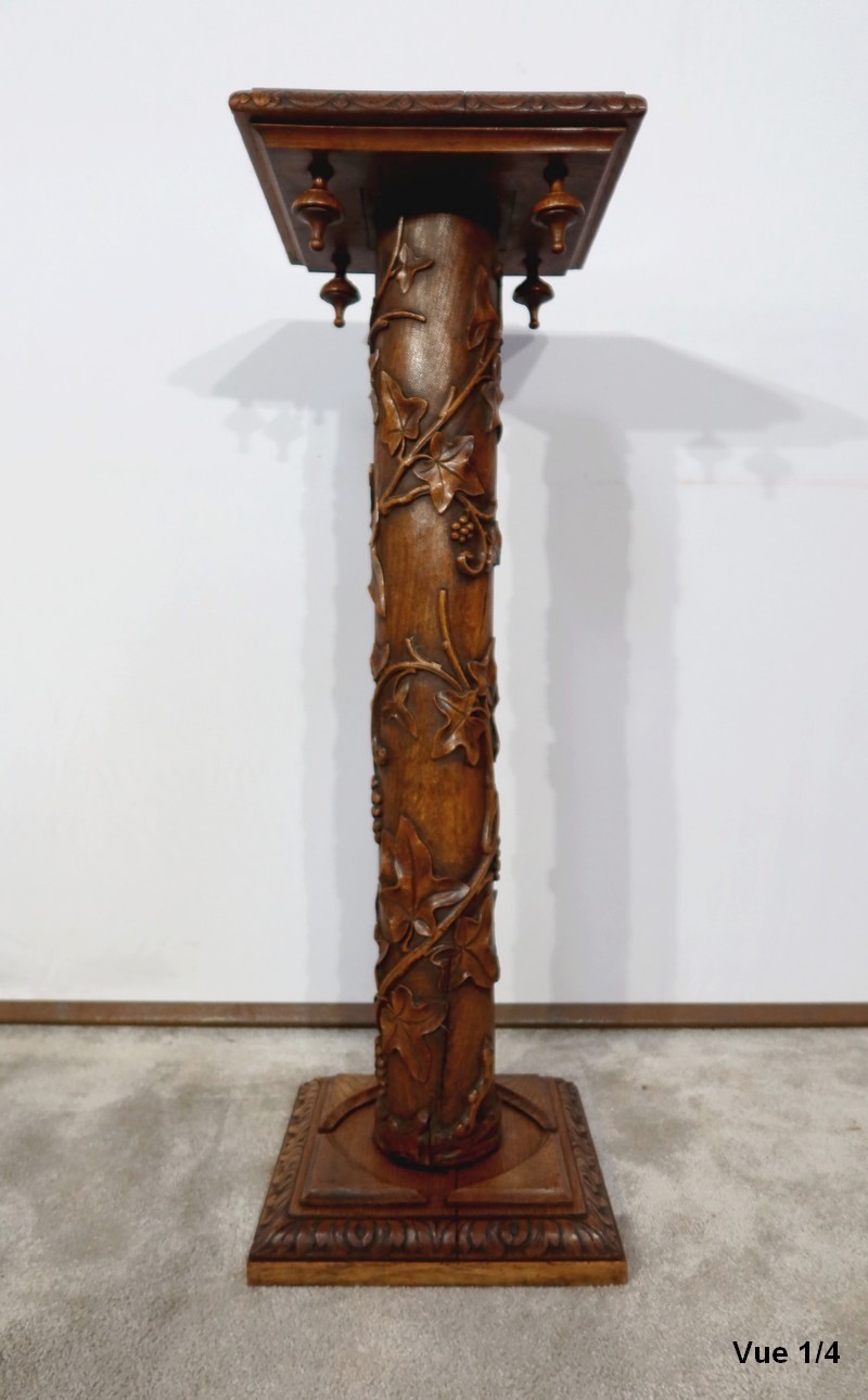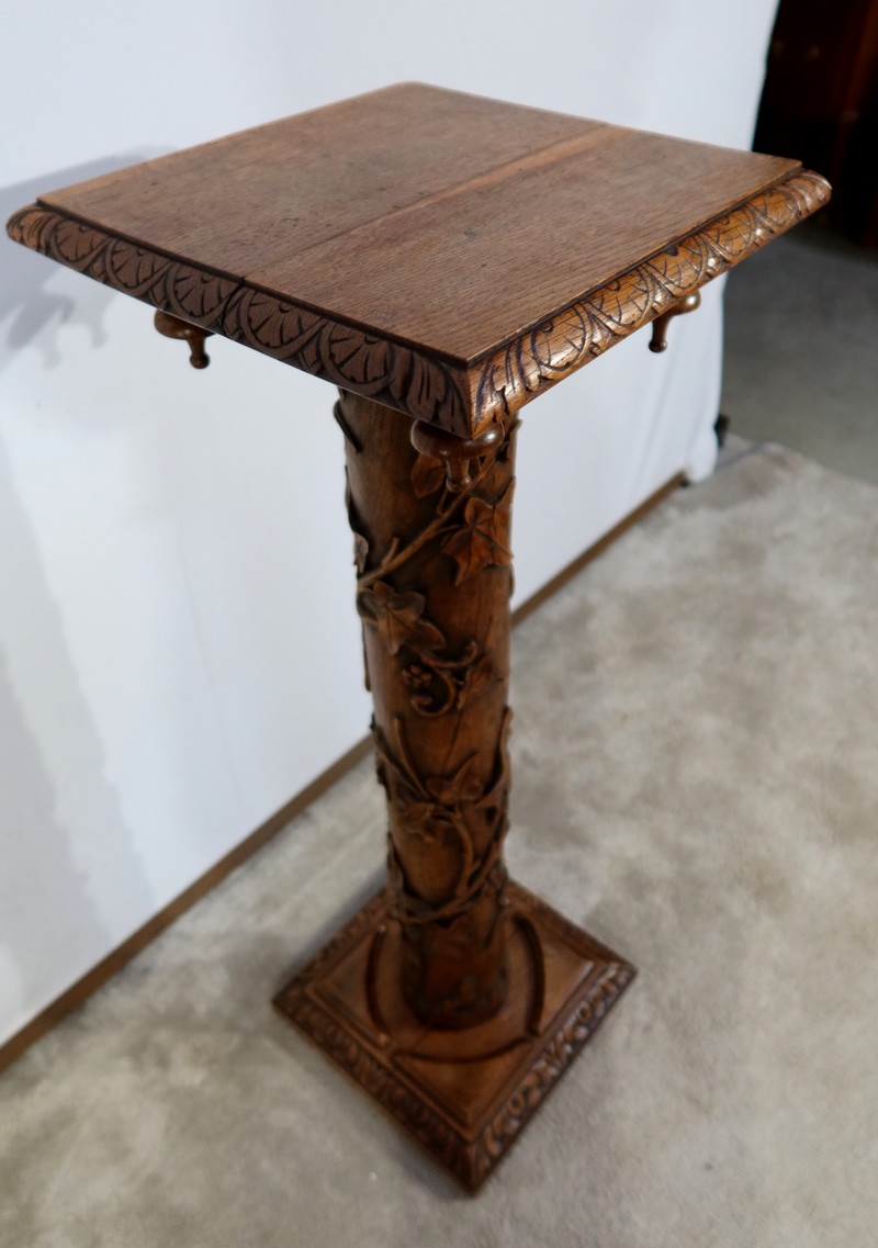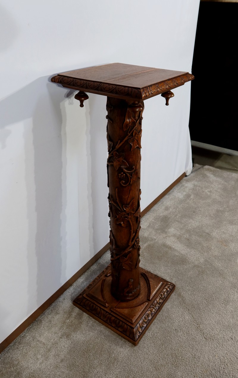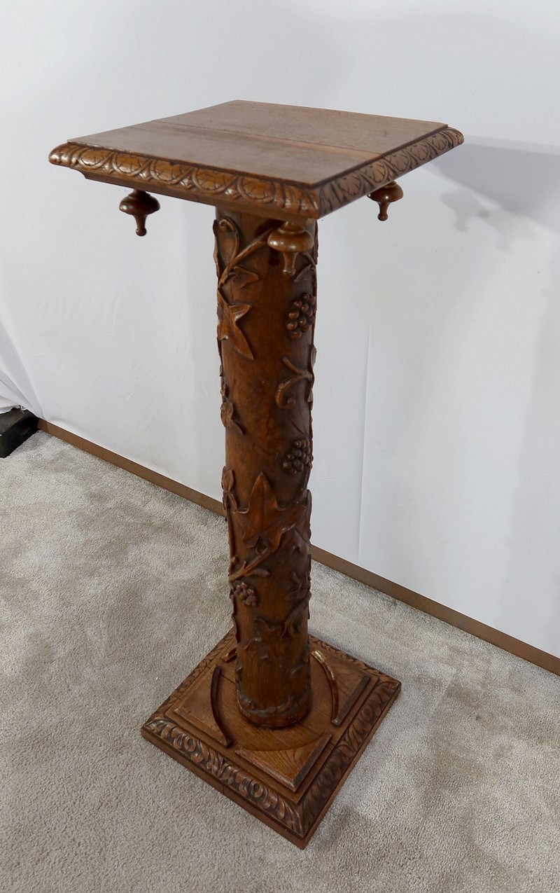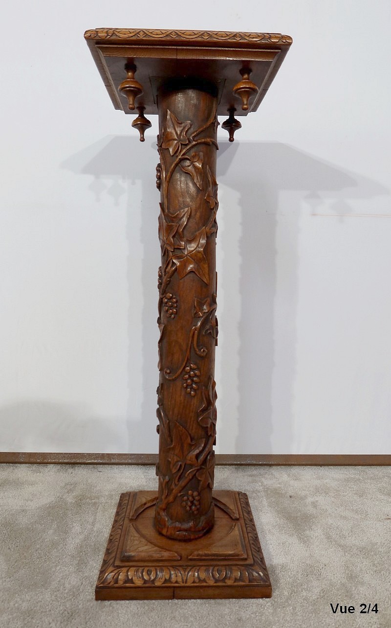 Colonne en chêne composée d’un fût cylindrique sculpté en relief de feuilles de vigne et de grappes de raisin.
