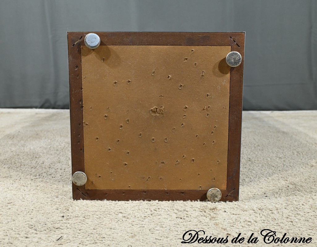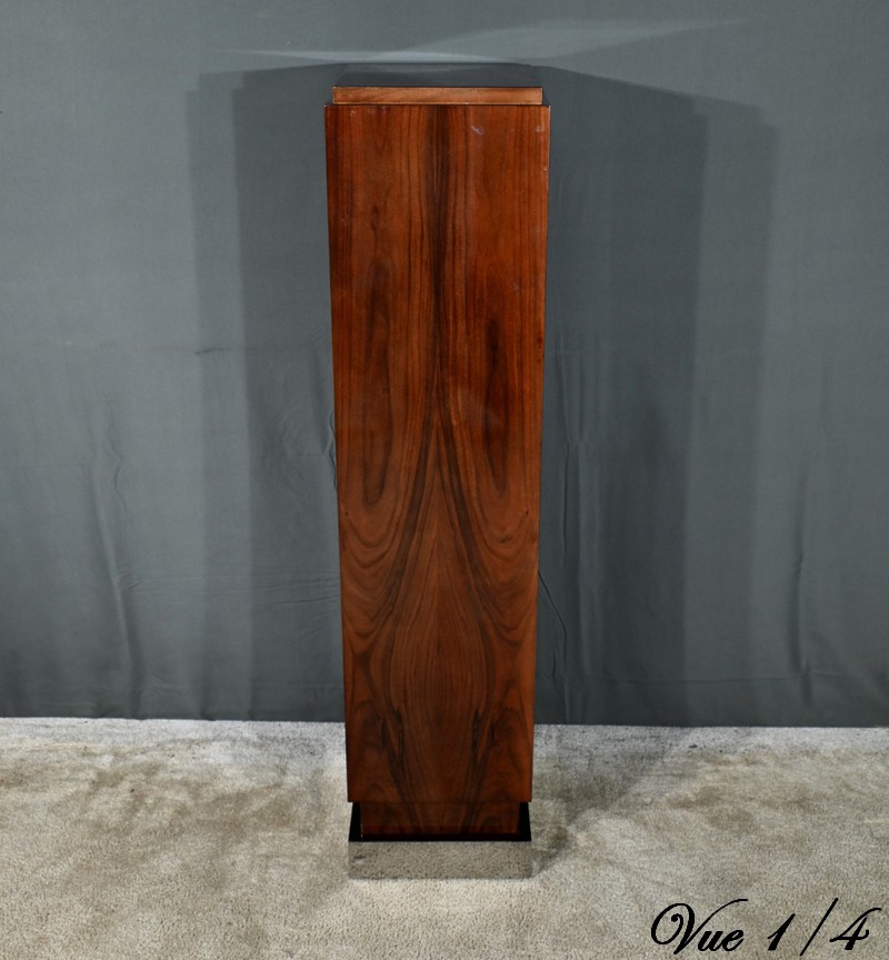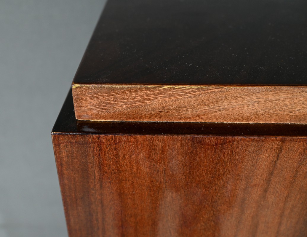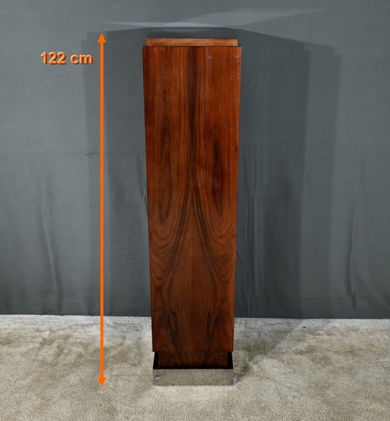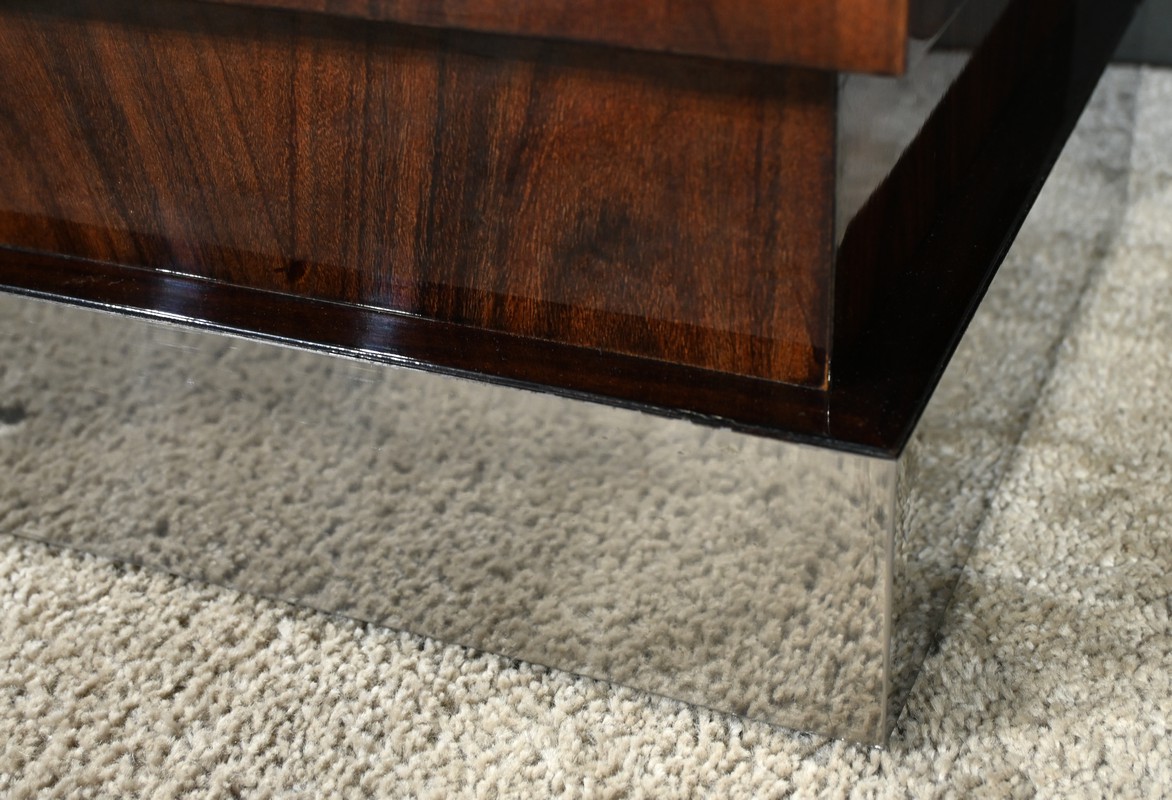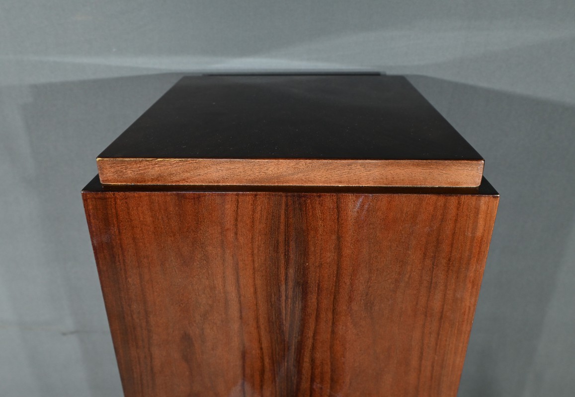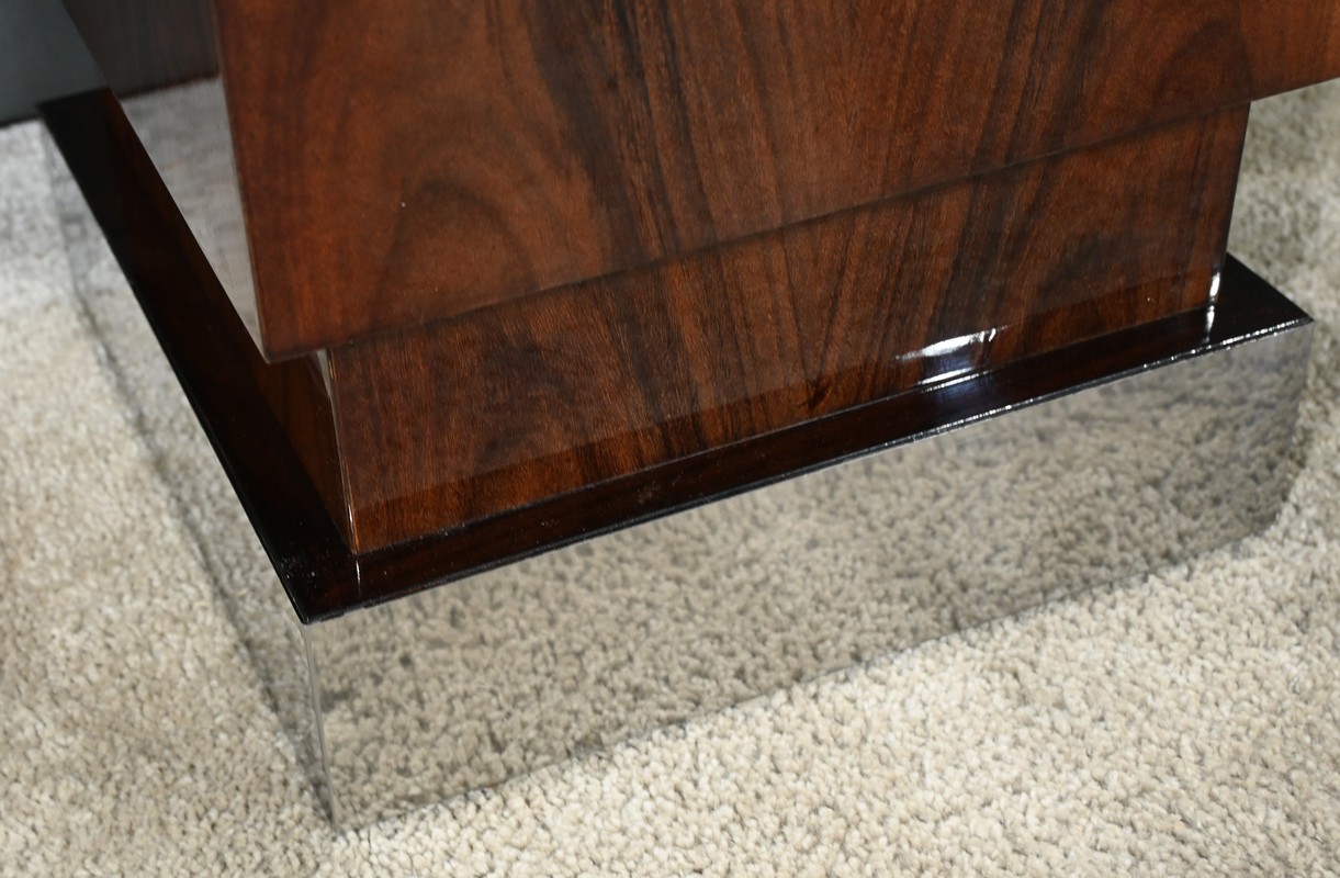 Fabriquée en placage de noyer, elle présente une section rectangulaire avec un dessus en retrait, soulignant les lignes géométriques et la simplicité caractéristique de l’art déco.
