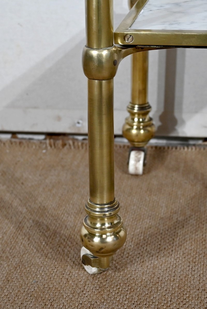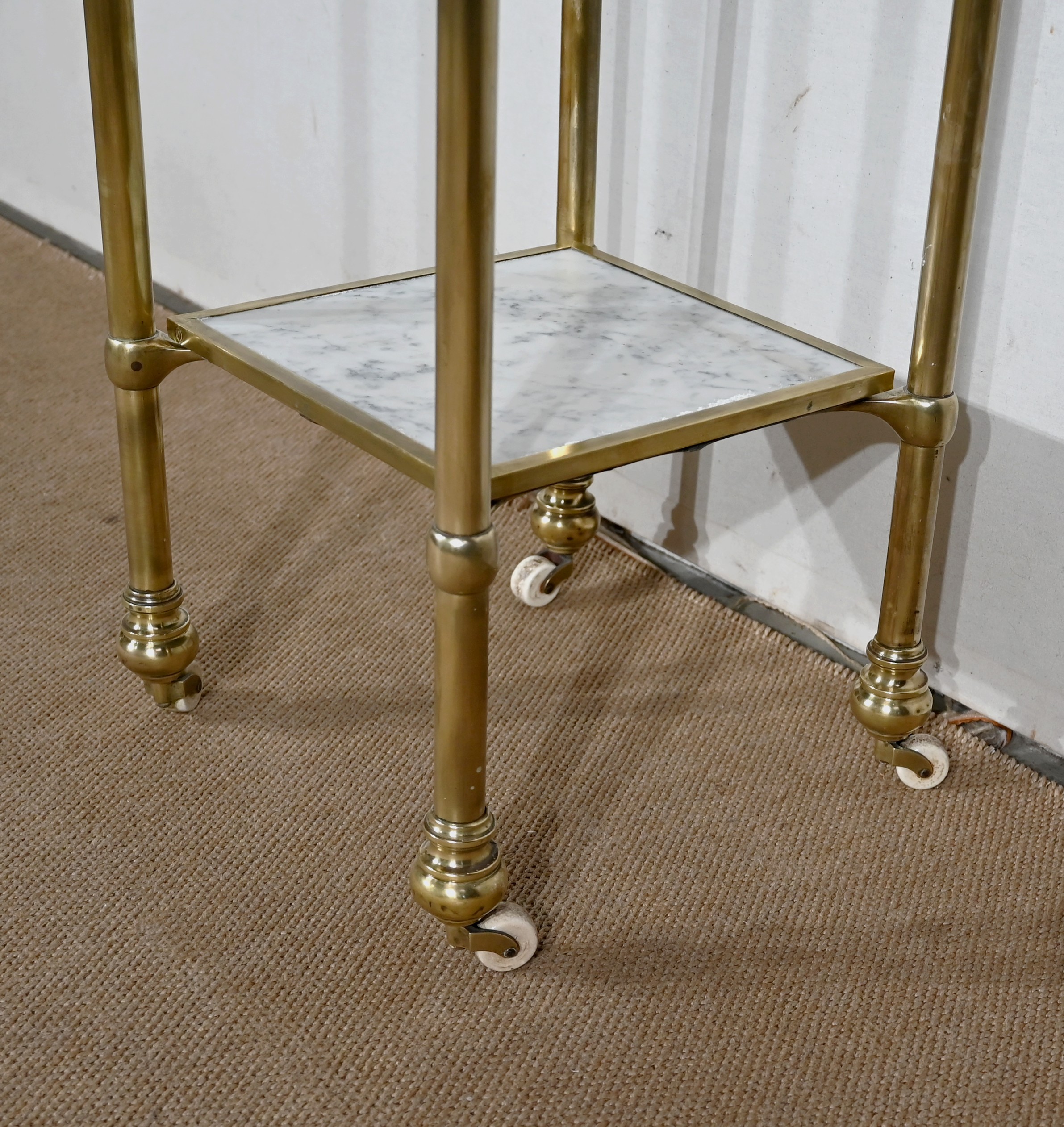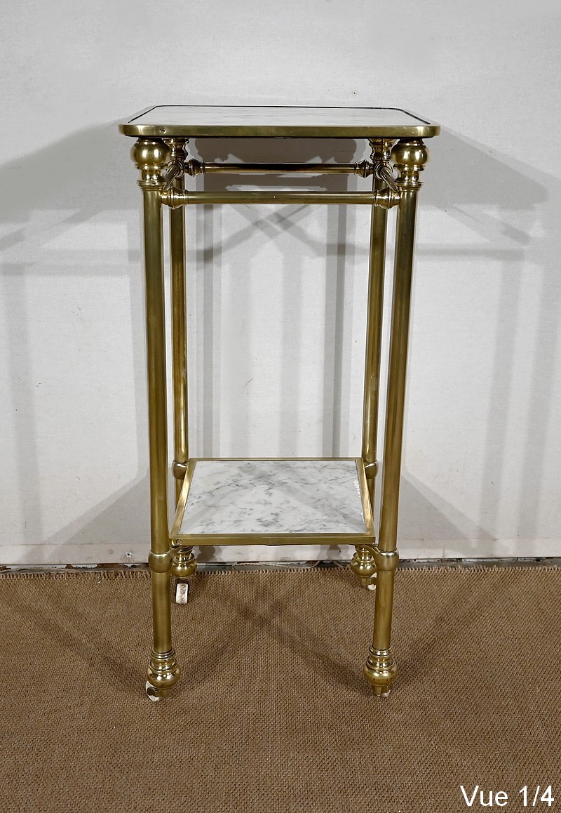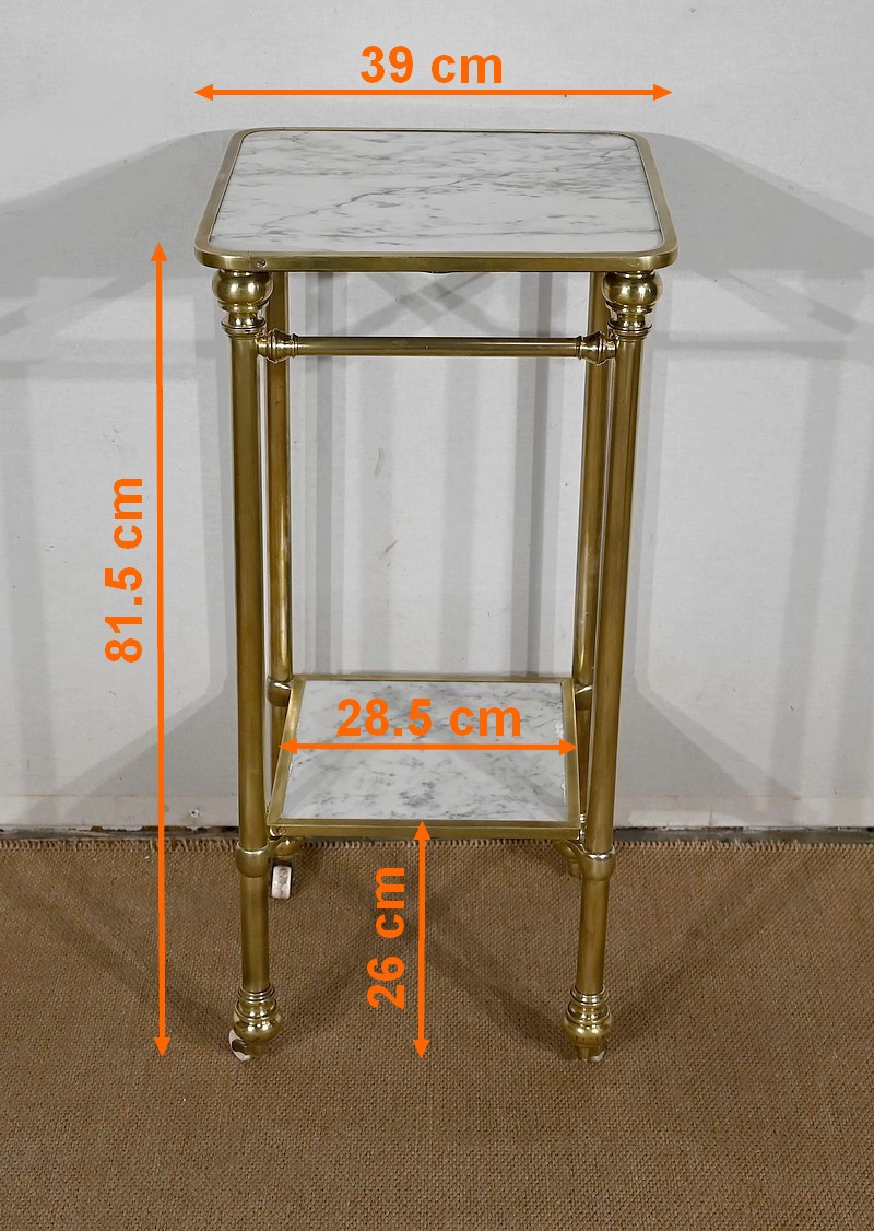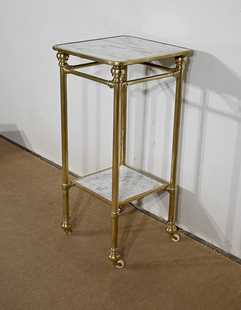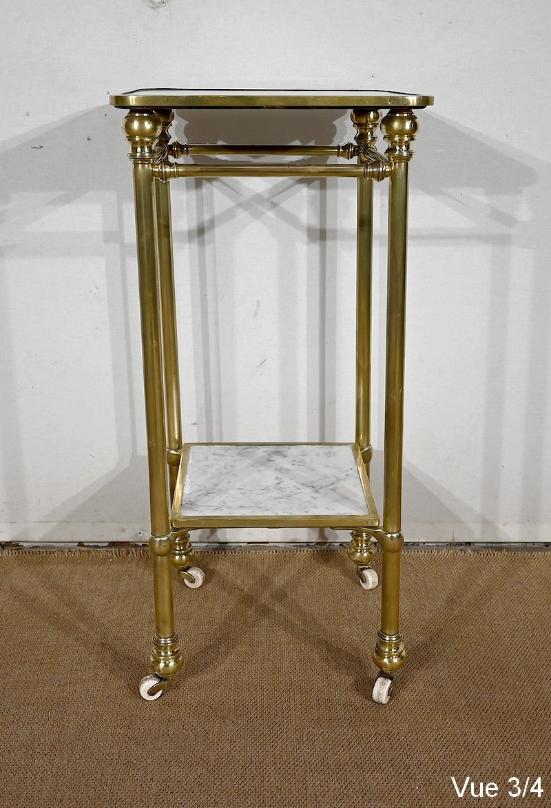 En partie basse et en retrait, un plateau en marbre de plus petite taille est relié aux pieds par des bagues en laiton et apporte un espace de rangement supplémentaire.