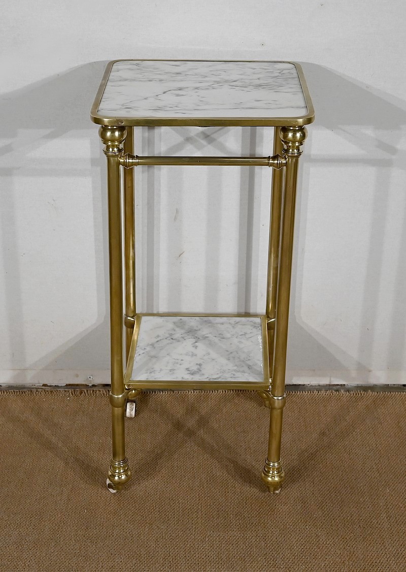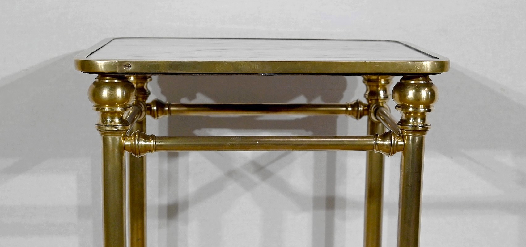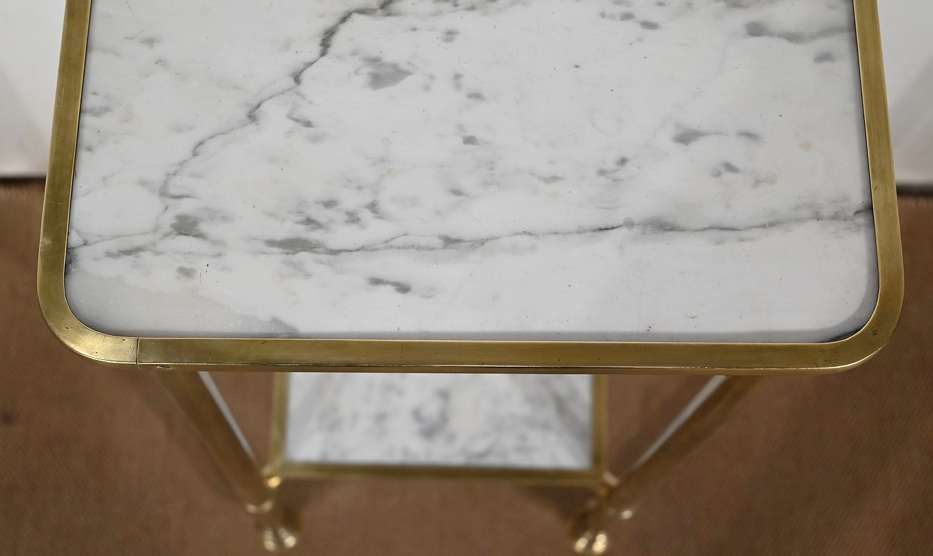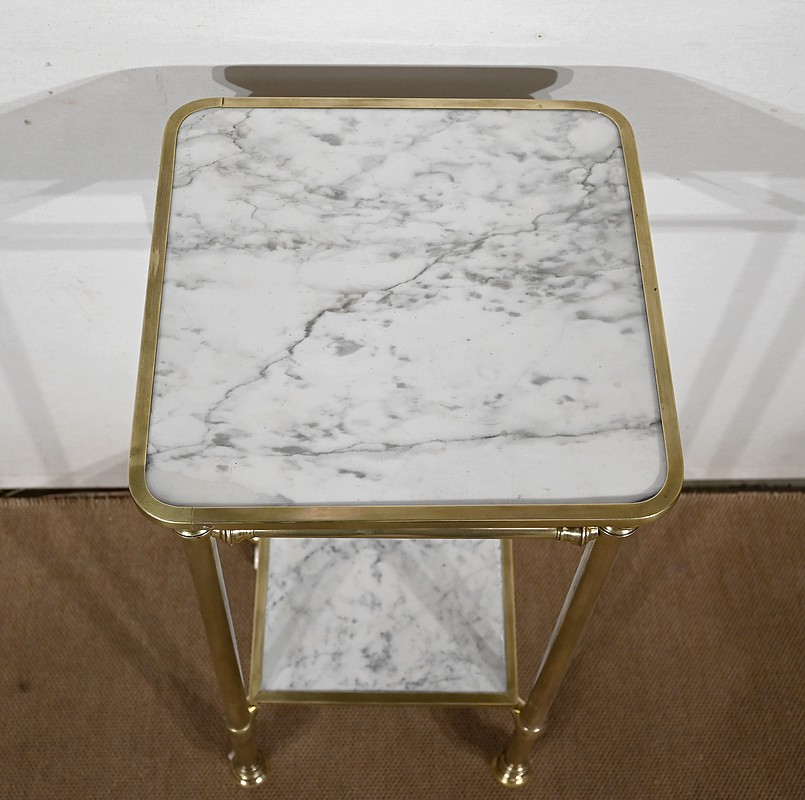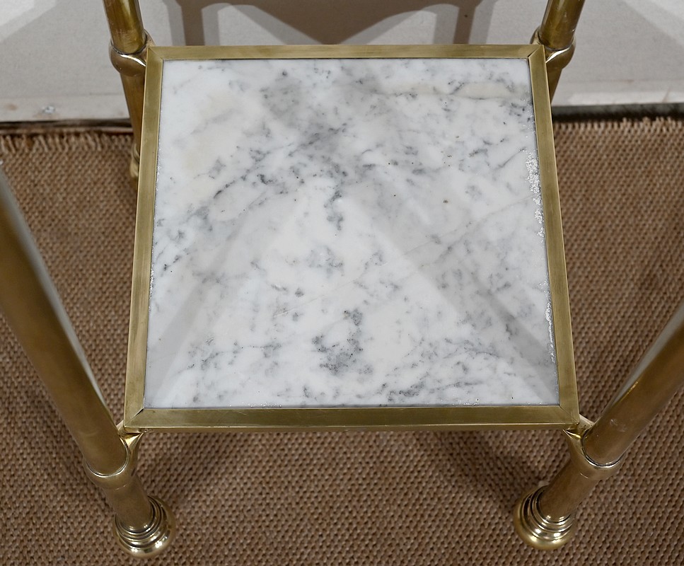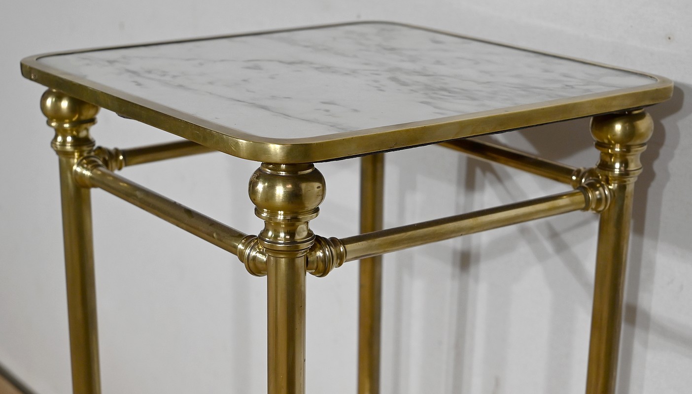 Élégante petite table d’appoint de section carrée, sommée d’un marbre de carrare veiné de gris. Ce dessus est habillé d’un pourtour en laiton épousant la forme du marbre.