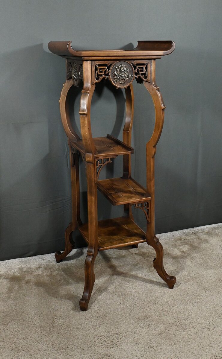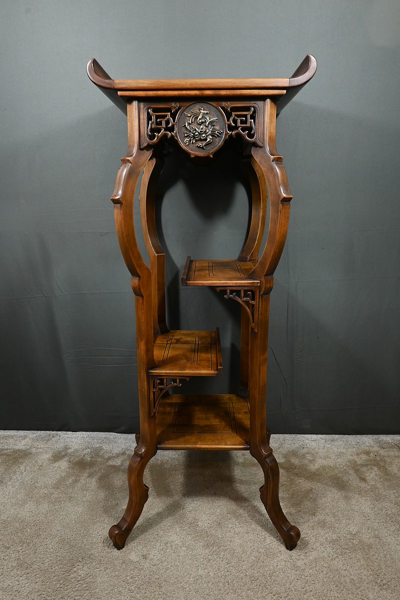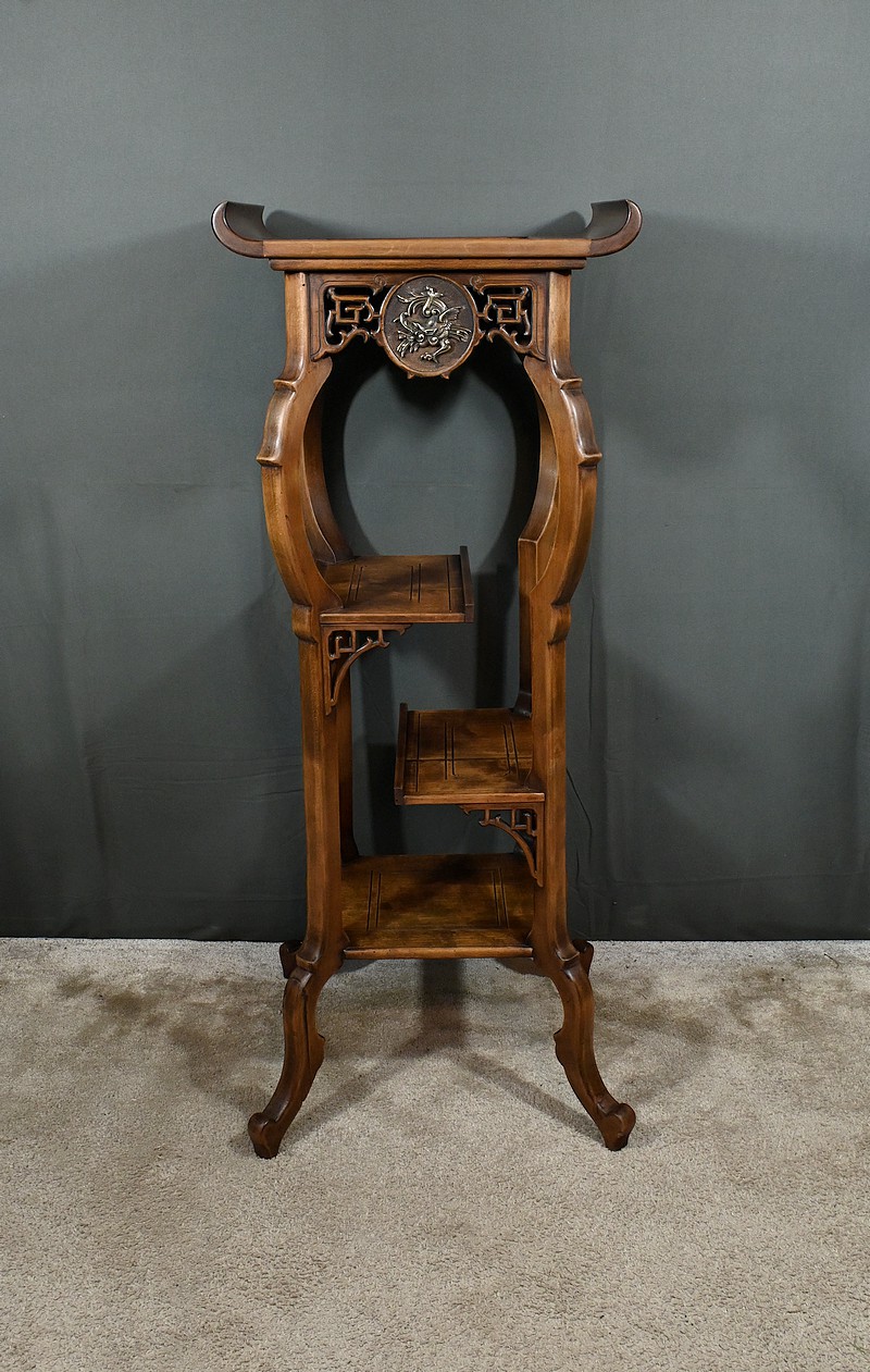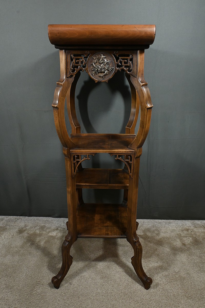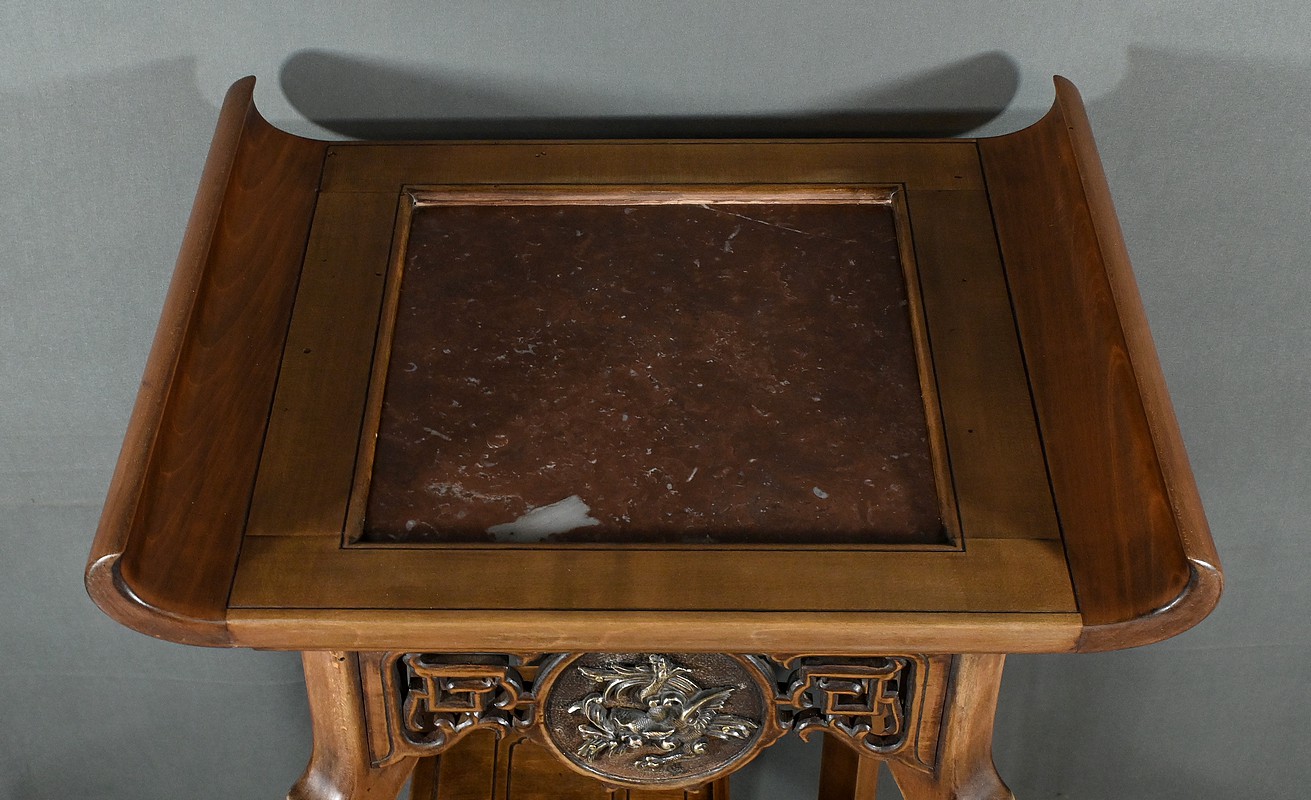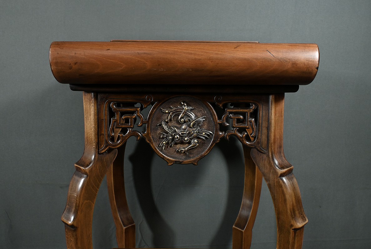 Magnifique sellette haute en hêtre teinté sculpté et ajouré, inspirée des créations de Gabriel Viardot. Inspirée par l’esprit d’Extrême-Orient, cette sellette se distingue par ses tablettes d’entrejambe finement incisées de motifs géométriques et accompagnée de rebords. Ses façades sont agrémentées de grands médaillons en bronze en partie supérieure. Ils représentent chacun un dragon en vol, ajoutant une dimension mystique à ce mobilier. Ce dernier possède des pieds mouvementés et un plateau encastré en marbre griotte de Belgique qui offre une surface lisse et durable, idéale pour mettre en valeur vos objets décoratifs.
