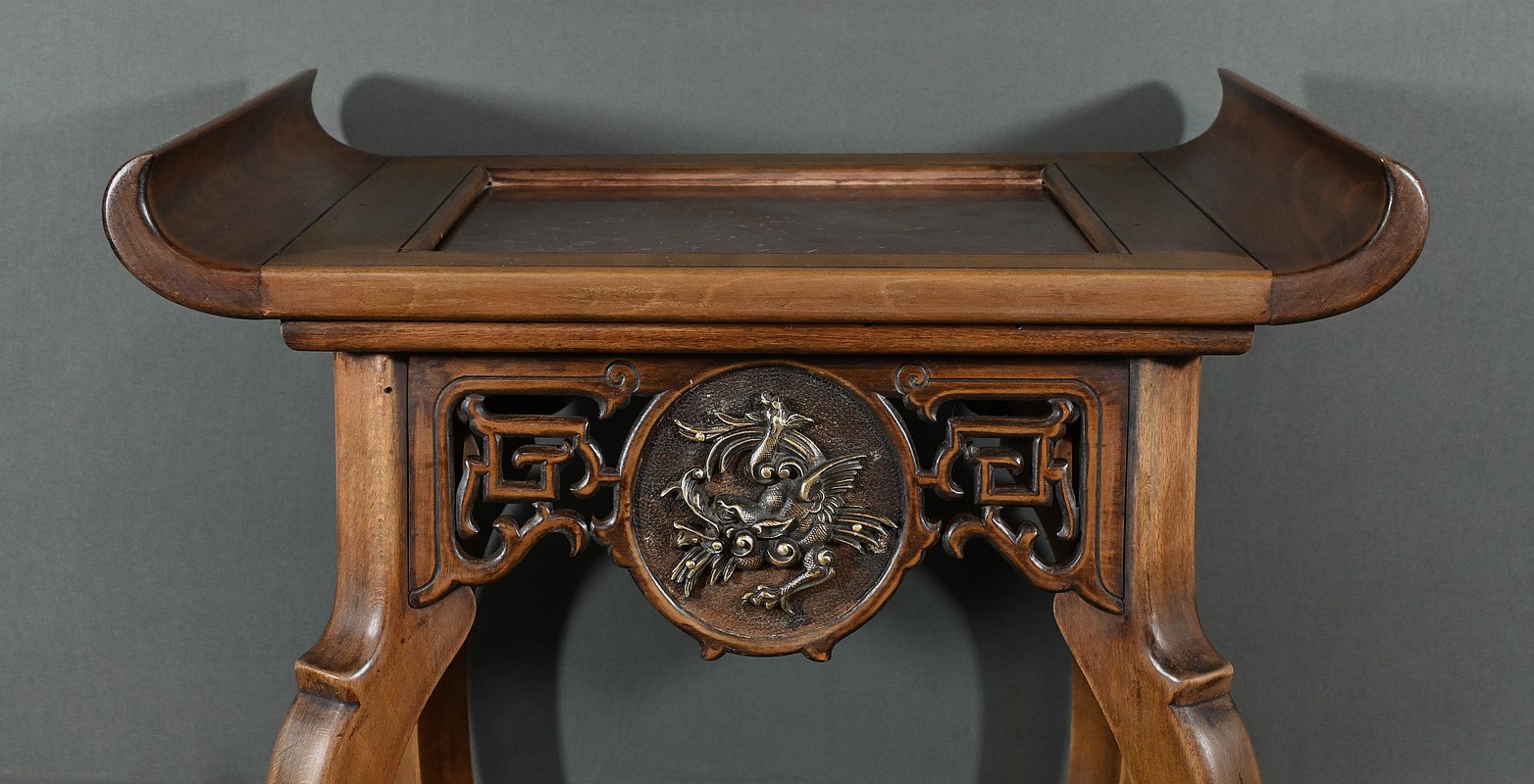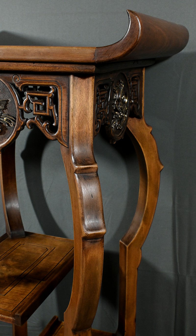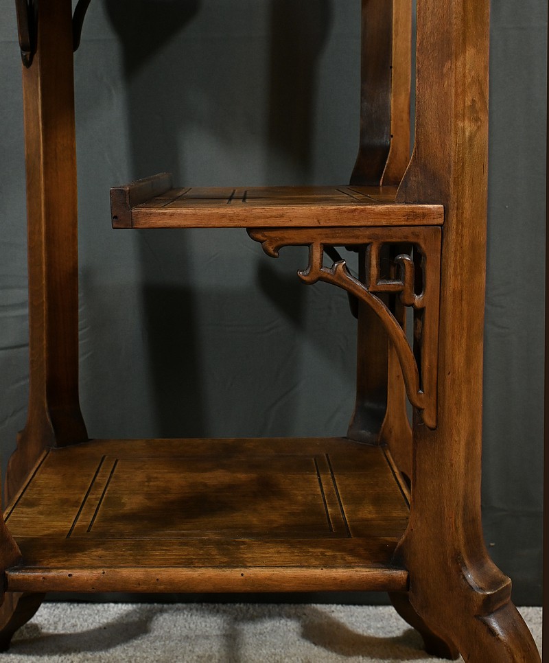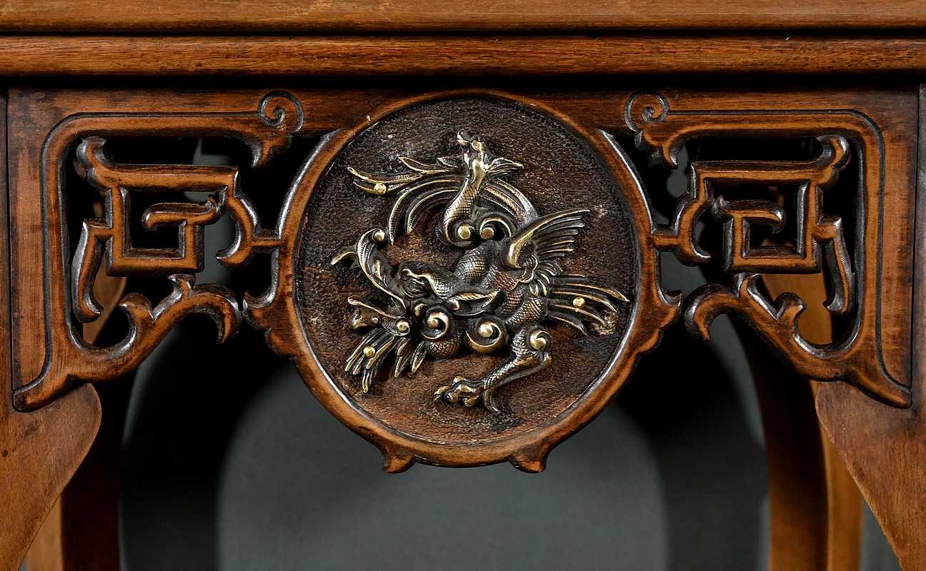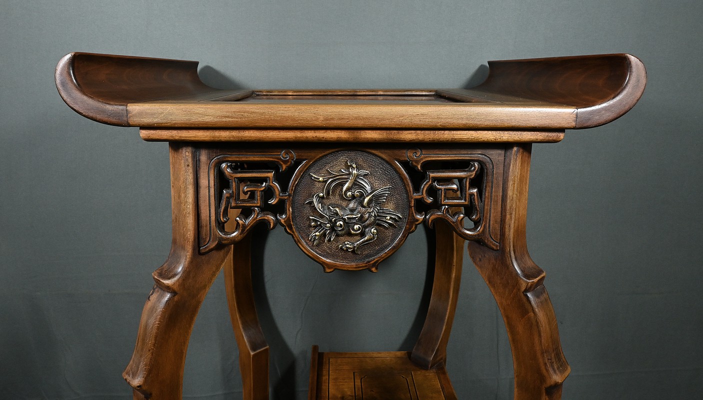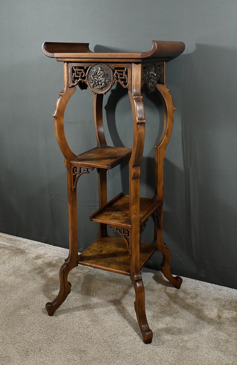 Magnifique sellette haute en hêtre teinté sculpté et ajouré, inspirée des créations de Gabriel Viardot. Inspirée par l’esprit d’Extrême-Orient, cette sellette se distingue par ses tablettes d’entrejambe finement incisées de motifs géométriques et accompagnée de rebords. Ses façades sont agrémentées de grands médaillons en bronze en partie supérieure. Ils représentent chacun un dragon en vol, ajoutant une dimension mystique à ce mobilier. Ce dernier possède des pieds mouvementés et un plateau encastré en marbre griotte de Belgique qui offre une surface lisse et durable, idéale pour mettre en valeur vos objets décoratifs.