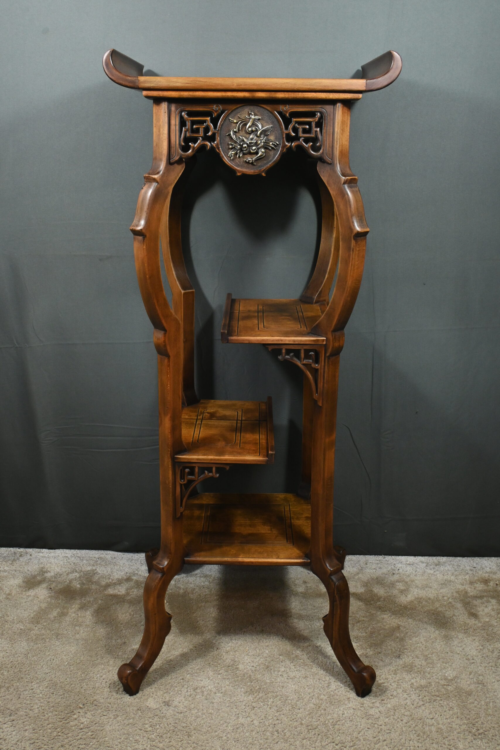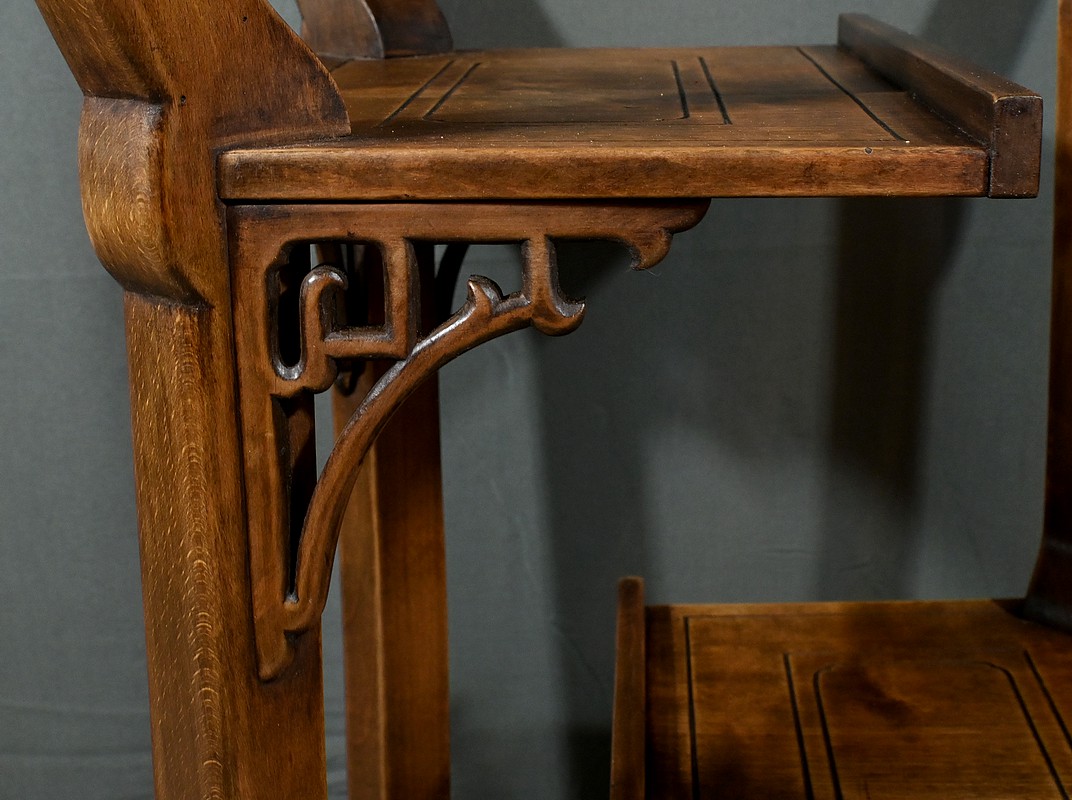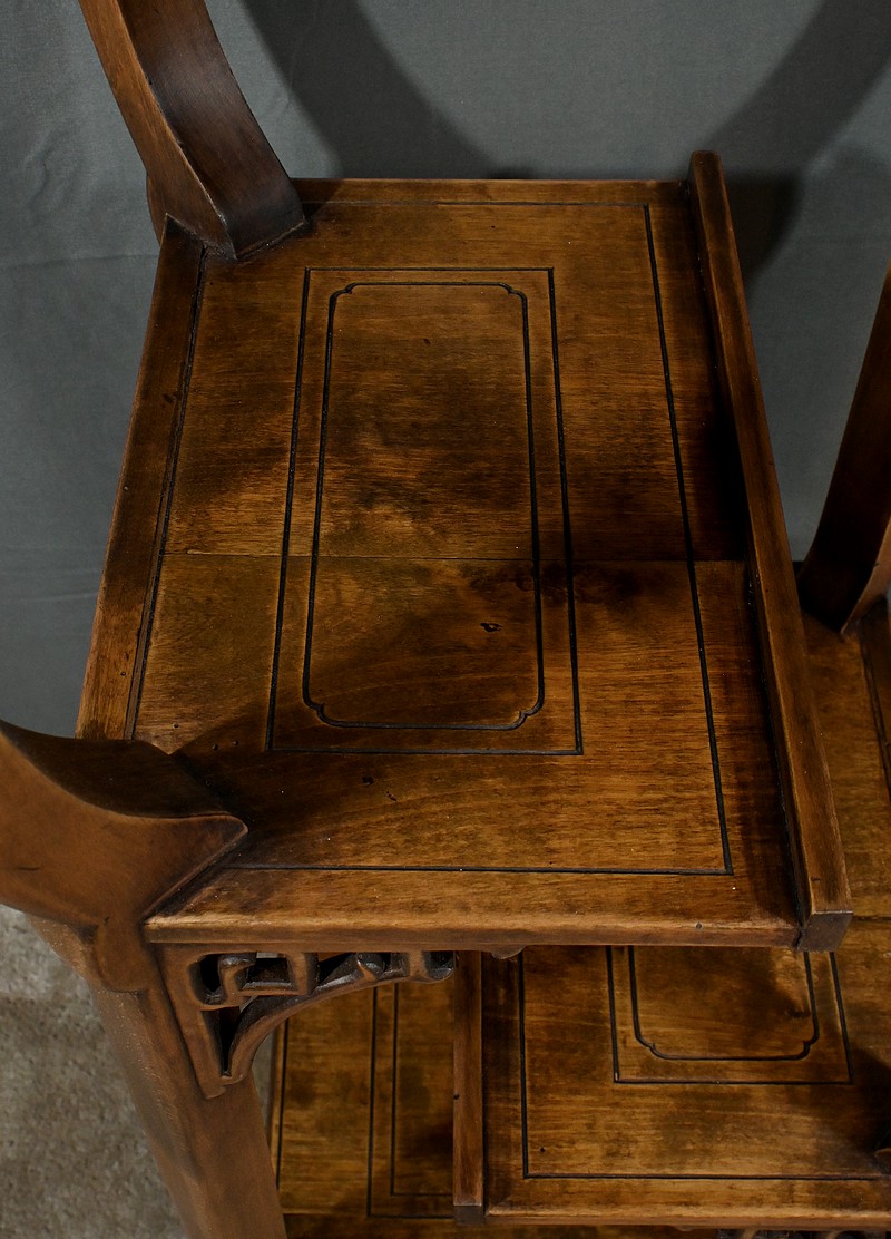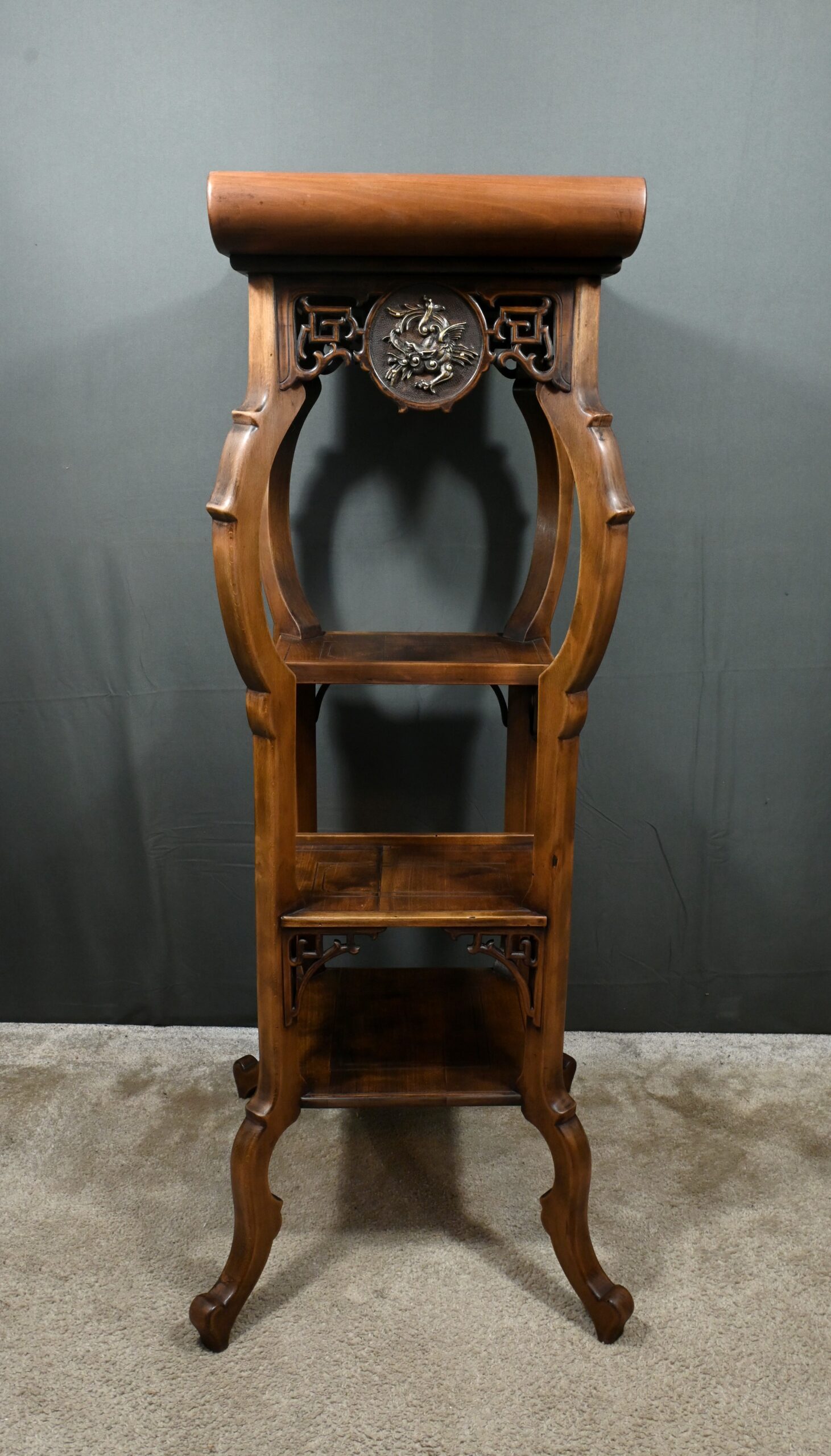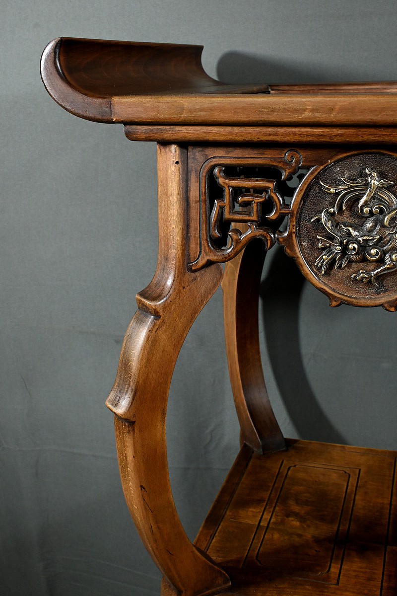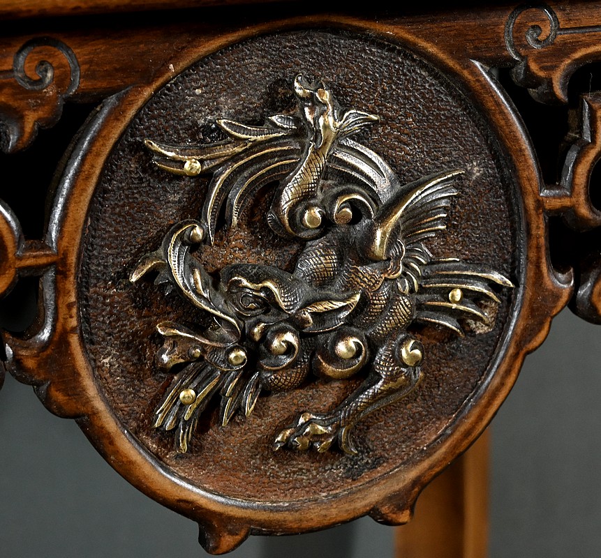 Magnifique sellette haute en hêtre teinté sculpté et ajouré, inspirée des créations de Gabriel Viardot. Inspirée par l’esprit d’Extrême-Orient, cette sellette se distingue par ses tablettes d’entrejambe finement incisées de motifs géométriques et accompagnée de rebords. Ses façades sont agrémentées de grands médaillons en bronze en partie supérieure. Ils représentent chacun un dragon en vol, ajoutant une dimension mystique à ce mobilier. Ce dernier possède des pieds mouvementés et un plateau encastré en marbre griotte de Belgique qui offre une surface lisse et durable, idéale pour mettre en valeur vos objets décoratifs.