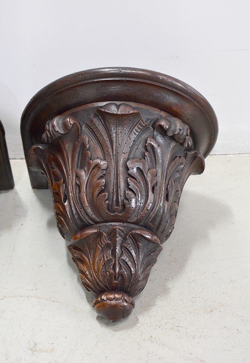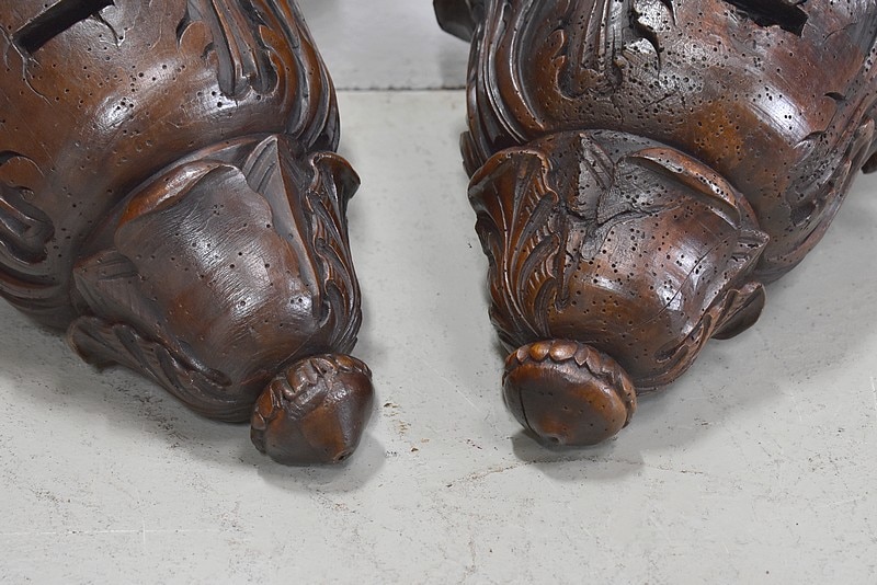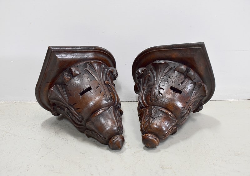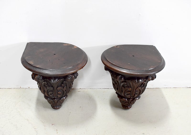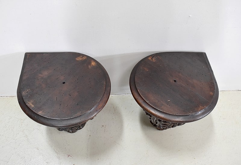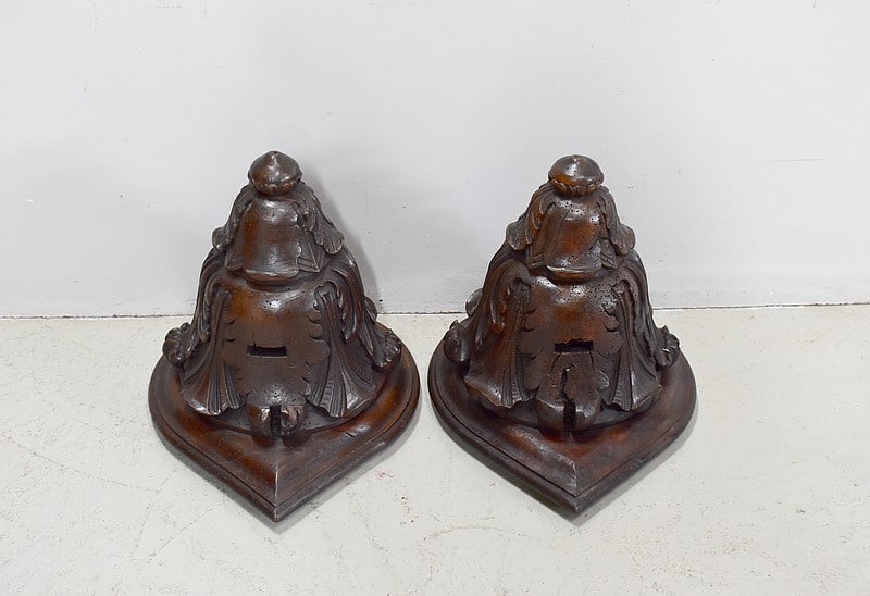Paire de sellettes d’angles dans le goût Renaissance en Noyer sculpté.