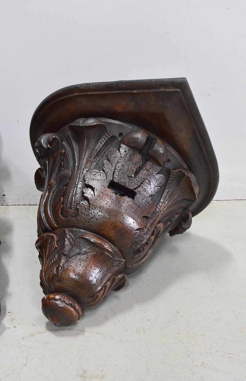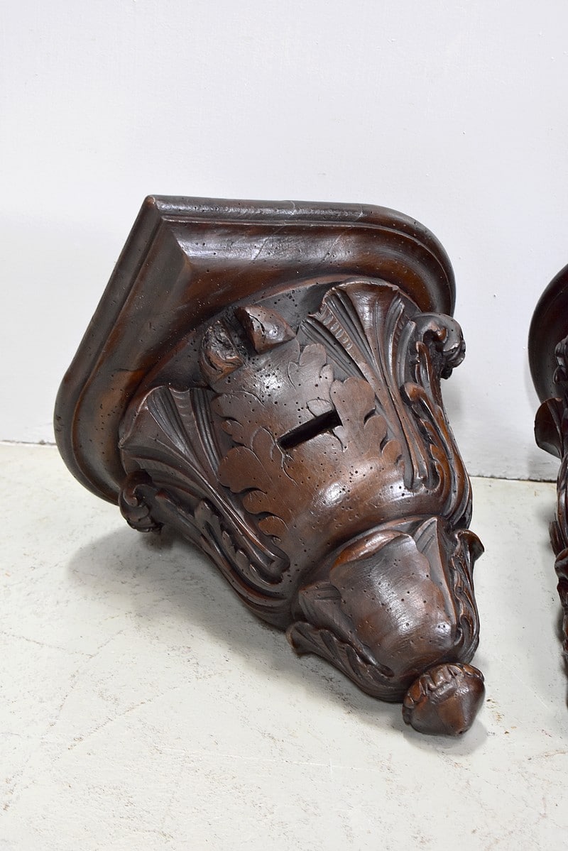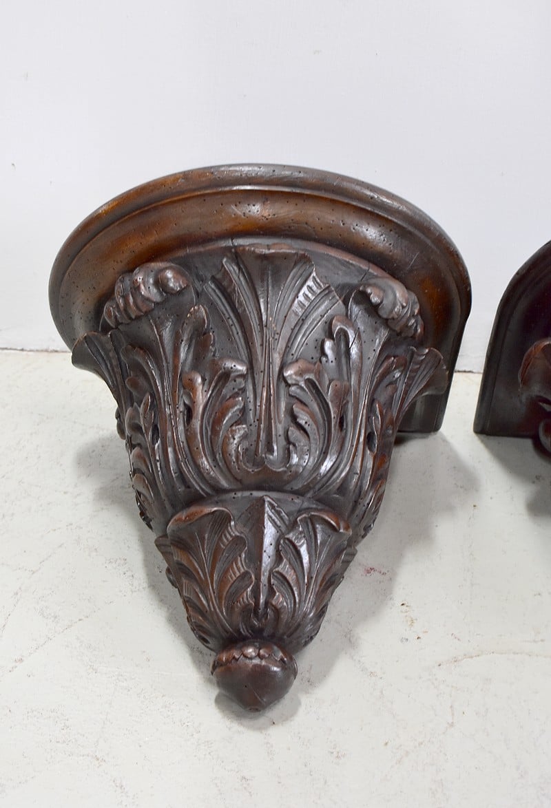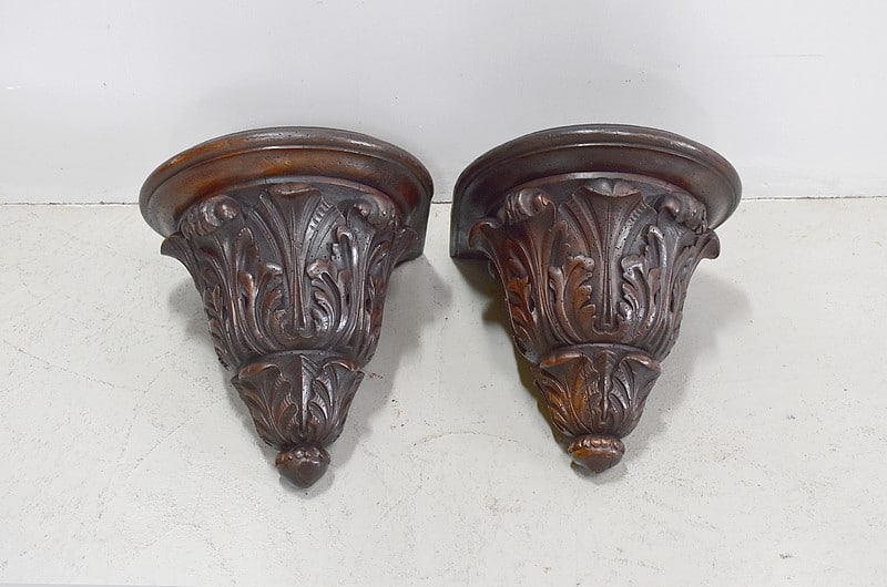 Paire de sellettes d’angles dans le goût Renaissance en Noyer sculpté.
