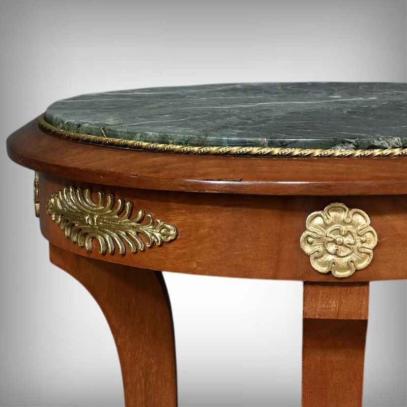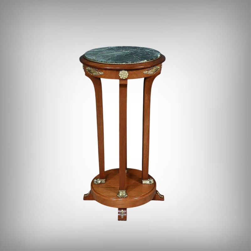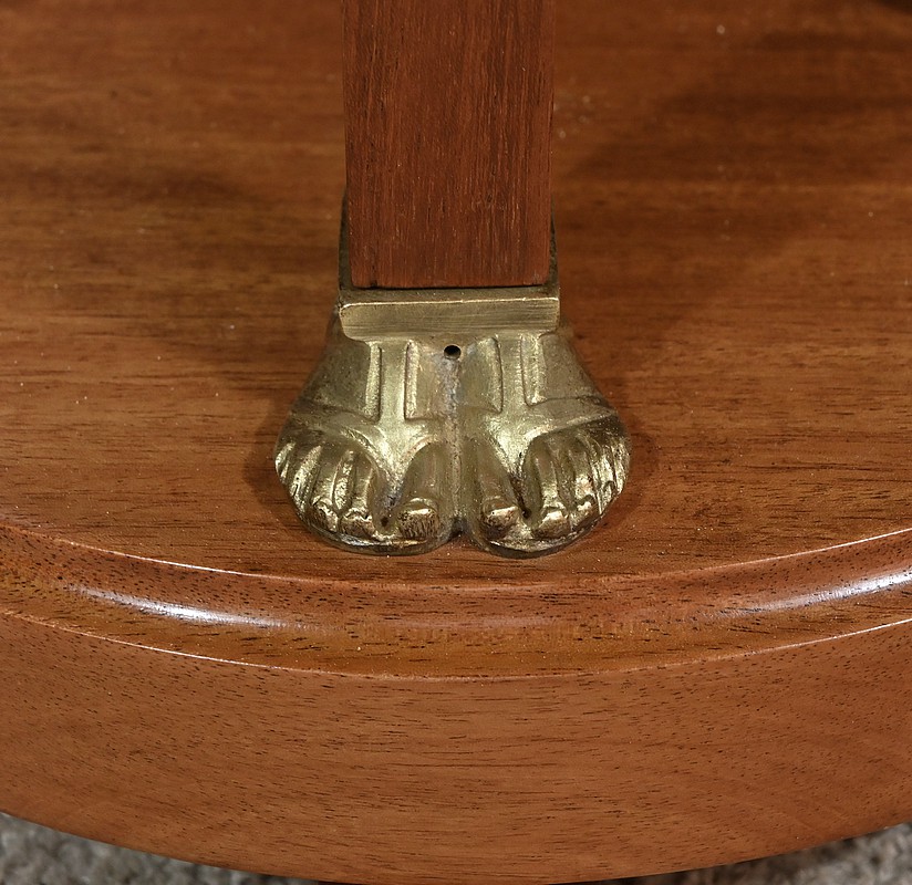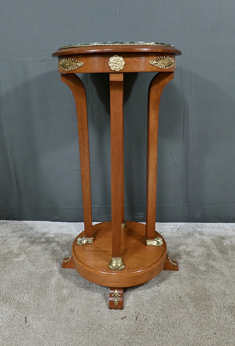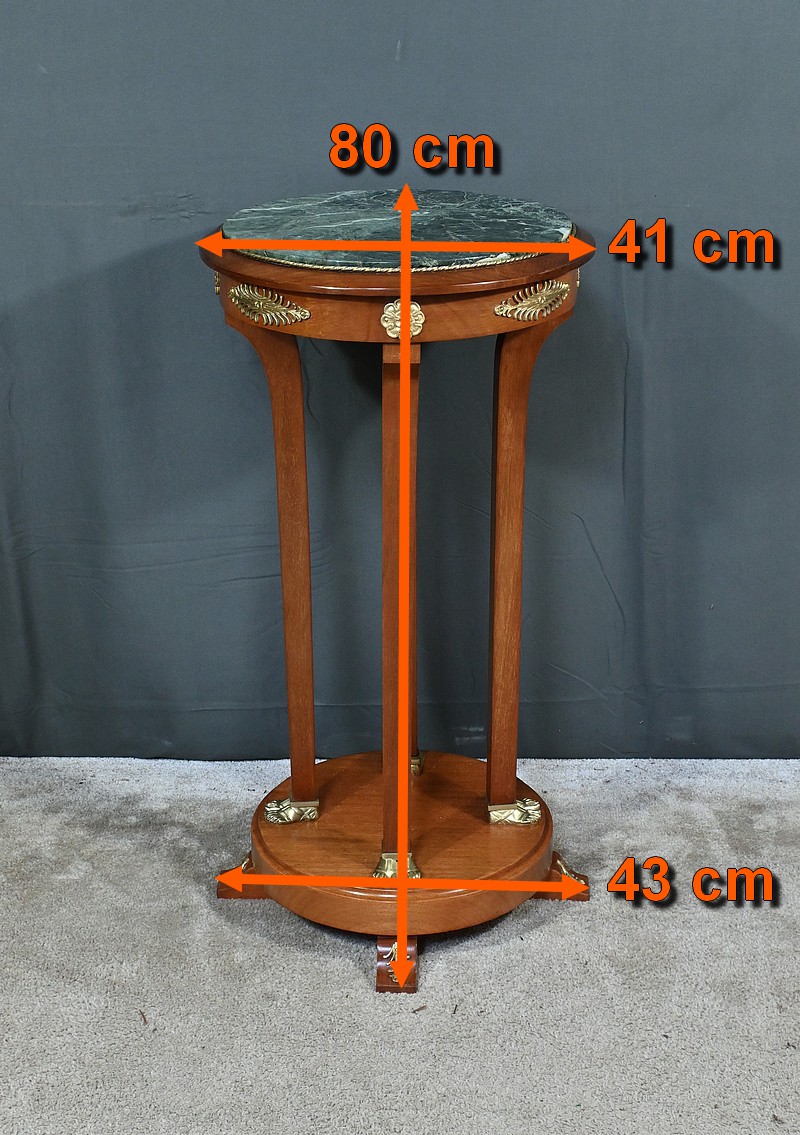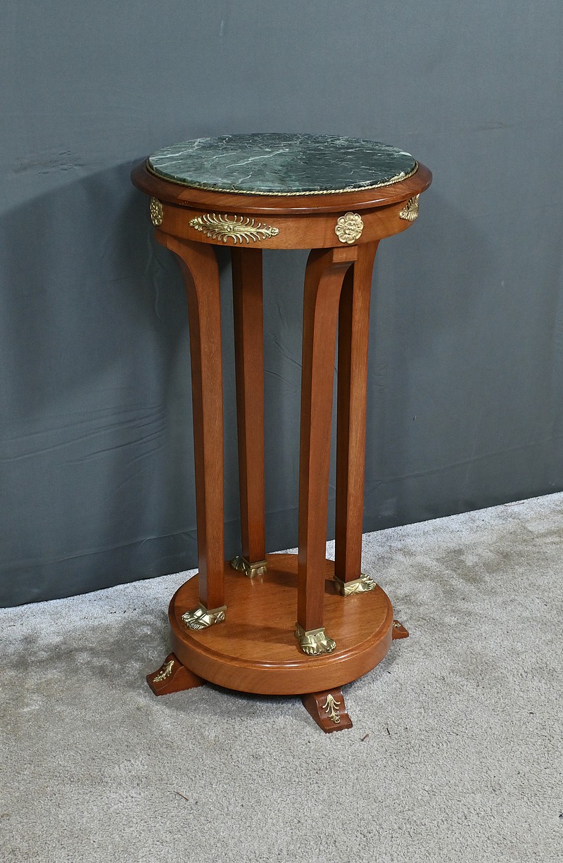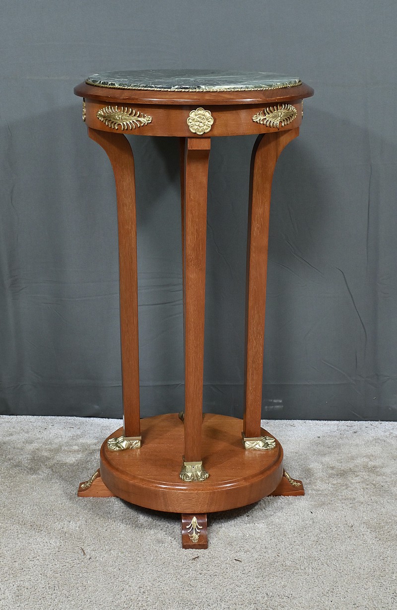 Conçue au début du XXe siècle, cette élégante sellette en acajou incarne le charme et le raffinement du style Retour d’Égypte. Elle présente un plateau circulaire en marbre vert de mer, offrant une surface lisse et luxueuse pour exposer vos objets décoratifs préférés. Ce plateau est ceint d’un cordon ouvragé perlé en bronze doré. La ceinture est décorée de garnitures figurant des palmettes et des fleurettes. Cette sellette repose sur quatre montants quadrangulaires, se terminant par des pieds dorés, joints par un socle rond en plinthe Le socle est maintenu par des pieds convexes décorés de palmettes. Cette sellette est idéale pour ajouter une touche de prestige à votre salon, votre bureau ou toute autre pièce de votre maison.