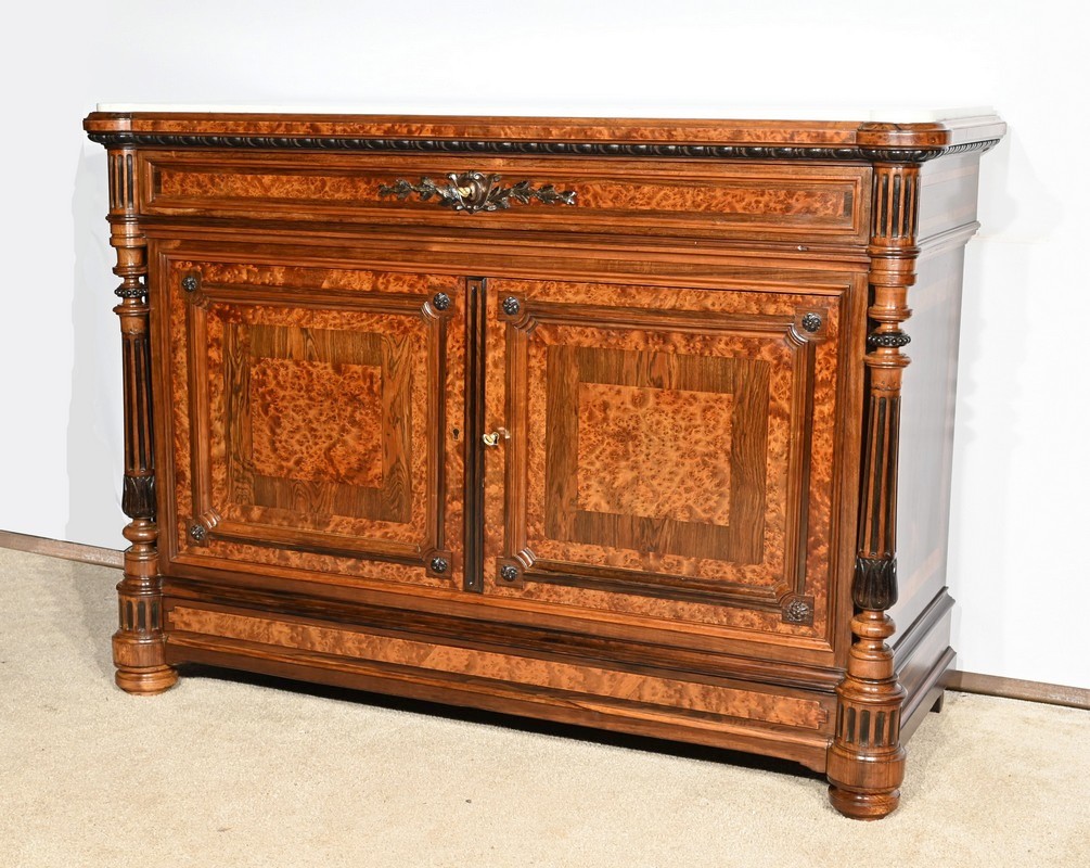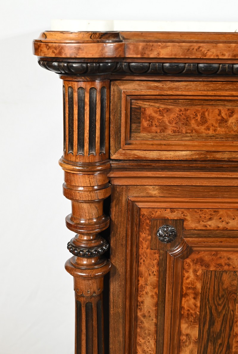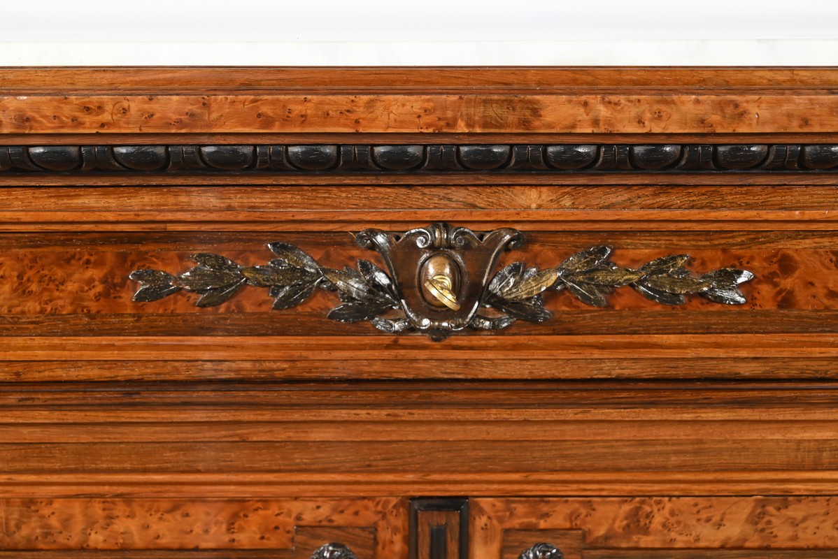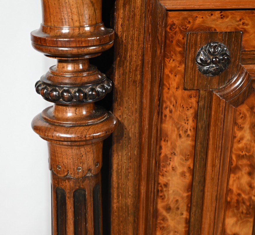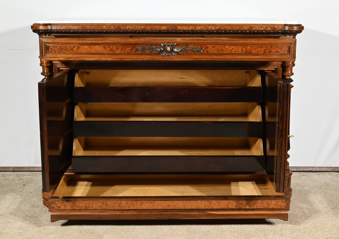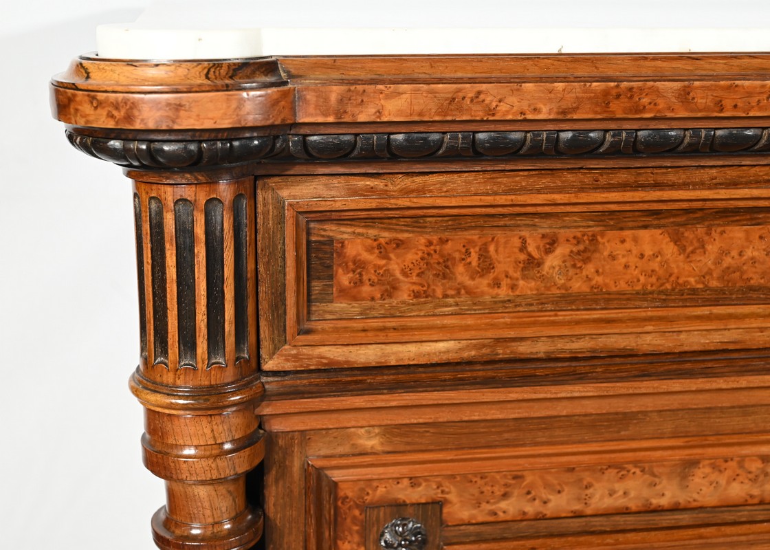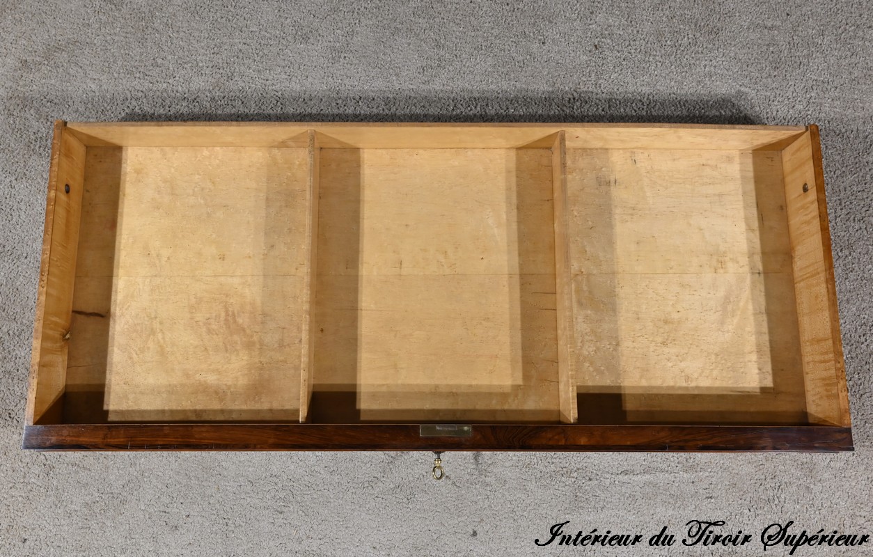 Ce meuble de fabrication parisienne ouvre en ceinture par un grand tiroir en loupe d’amboine souligné par une baguette à gorge et une bande de palissandre.