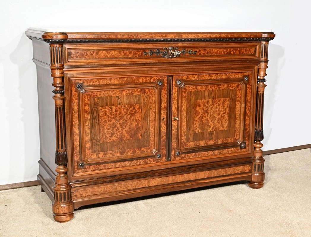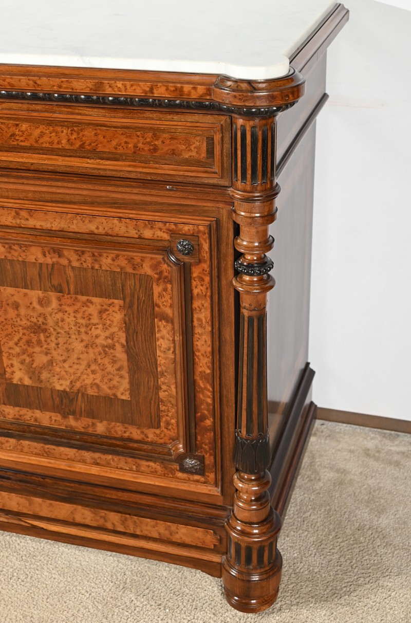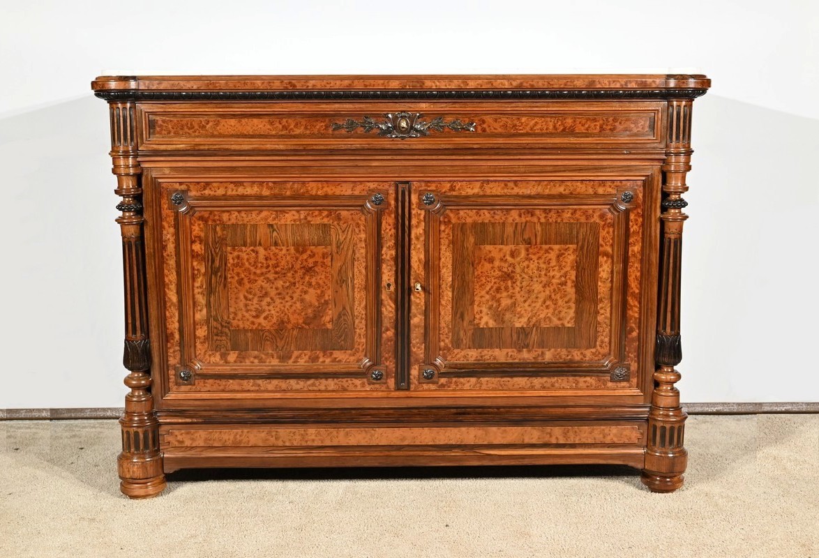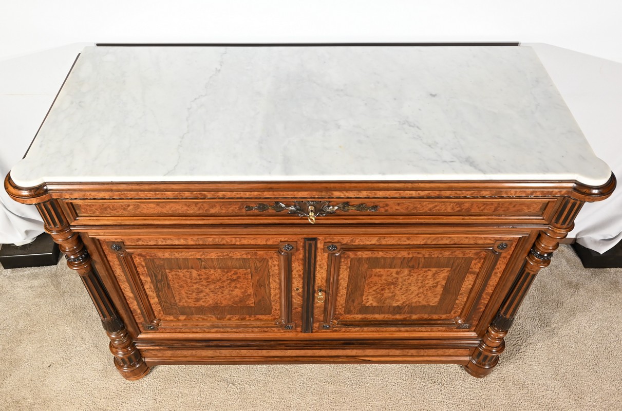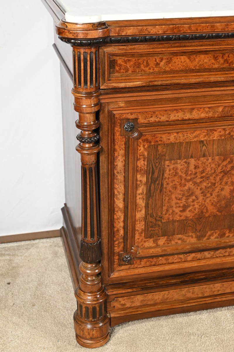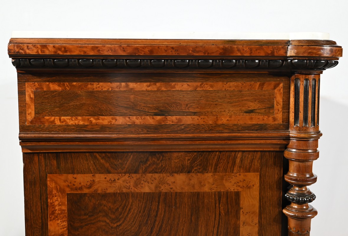 Ce meuble de fabrication parisienne ouvre en ceinture par un grand tiroir en loupe d’amboine souligné par une baguette à gorge et une bande de palissandre.