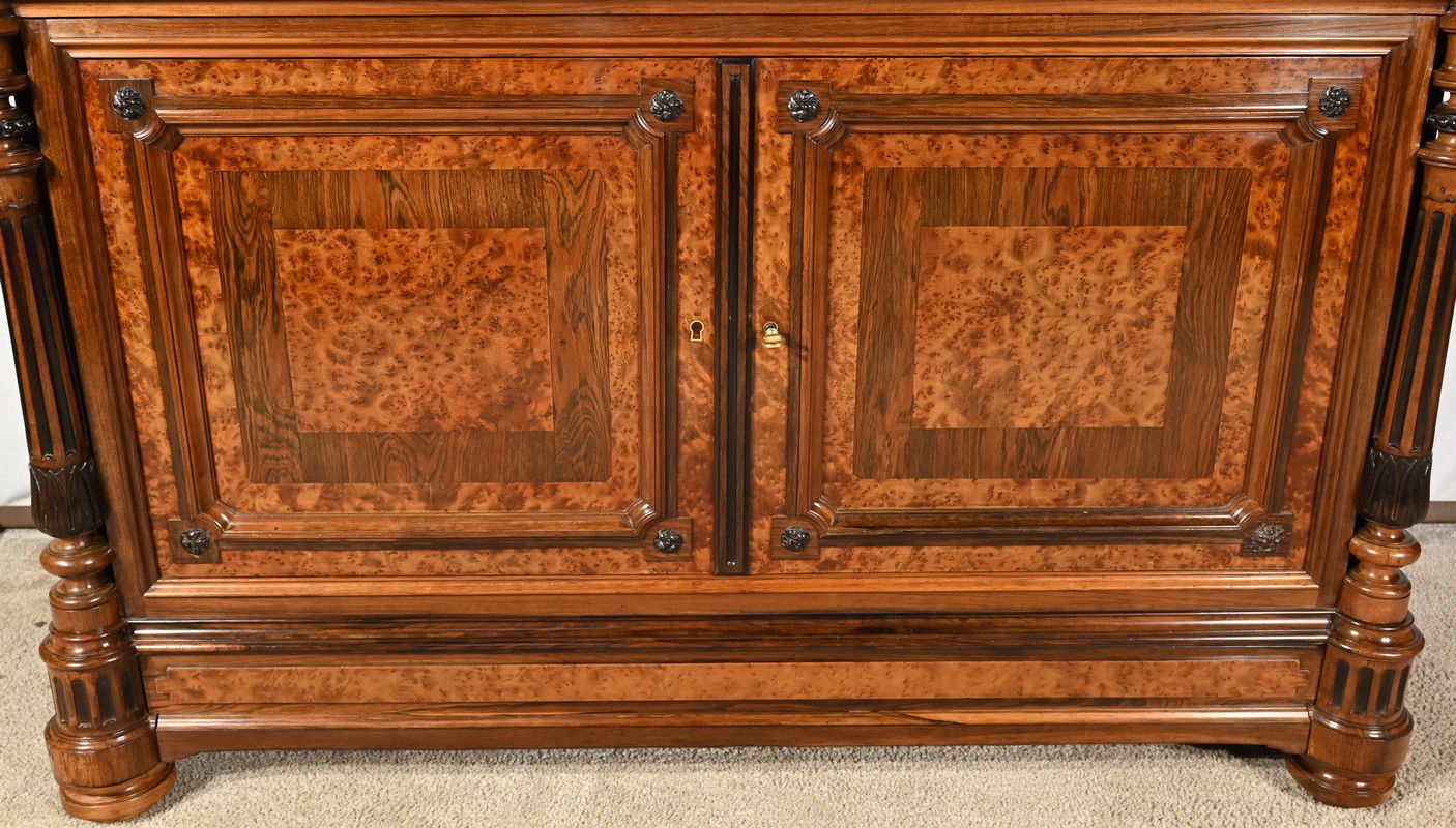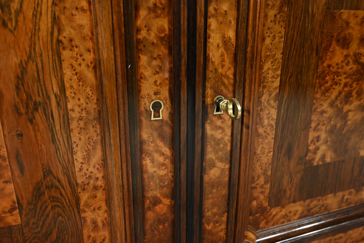 La partie basse présente une double porte en placage d’amboine, avec panneaux centraux, également mise en valeur par une bande de palissandre, de baguettes moulurées et de rosaces.