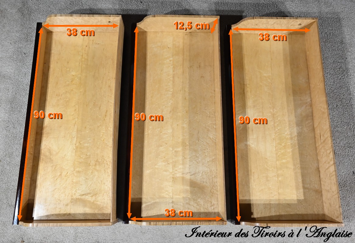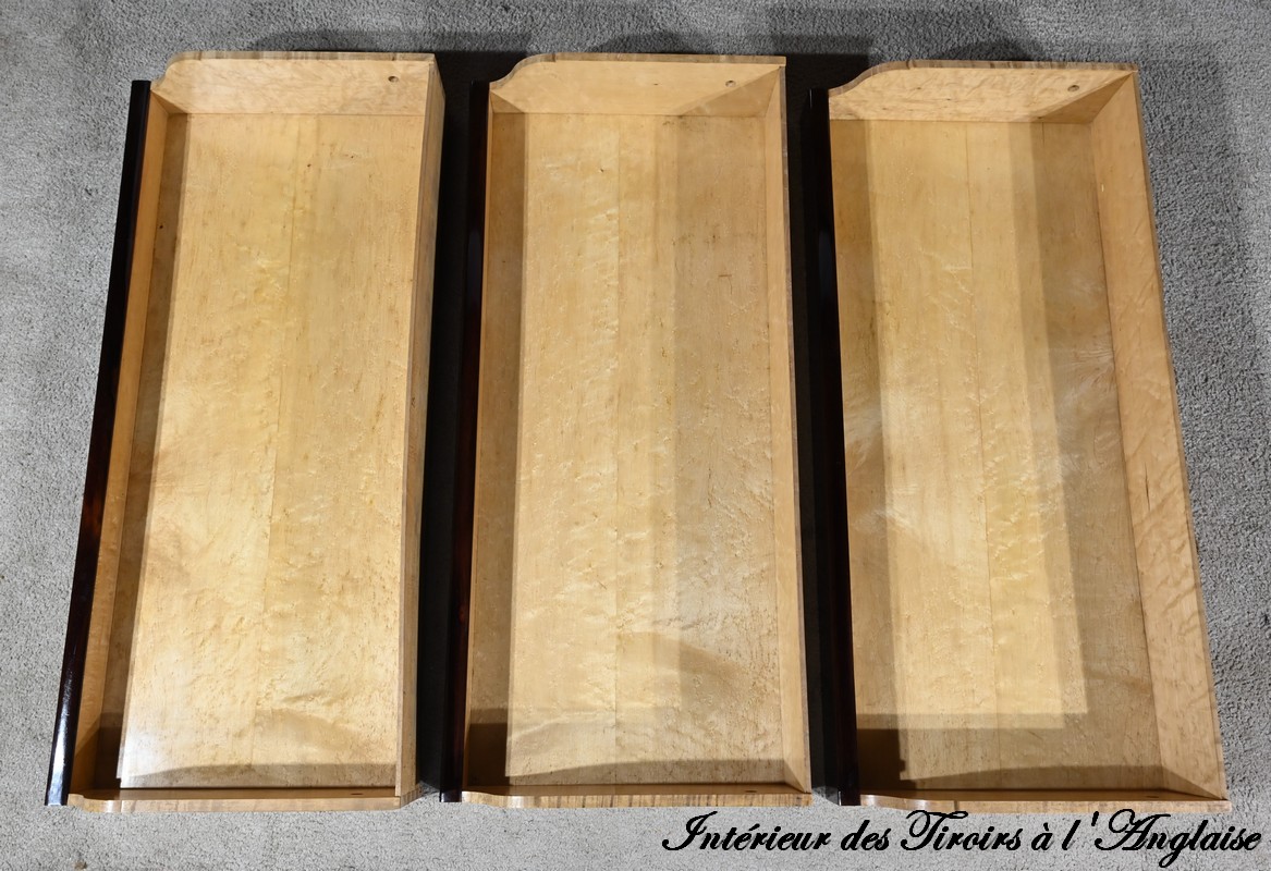 L’intérieur offre trois tiroirs à l’anglaise en moucheté d’érable avec façade en palissandre.