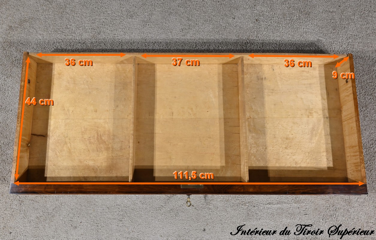 Ce tiroir est muni d’une serrure d’origine avec clé postérieure et motif d’entrée en applique à décor de feuillage.