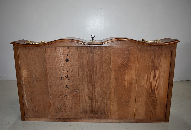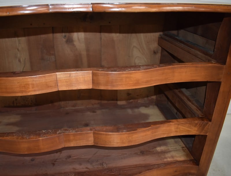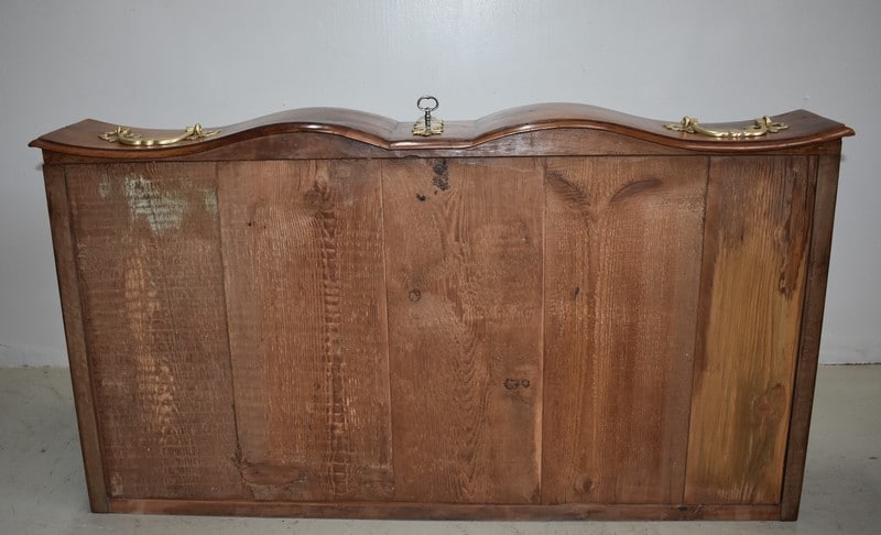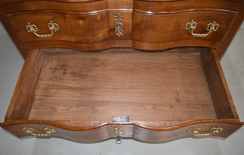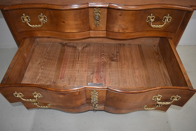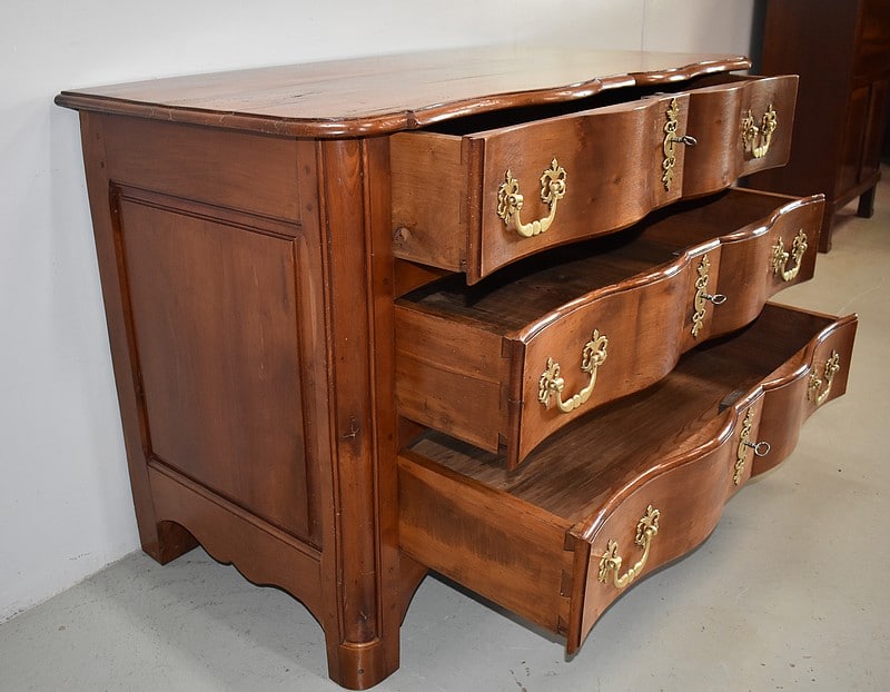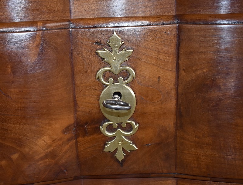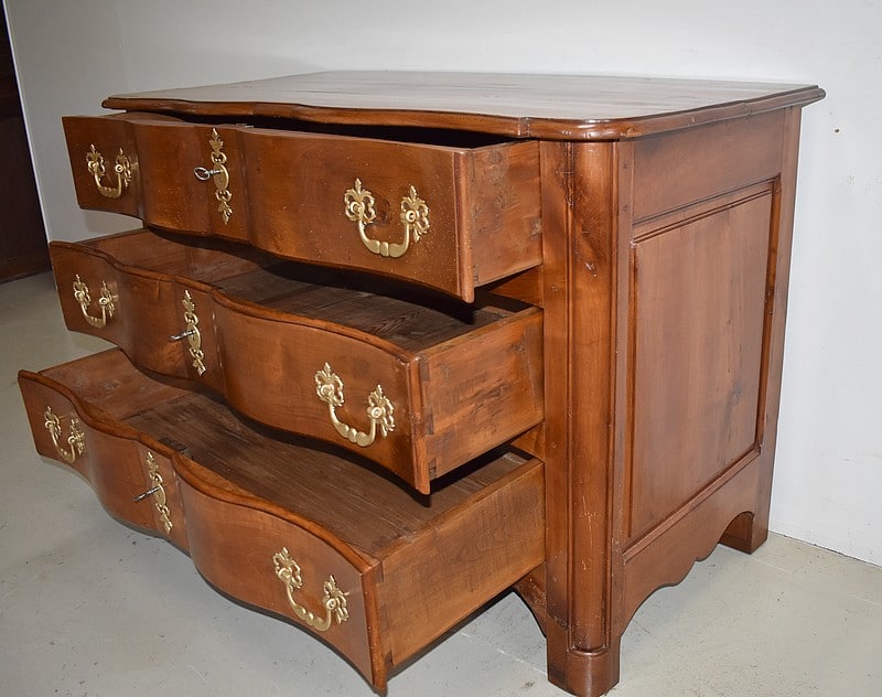 Commode Arbalète Louis XIV en bois fruitiers (merisier et noyer) ouvrant à 3 tiroirs ornés de poignées de tirage et d’entrées de serrures en bronze, d’origine.
