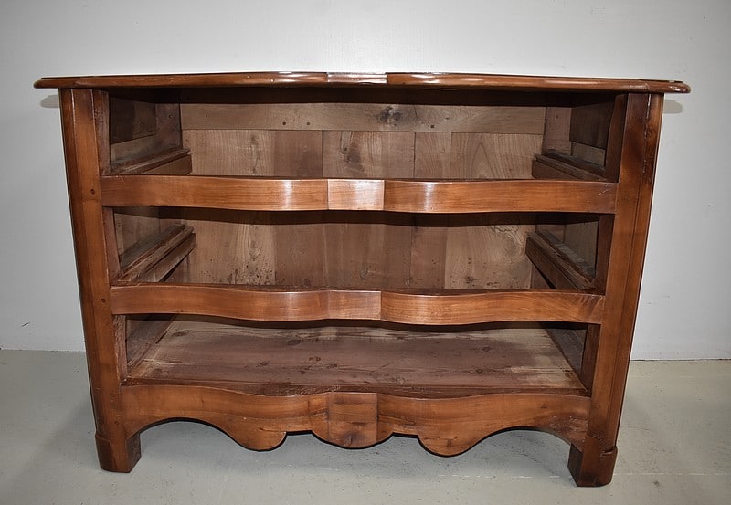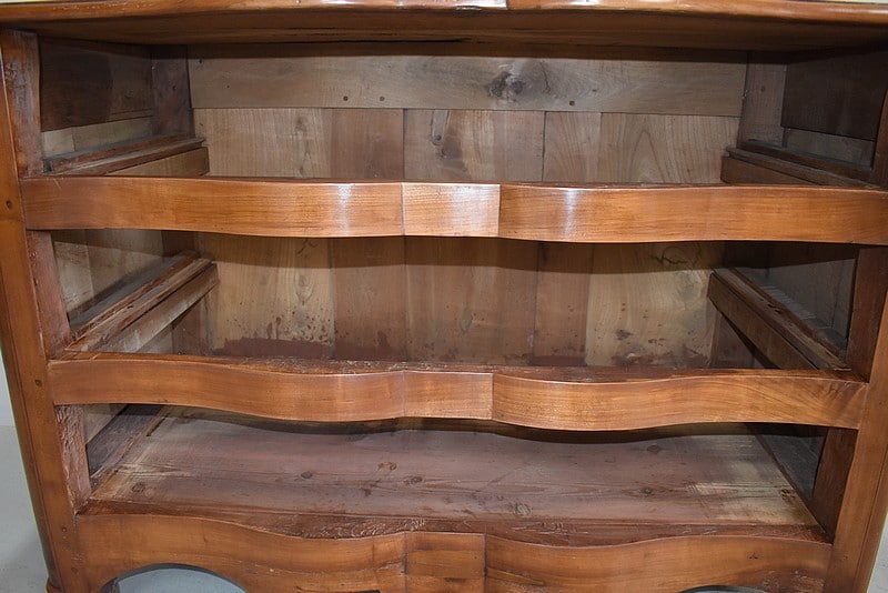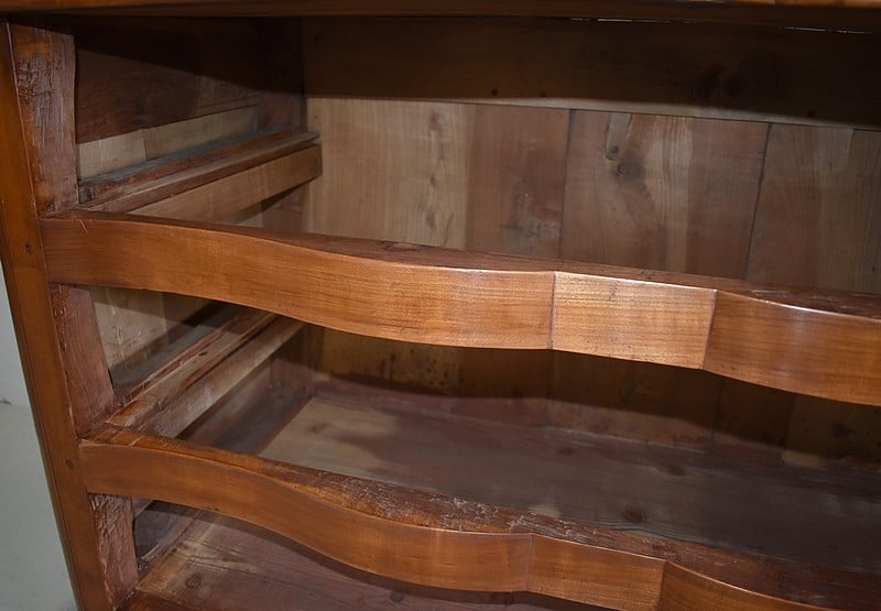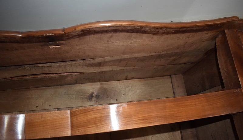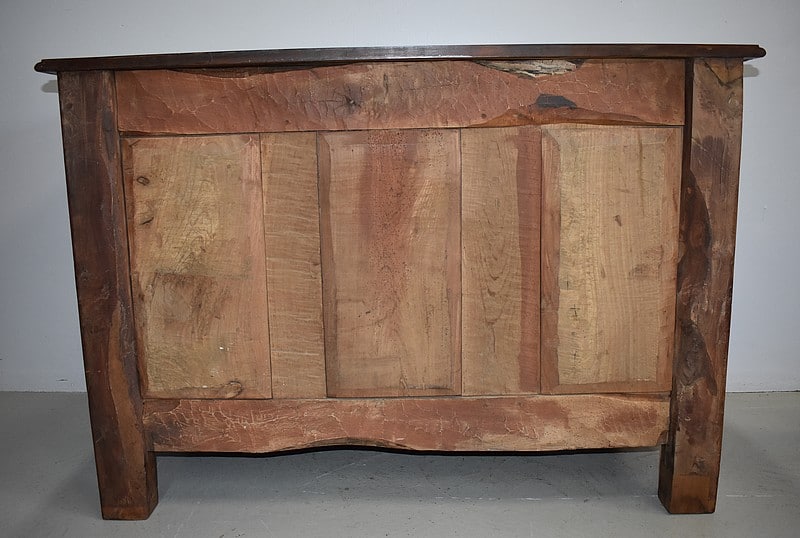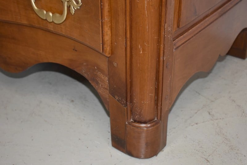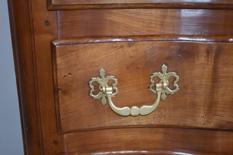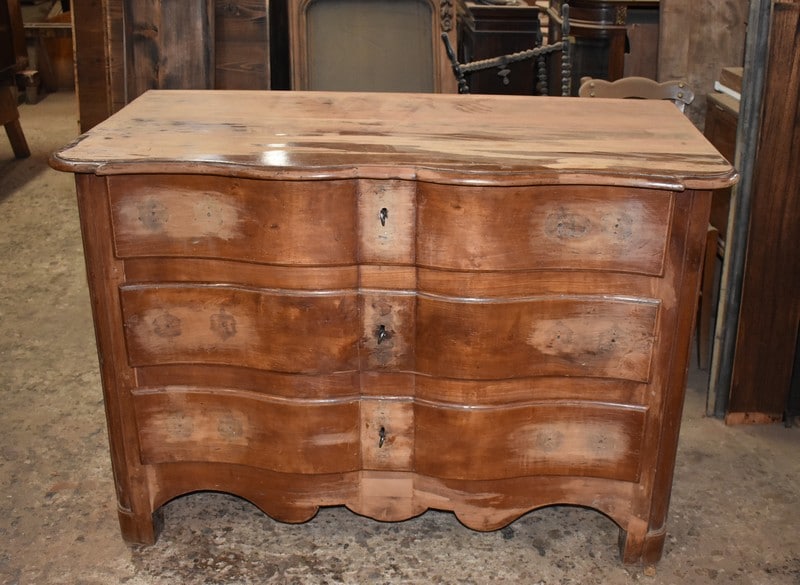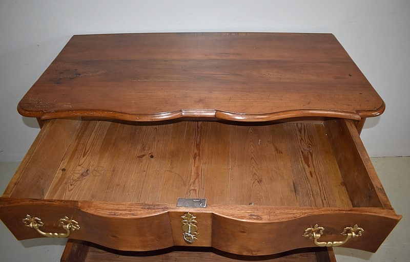 Commode Arbalète Louis XIV en bois fruitiers (merisier et noyer) ouvrant à 3 tiroirs ornés de poignées de tirage et d’entrées de serrures en bronze, d’origine.