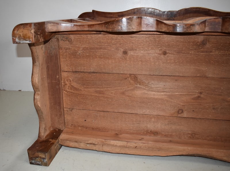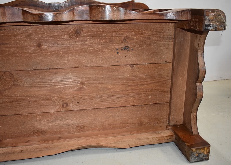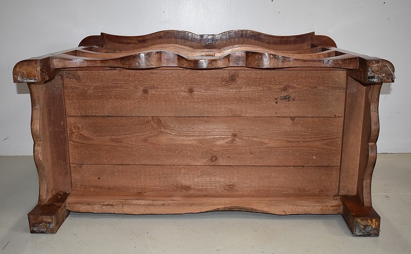 Traverse basse et côtés chantournés. Elle repose sur des pieds avants à défoncement et des pieds arrières droits.