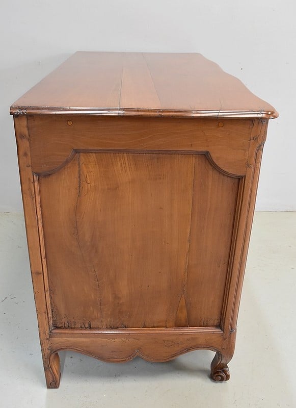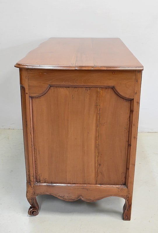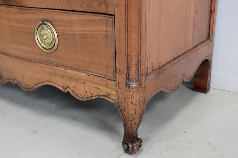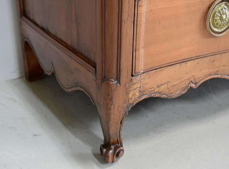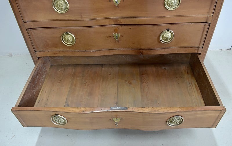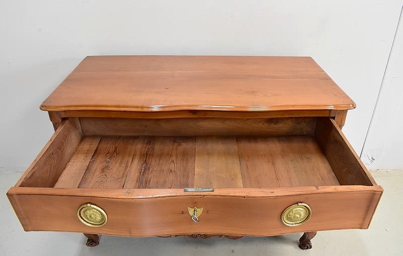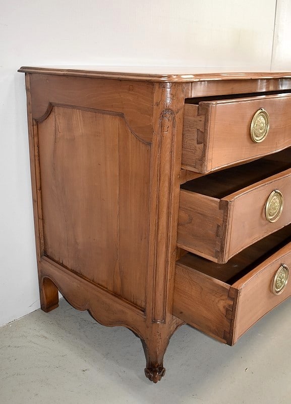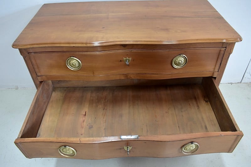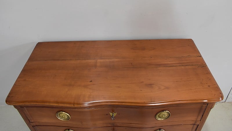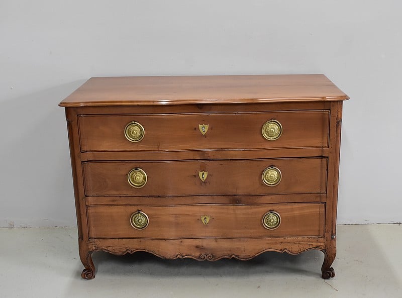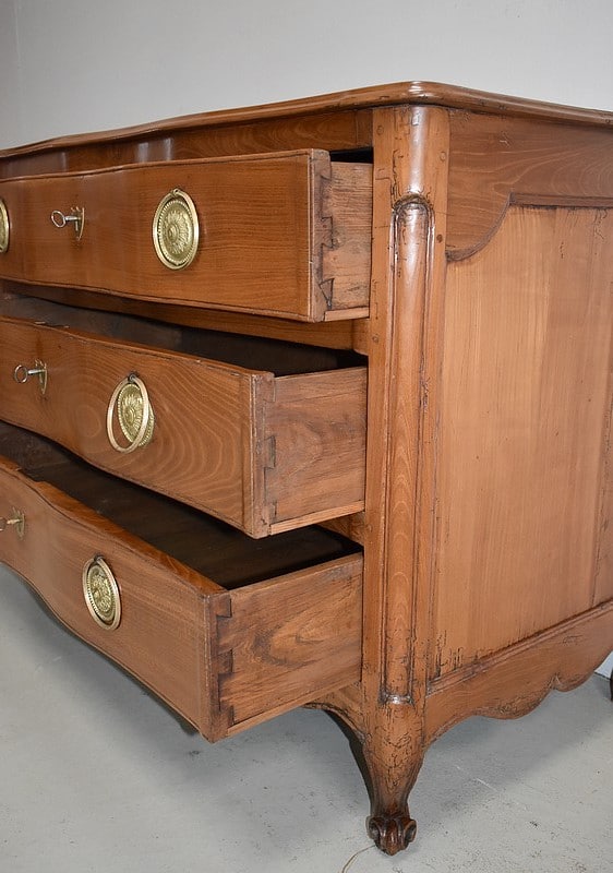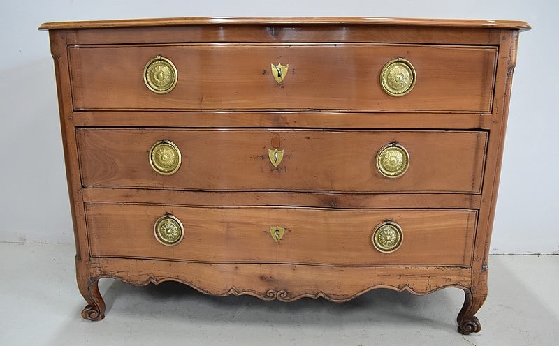 Commode Louis XV en merisier blond, façade arbalète, ouvrant à 3 tiroirs ornés d’anneaux de tirage avec macarons en bronze – ceux du troisième tiroir sensiblement plus petits – Entrées de serrures écusson. Serrures et clés en état de fonctionnement.