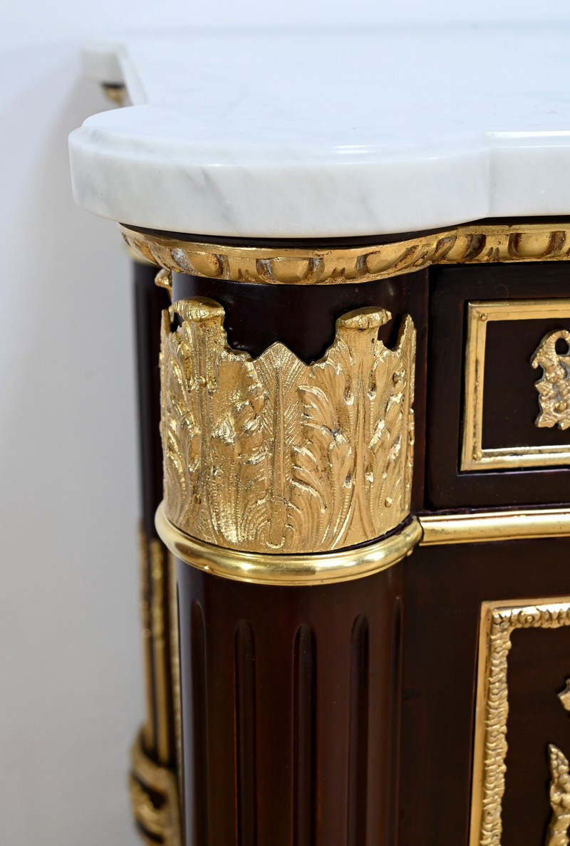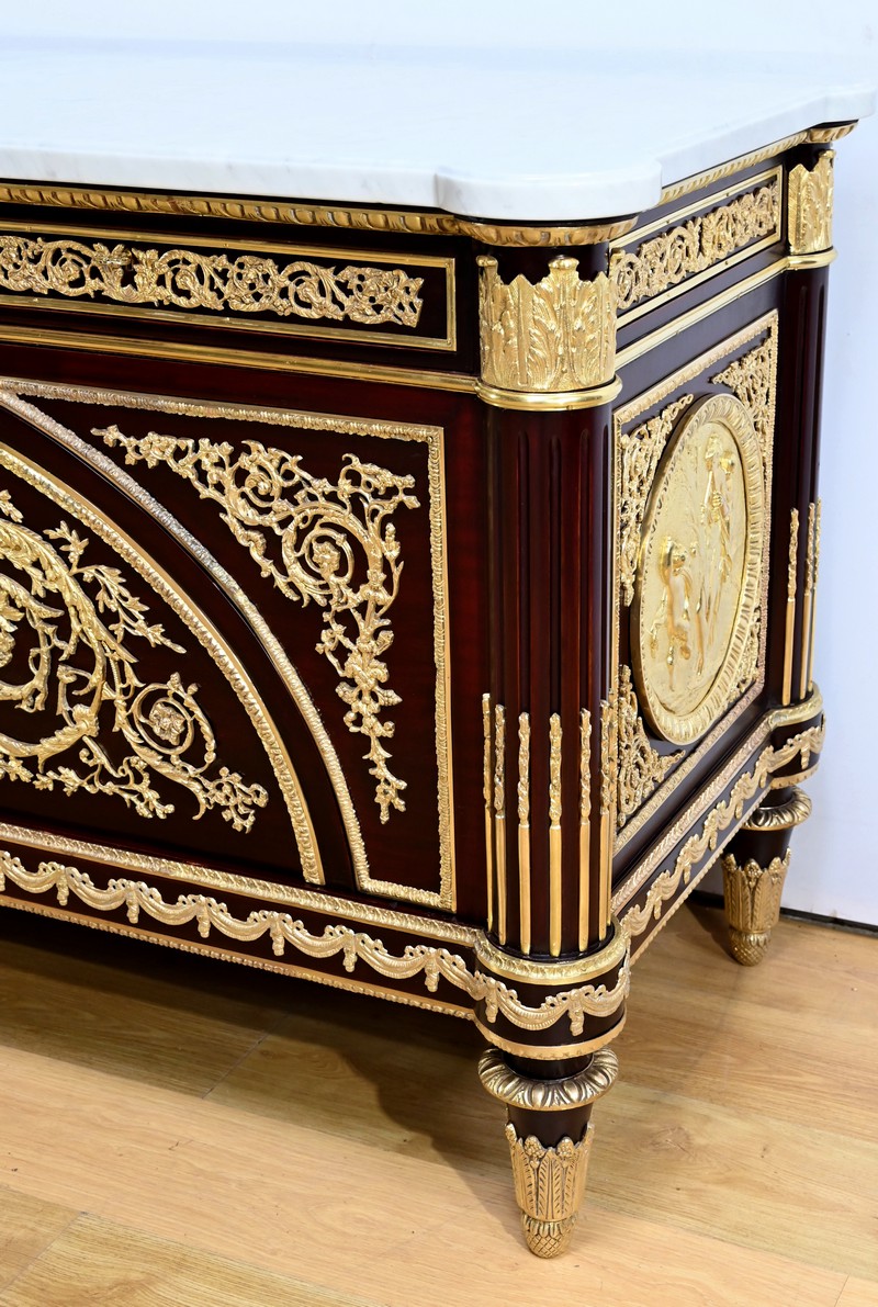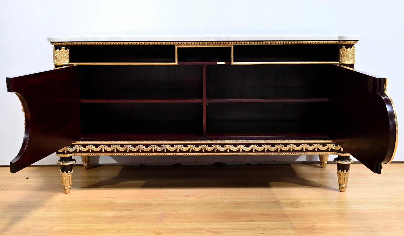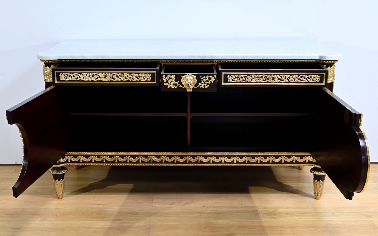 L’ensemble est coiffé d’un marbre de carrare épais suivant les lignes du meuble et bordé par une frise d’oves.