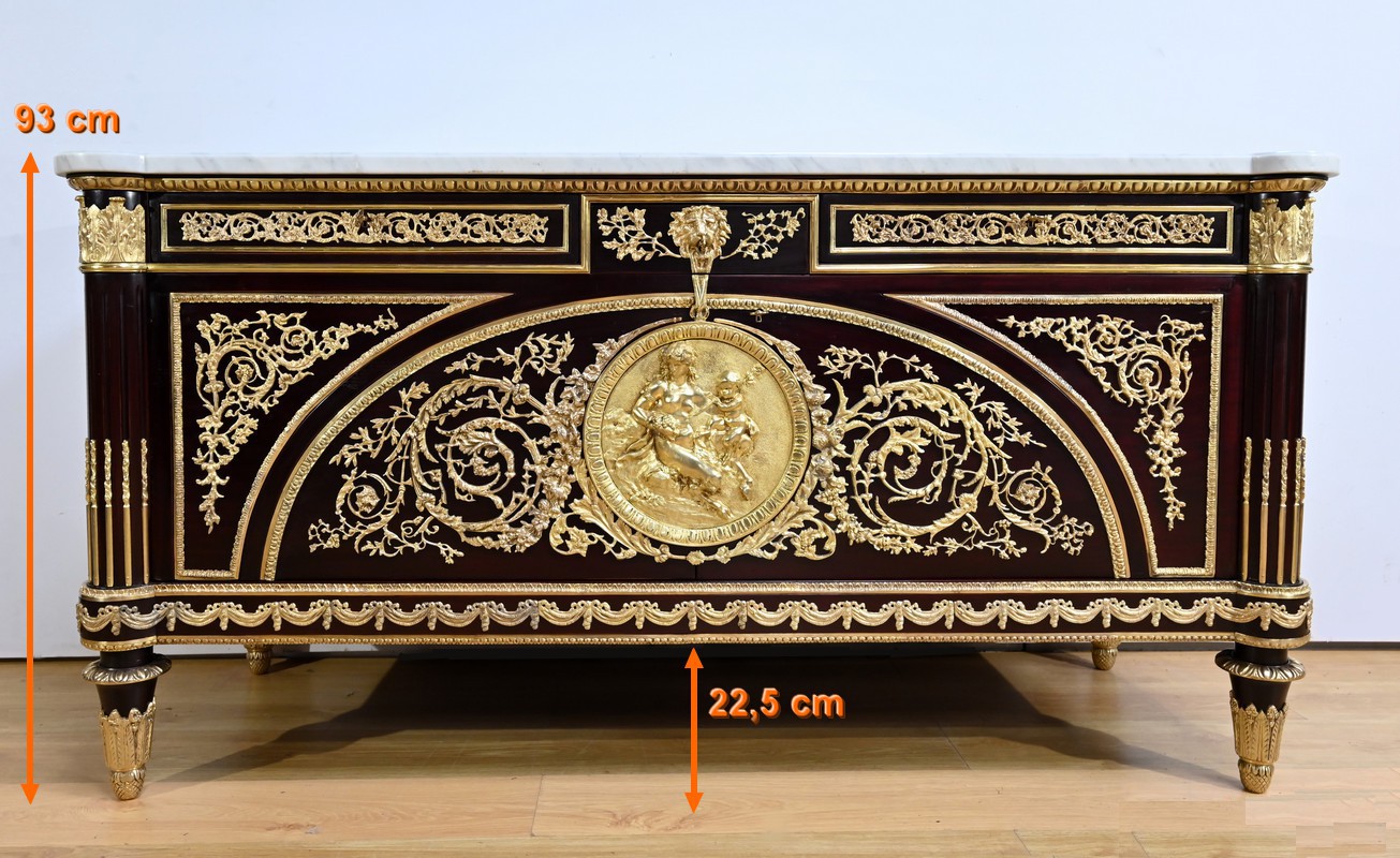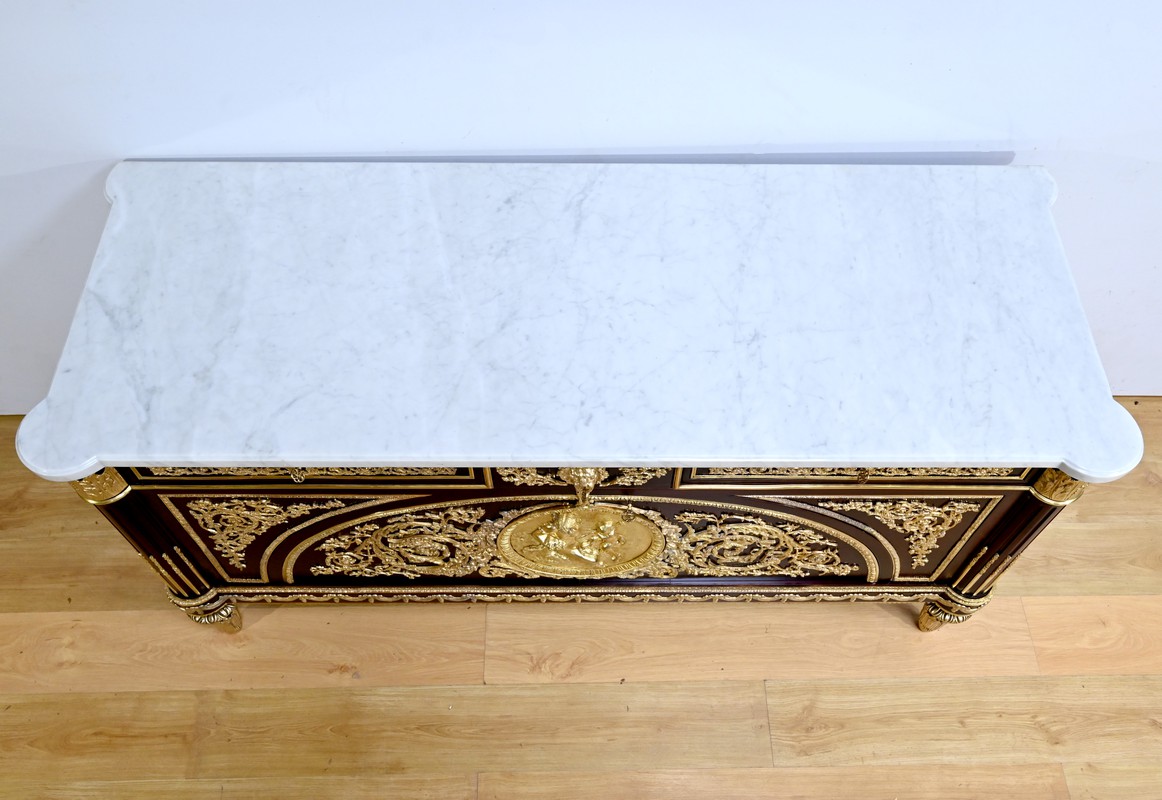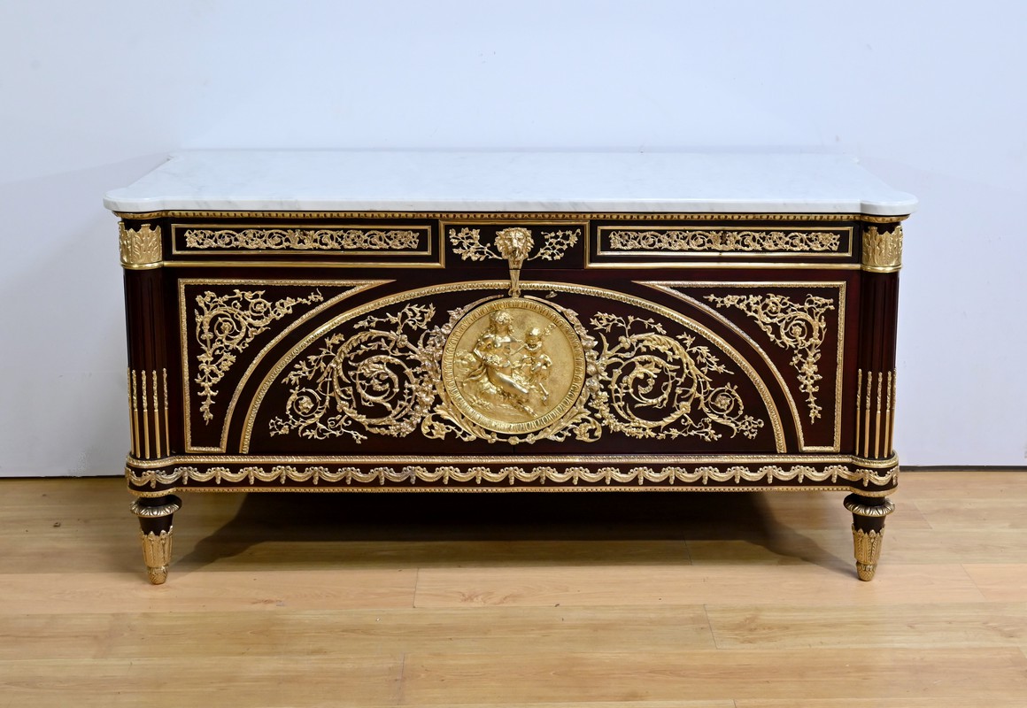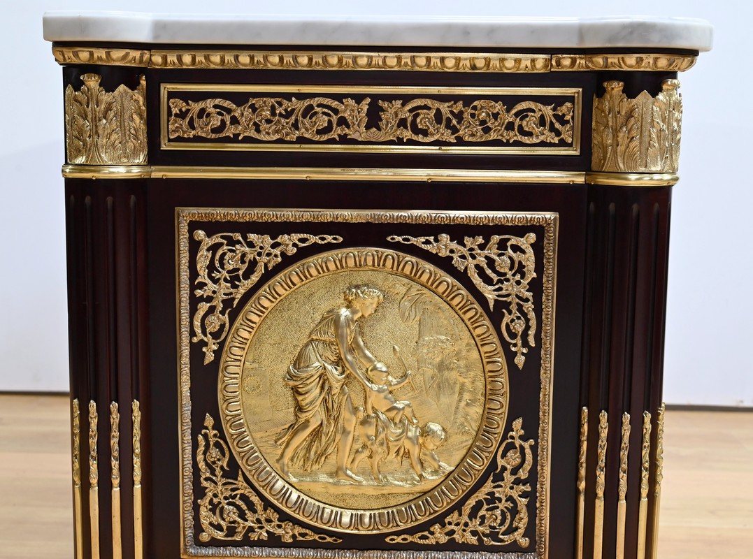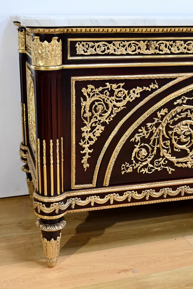 L’ensemble est coiffé d’un marbre de carrare épais suivant les lignes du meuble et bordé par une frise d’oves.