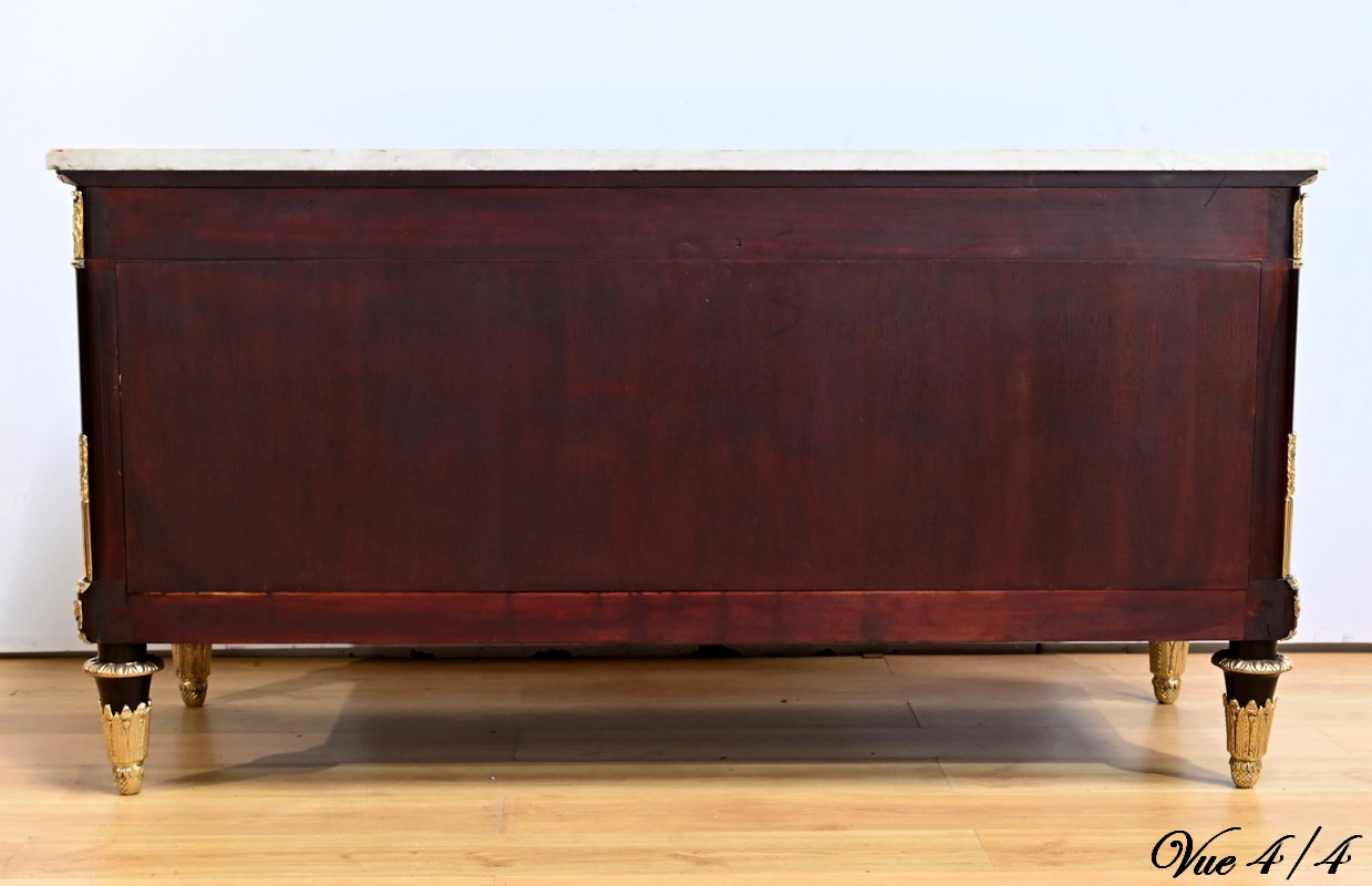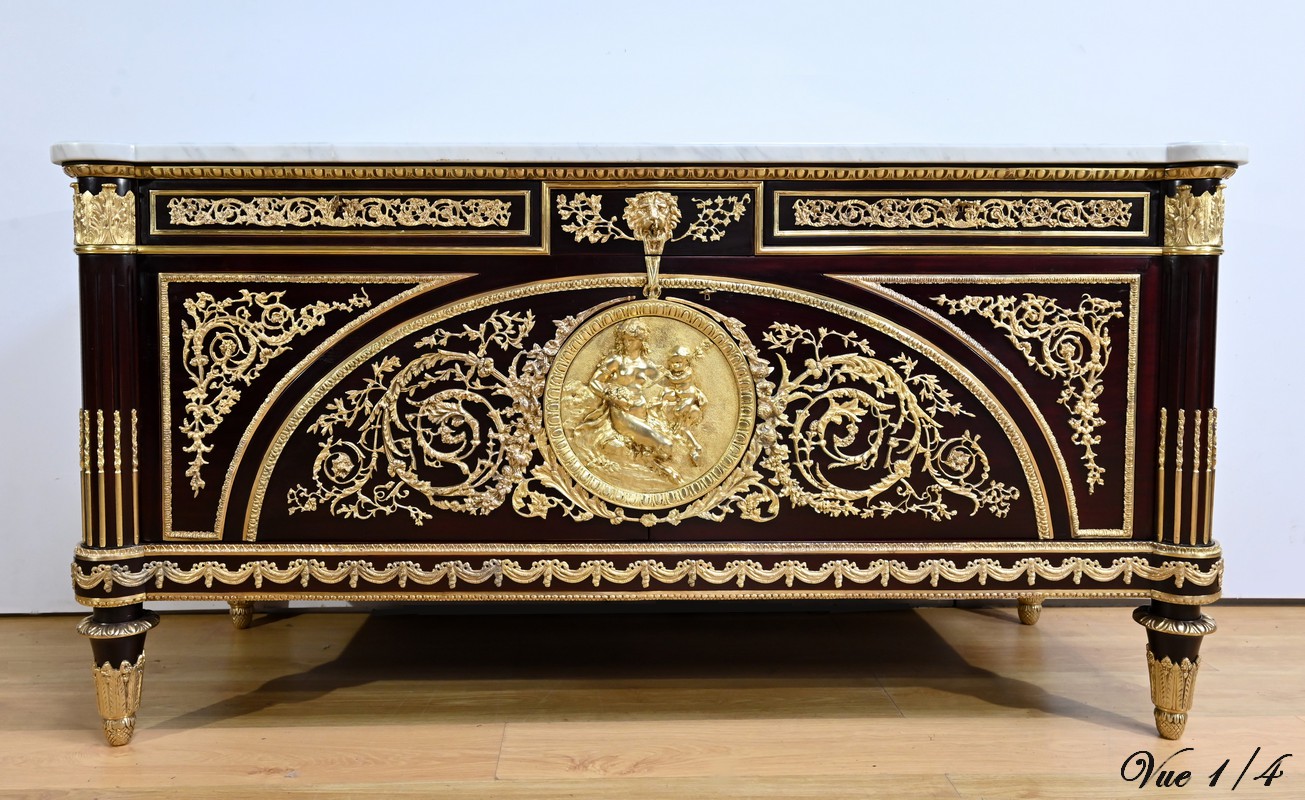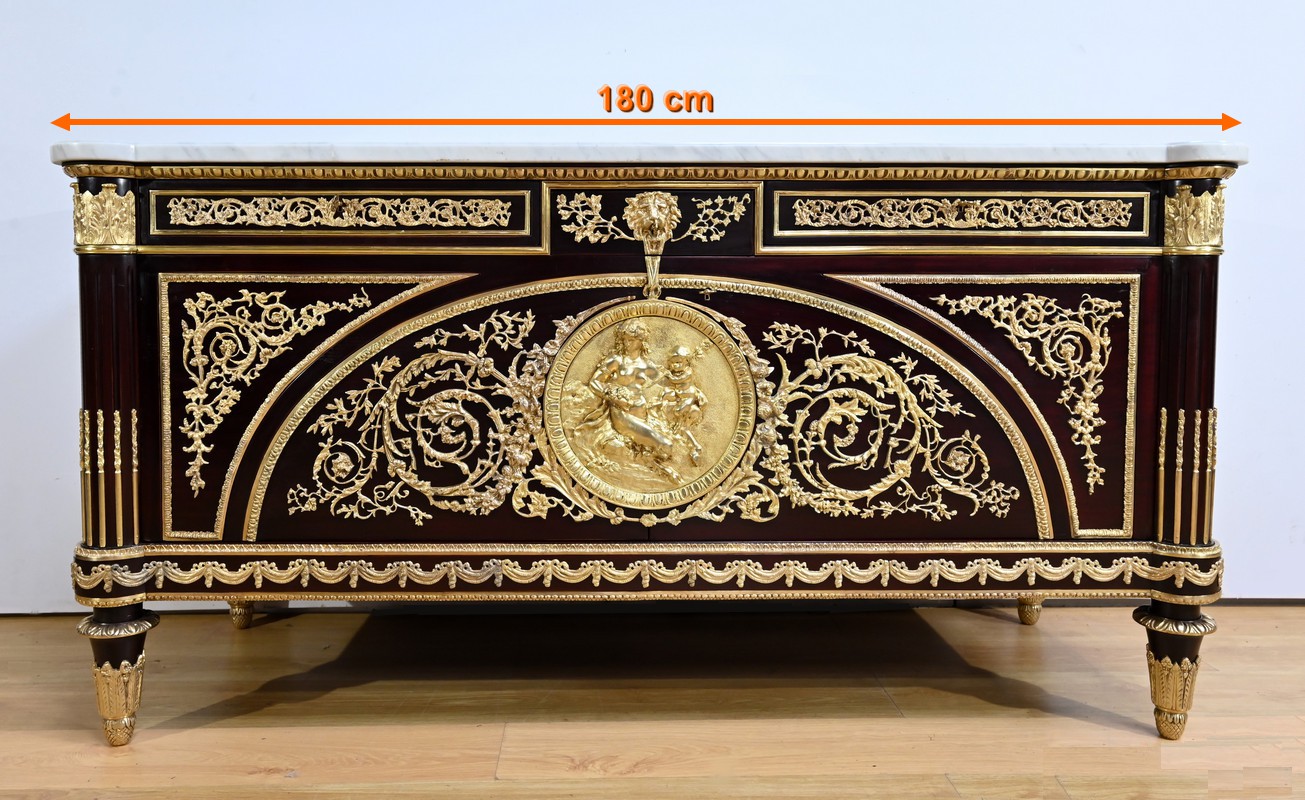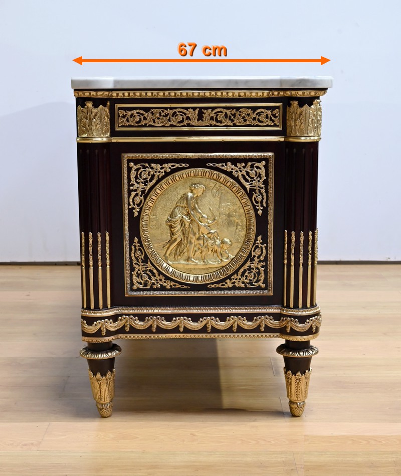 L’ensemble est coiffé d’un marbre de carrare épais suivant les lignes du meuble et bordé par une frise d’oves.