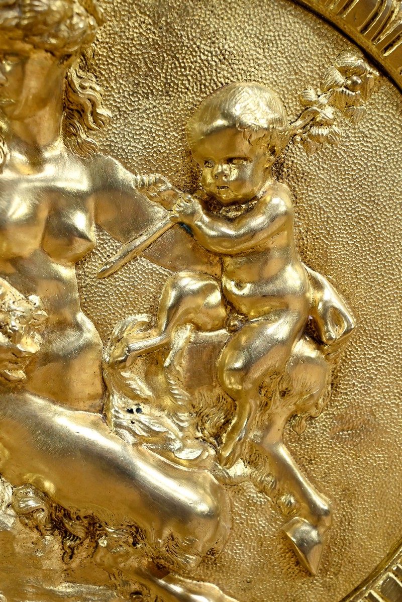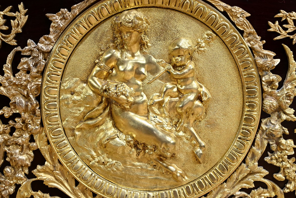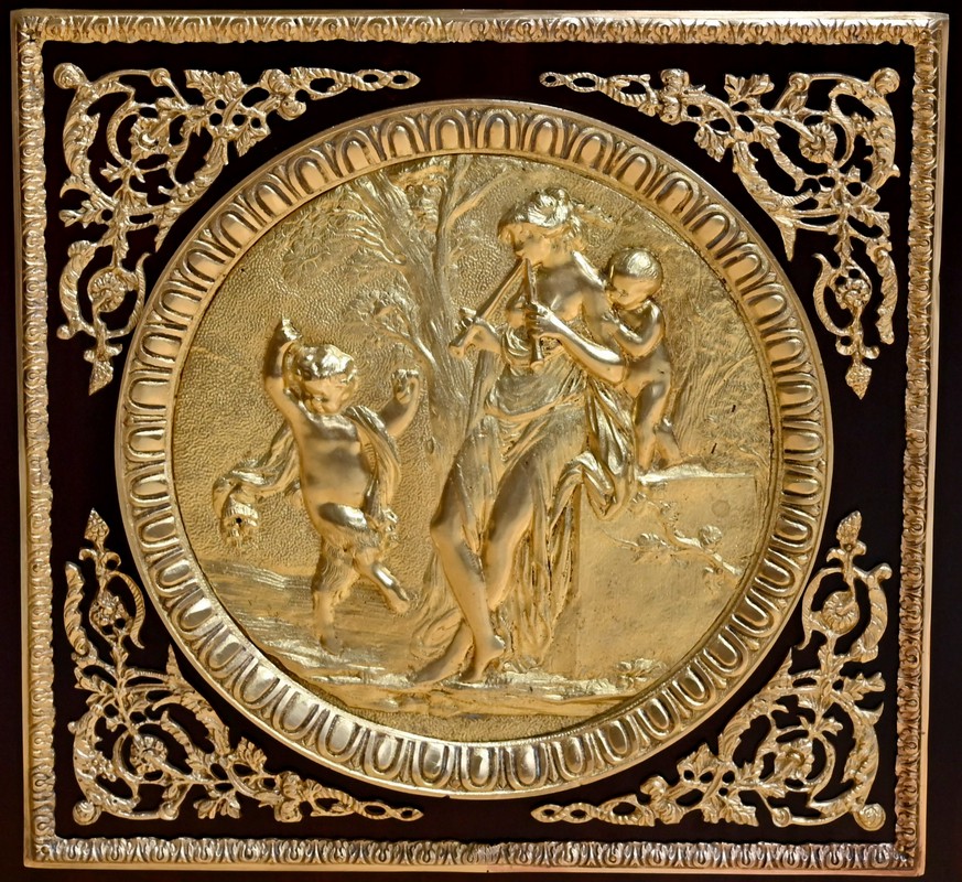 Les côtés sont ouvragés dans le même esprit avec mascarons de scènes.