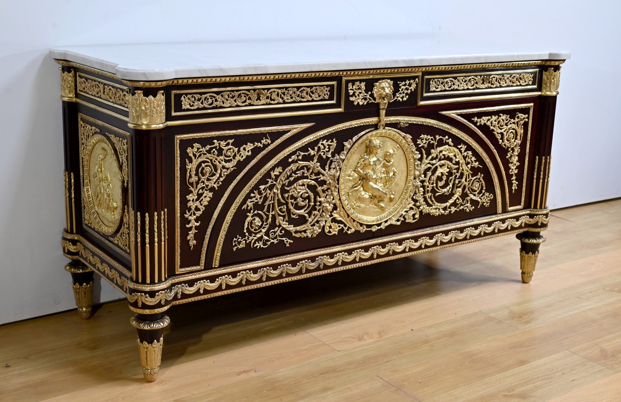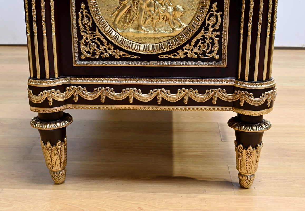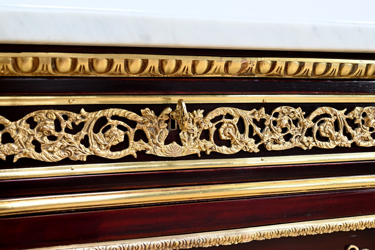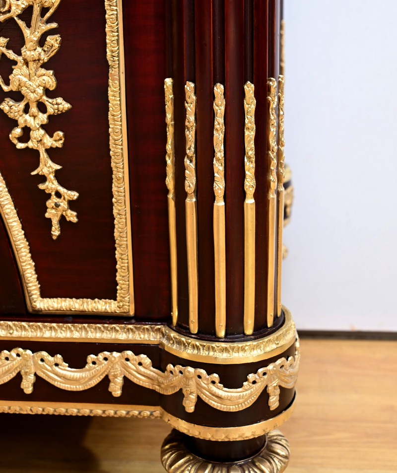 Les nombreuses heures d’ouvrage nécessaires à cette création, tant pour la partie ornement que pour la structure, révèlent un rendu époustouflant où la maitrise et l’art se sont liés pour donner naissance à cette commode Marie-Antoinette.