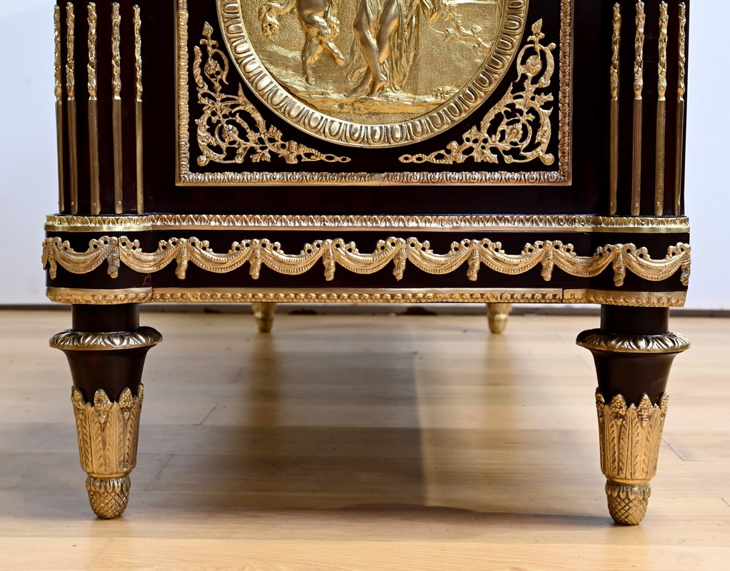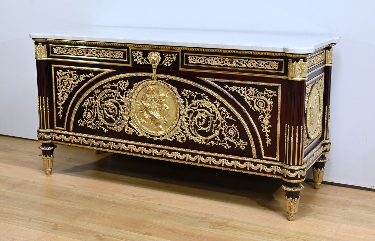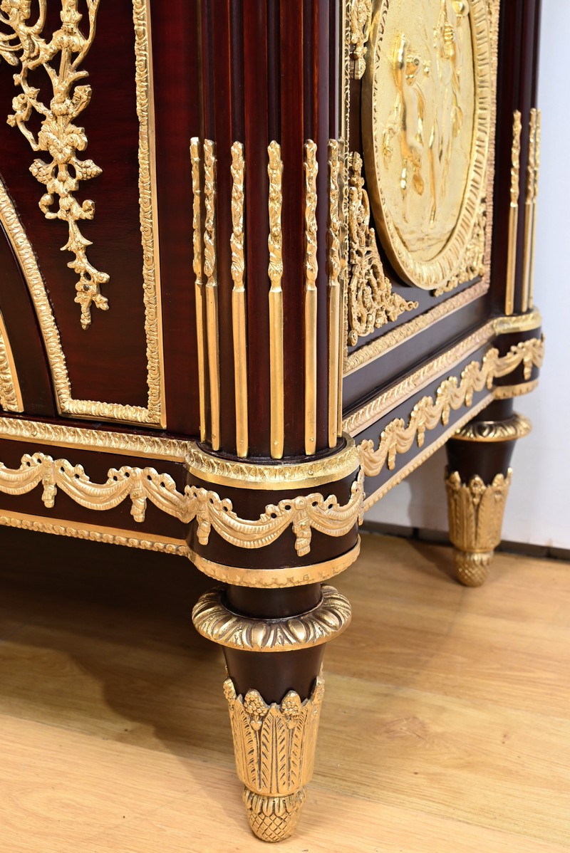 Les nombreuses heures d’ouvrage nécessaires à cette création, tant pour la partie ornement que pour la structure, révèlent un rendu époustouflant où la maitrise et l’art se sont liés pour donner naissance à cette commode Marie-Antoinette.