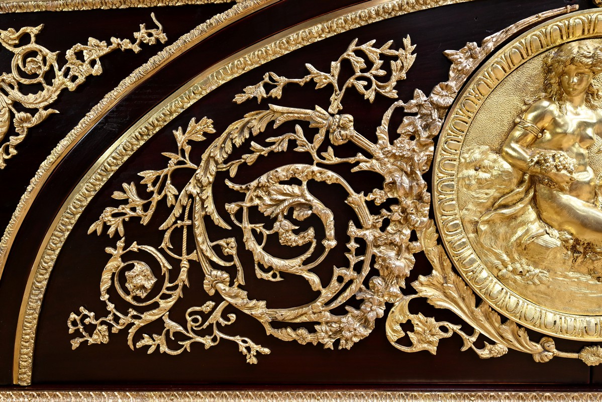 Cette commode ouvre par deux portes généreusement ornementées de bronzes dorés à décors de rinceaux, de frises et e feuilles d’acanthe.