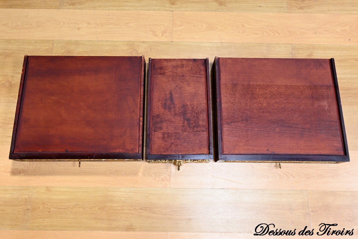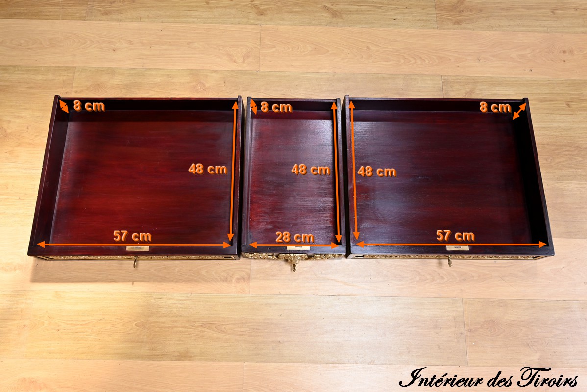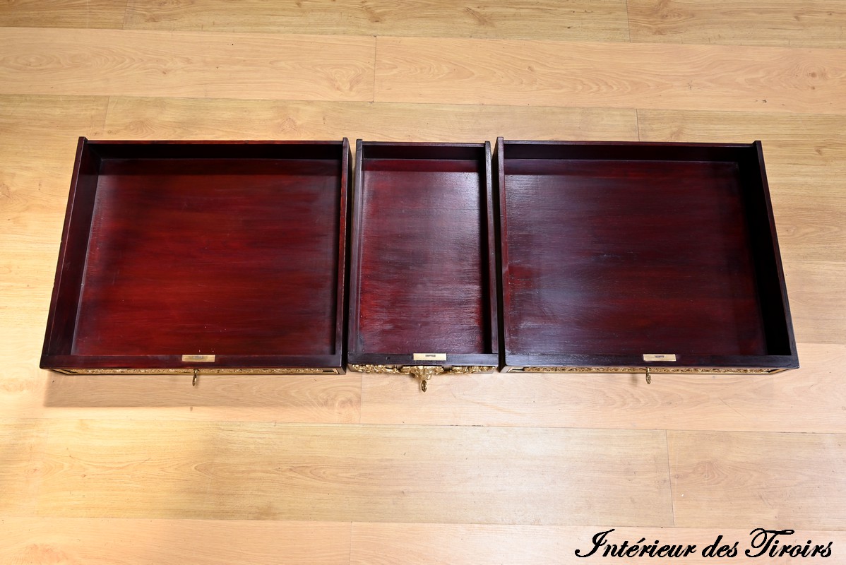 La ceinture dissimule trois tiroirs à décor d’entrelacs souligné de baguette en bronze.