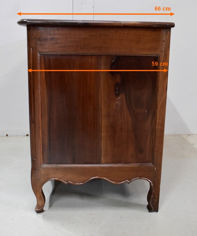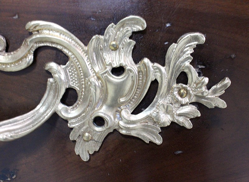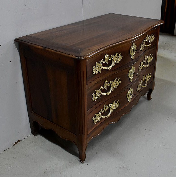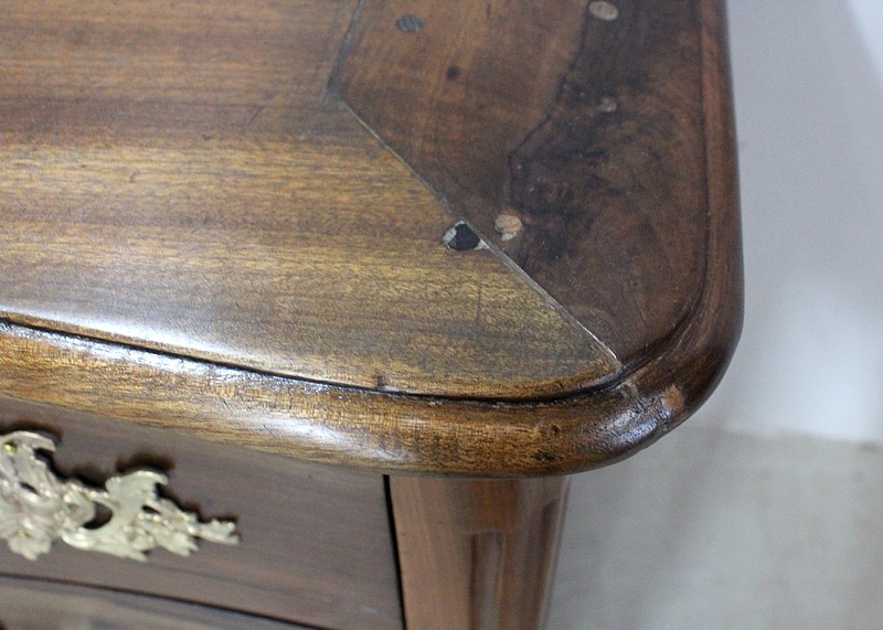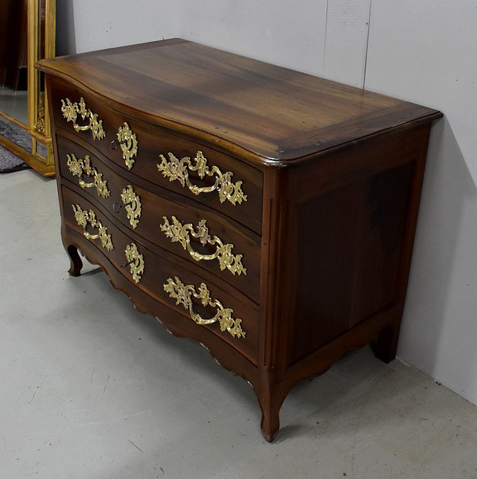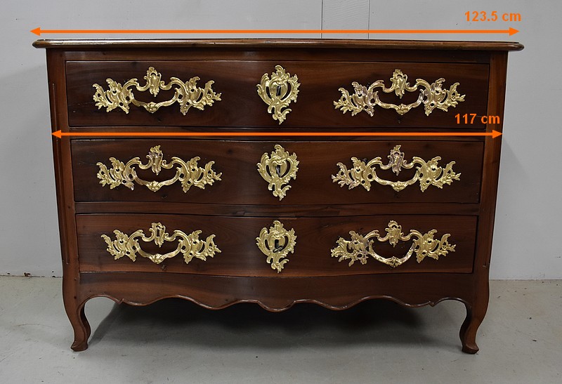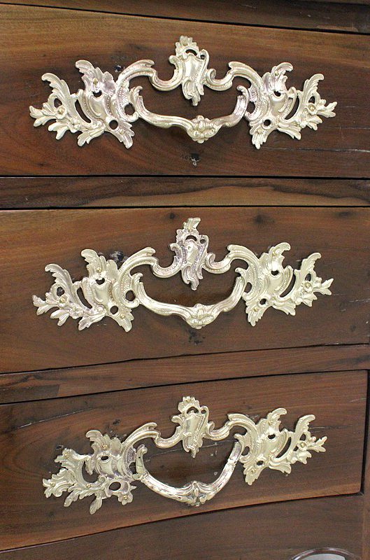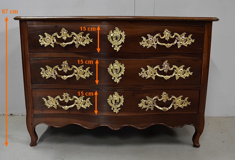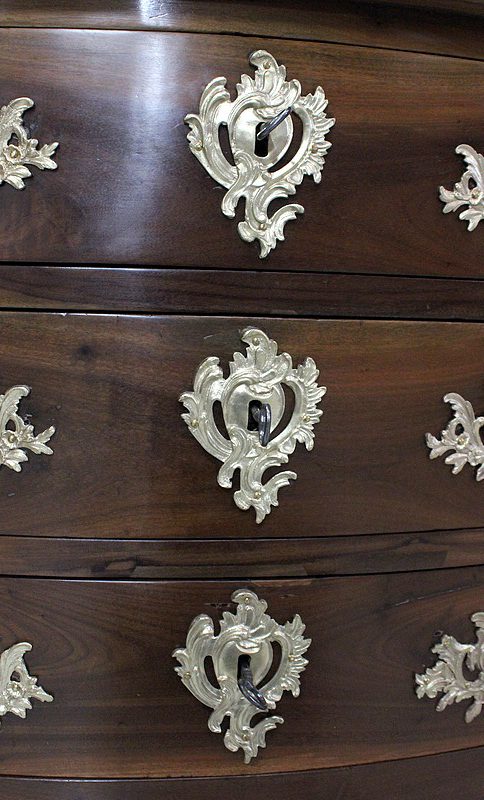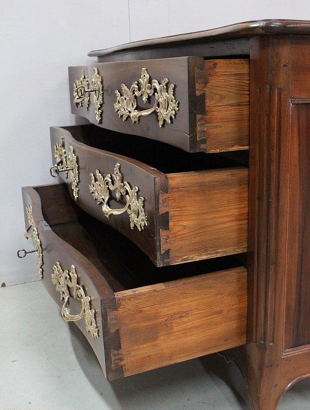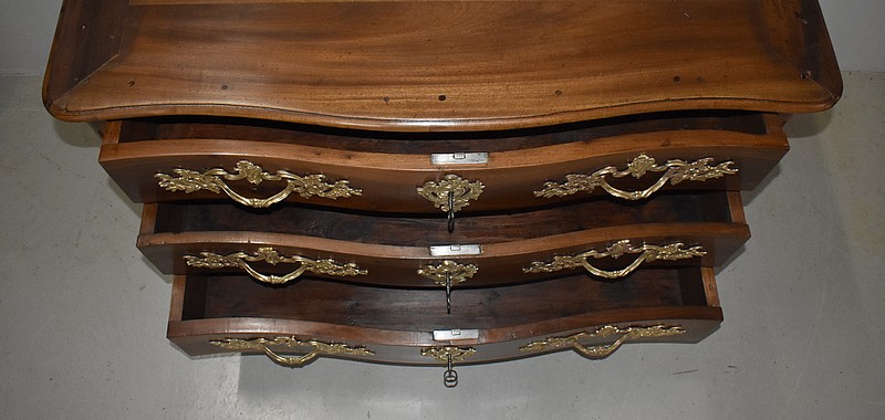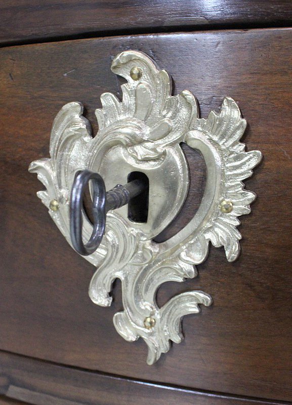 Ce Meuble ouvre par trois tiroirs disposés sur trois rangs et à traverses apparentes. D’une profondeur identique de 15 cm, ils sont Richement Agrémentés d’Importantes Poignées et Entrées en Bronze, d’esprit Rocaille, d’Origine et Authentiques. Chacun de ces tiroirs est équipé d’une serrure en état de fonctionnement accompagnée de sa clé, postérieures au reste de la Commode.