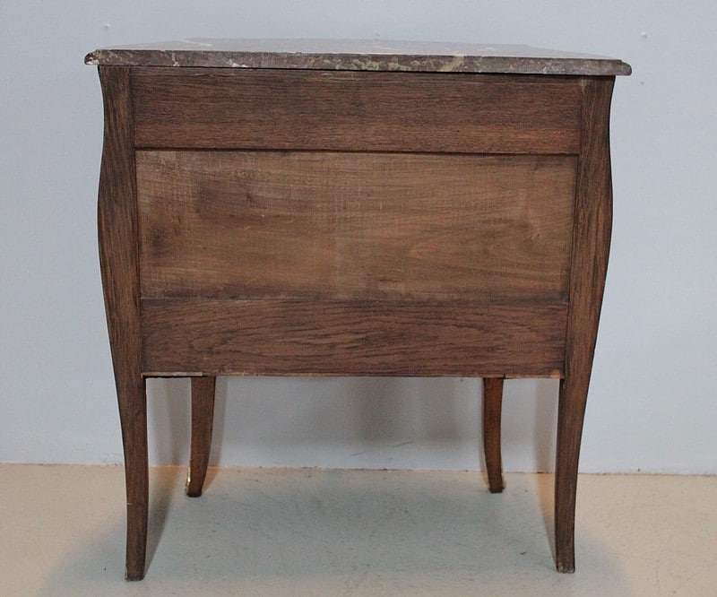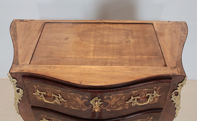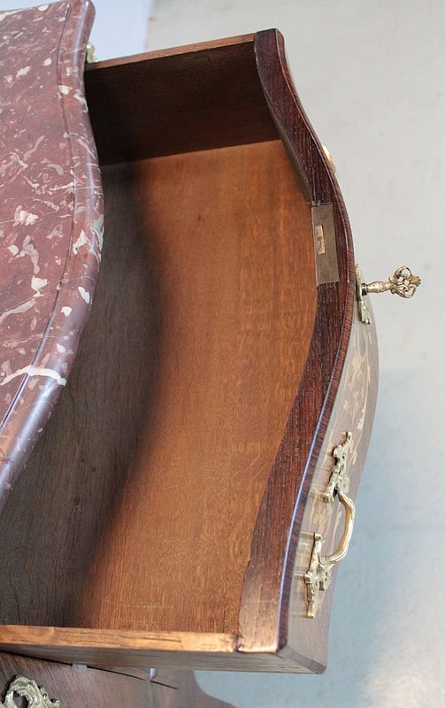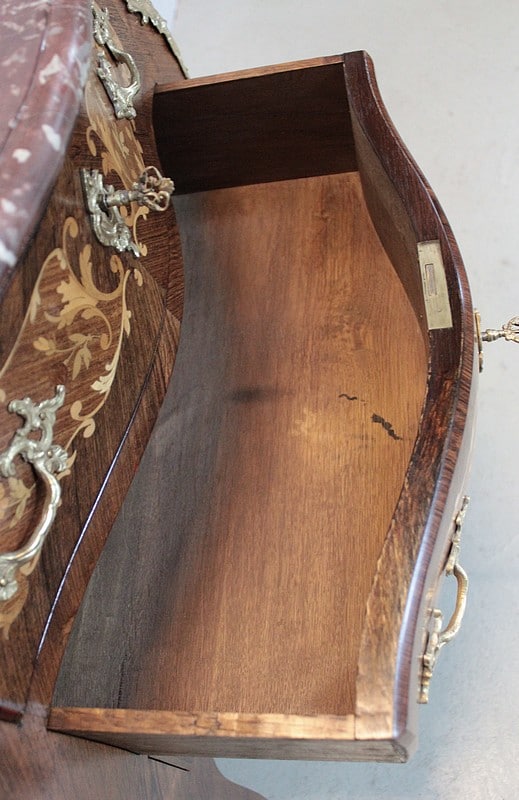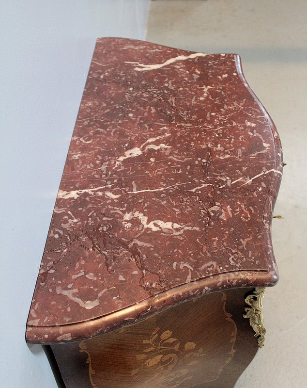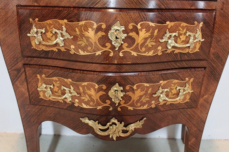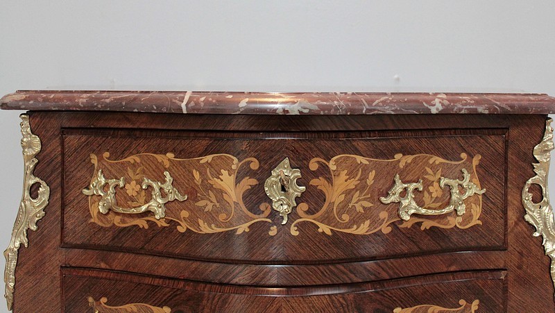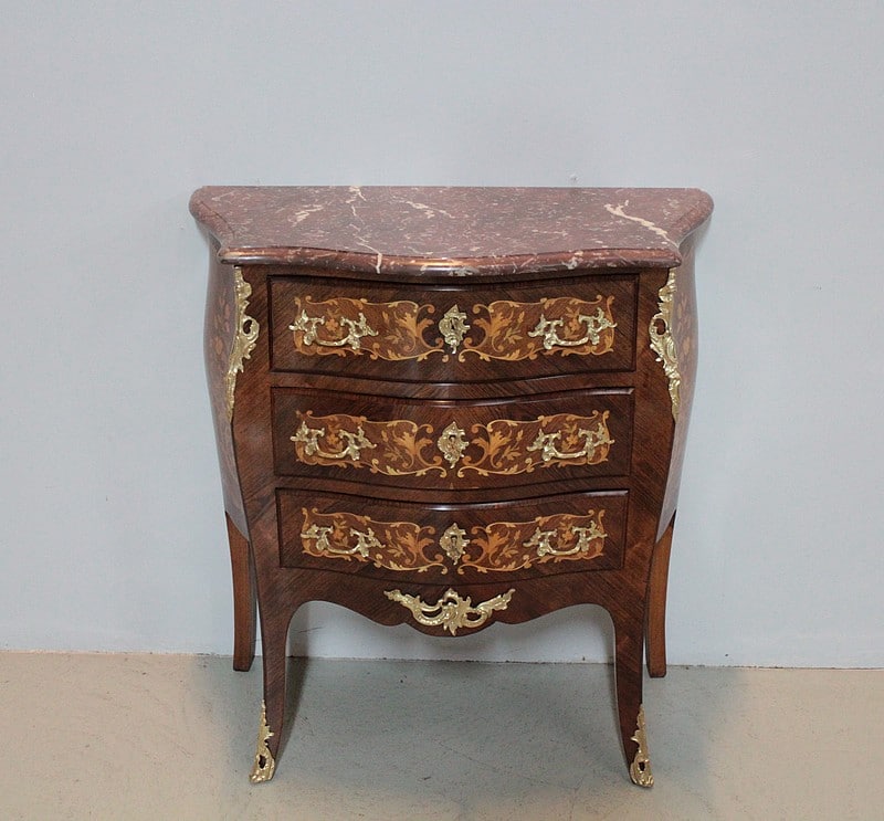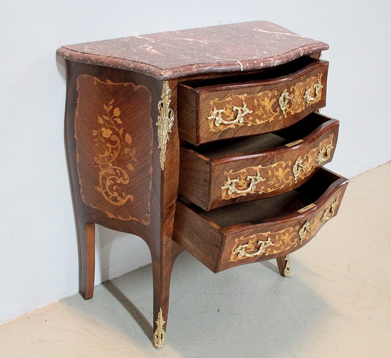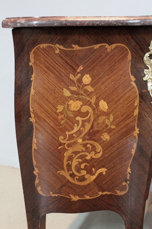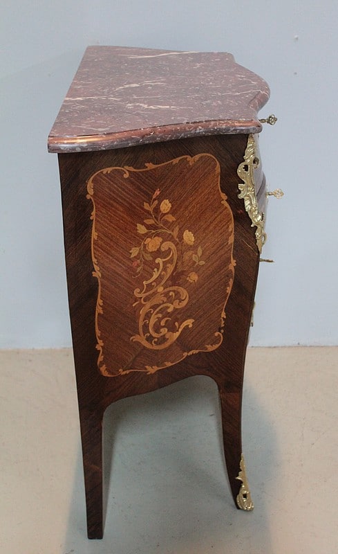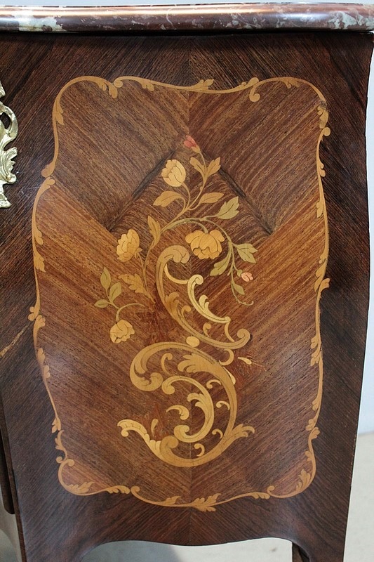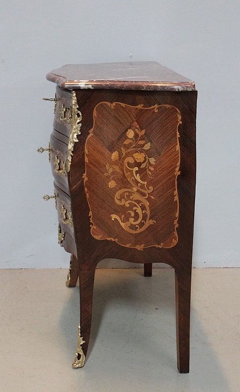 Petite Commode galbée 3 faces de style Louis XV en placage de palissandre et d’acajou avec incrustations de citronnier et de bois précieux divers teintés à décor de fleurs et de feuilles. Dessus de marbre rouge des Pyrénées.
