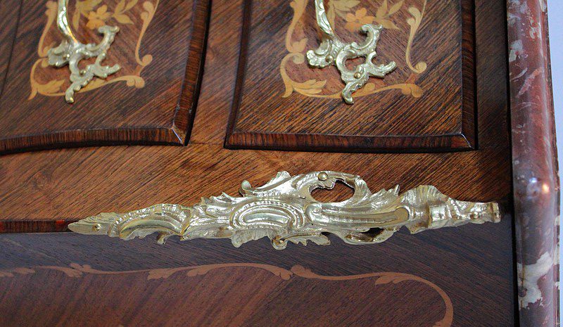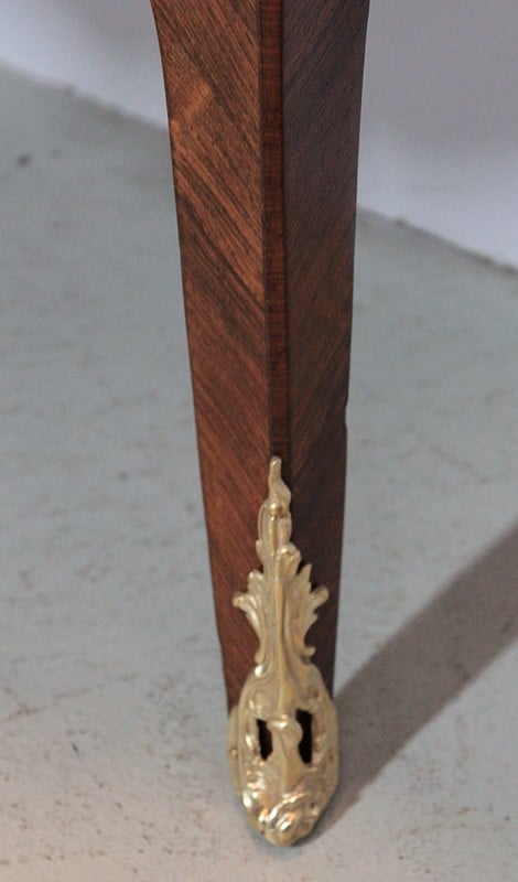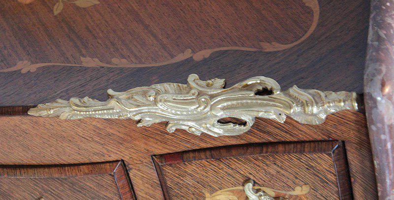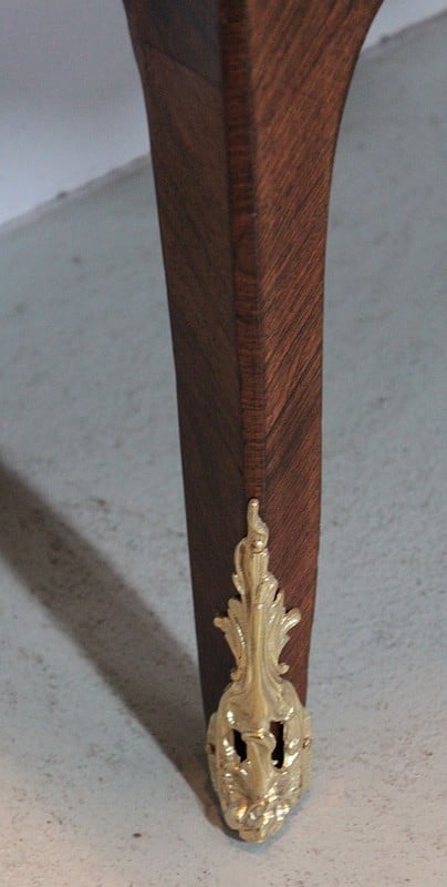 Elle repose sur 4 pieds galbés, ceux de l’avant ornés de chutes et terminés par des sabots en bronze.