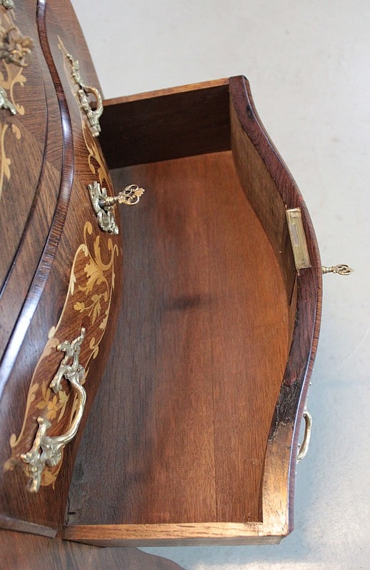 Elle ouvre par 3 tiroirs – intérieurs en chêne – garnis de poignées et d’entrées de serrures en bronze.