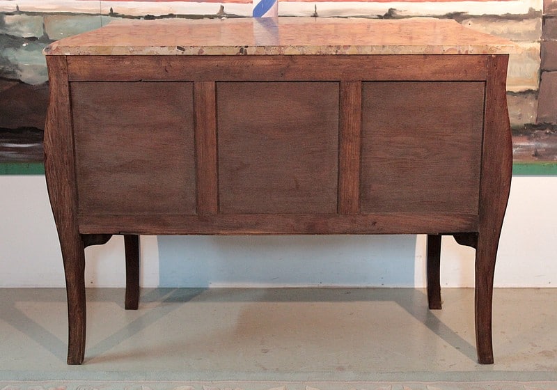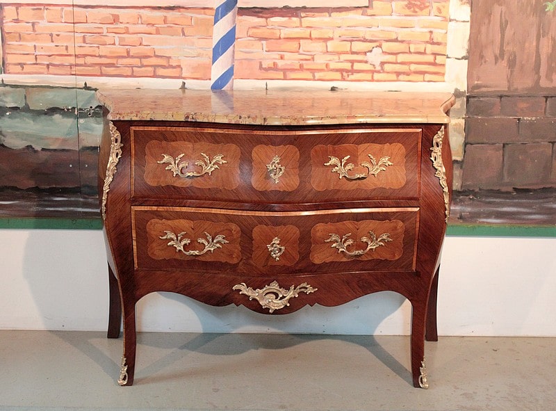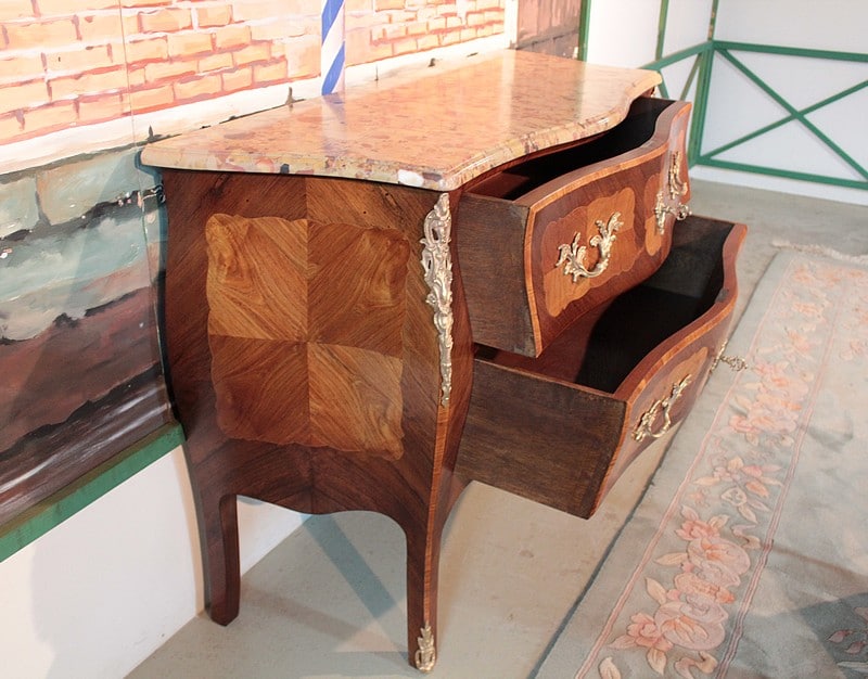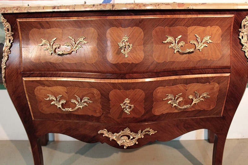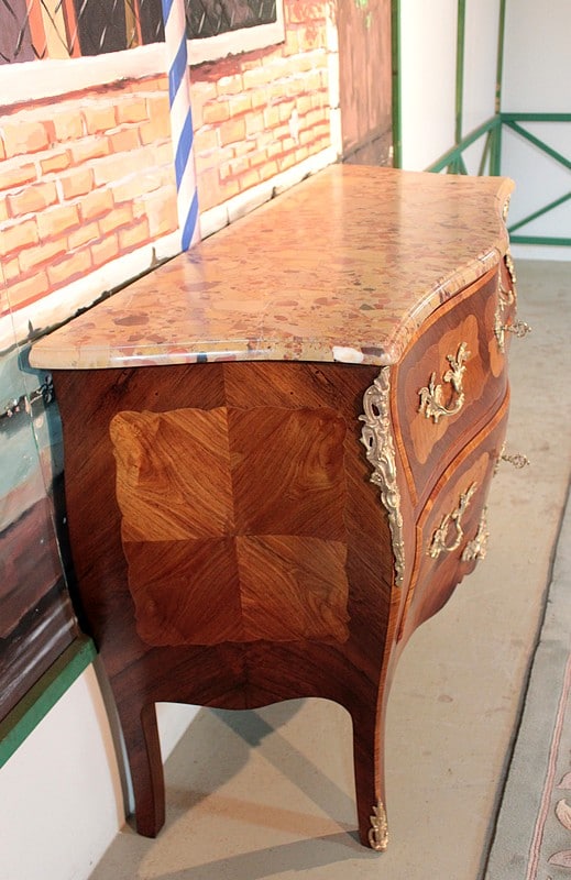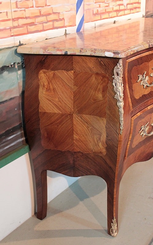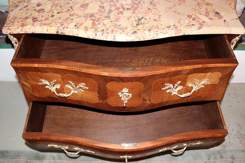 Commode ‘tombeau’ de style Louis XV en placage de palissandre et marqueterie de bois de rose entourée d’un filet de citronnier. Le dessus est en marbre d’Alep et elle ouvre par 2 tiroirs galbés, intérieurs en chêne. Ses côtés sont également galbés et elle repose sur 4 pieds cambrés.