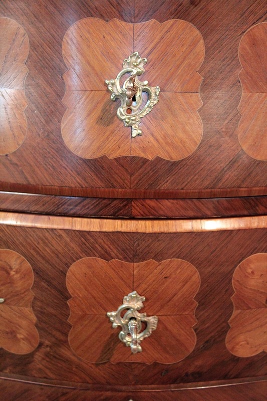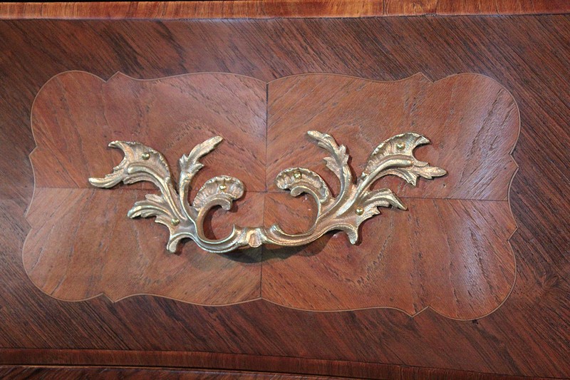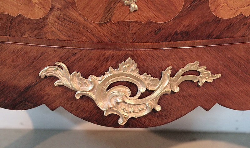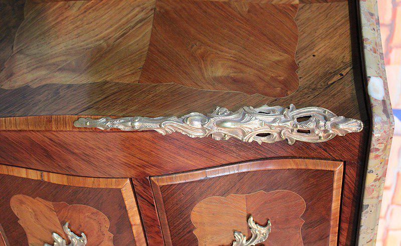 Elle est ornée de nombreuses garnitures de bronze : poignées, entrées de serrures, chutes et sabots…