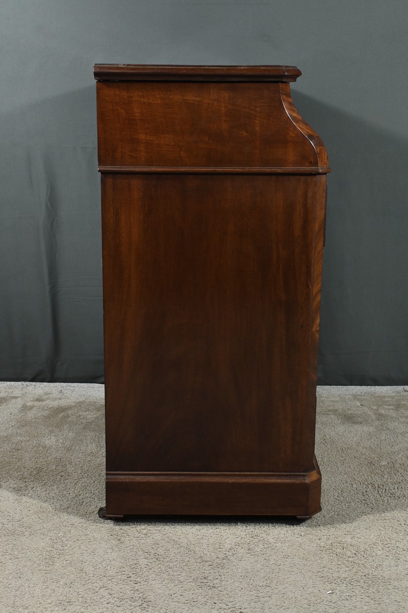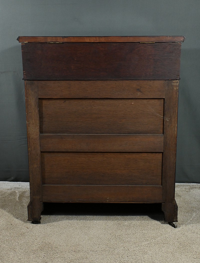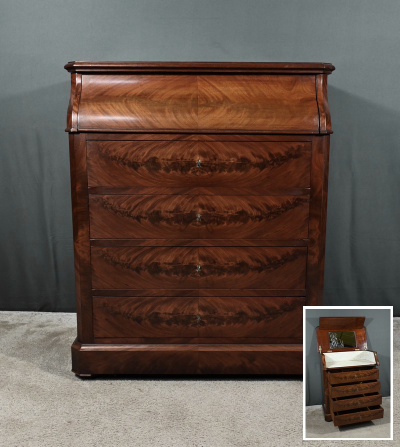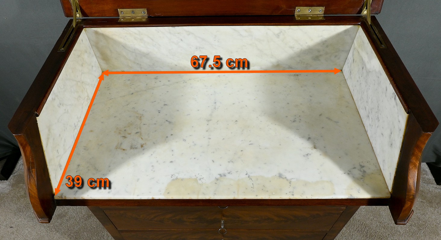 Belle commode de toilette de style Louis-Philippe en placage de ronce d’acajou dotée de 4 tiroirs spacieux avec clés et serrures fonctionnelles, et d’un dessus qui s’ouvre pour découvrir l’espace de toilette. Ce système d’abattant prend le nom de piano lorsqu’il est à angle droit. Plus rare, ce meuble possède une fermeture en doucine. Un miroir fixé à l’intérieur sert de glace à coiffer ou pour se raser. Le marbre blanc de carrare à l’intérieur assure l’étanchéité de la surface. On y pose les ustensiles de toilettes en faïence comme le broc à eau, la cuvette ou bassin, ainsi que les accessoires de coiffure, de rasage et tous les parfums et lotions. Cette commode de toilette est montée sur roulettes pour faciliter son déplacement. Ce type de meuble eut un très grand succès durant la Belle-Epoque, à la fin du XIXe siècle.