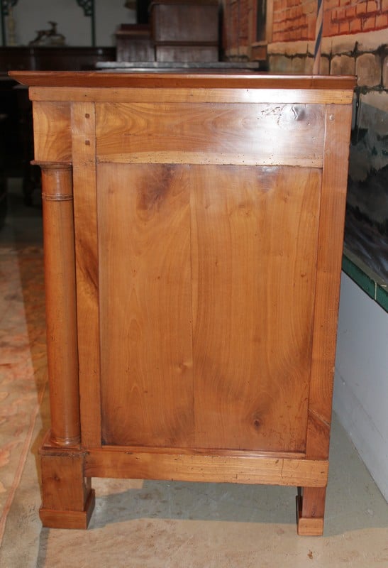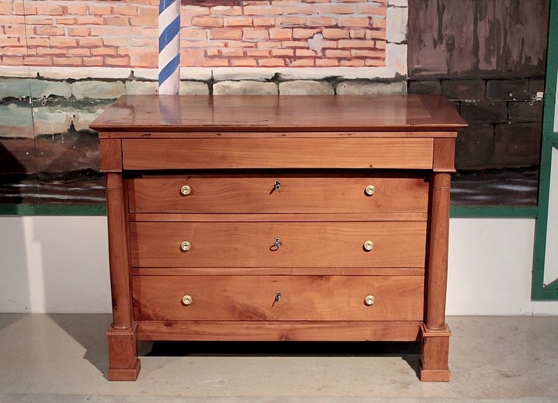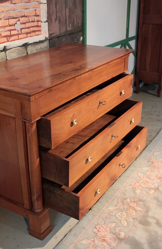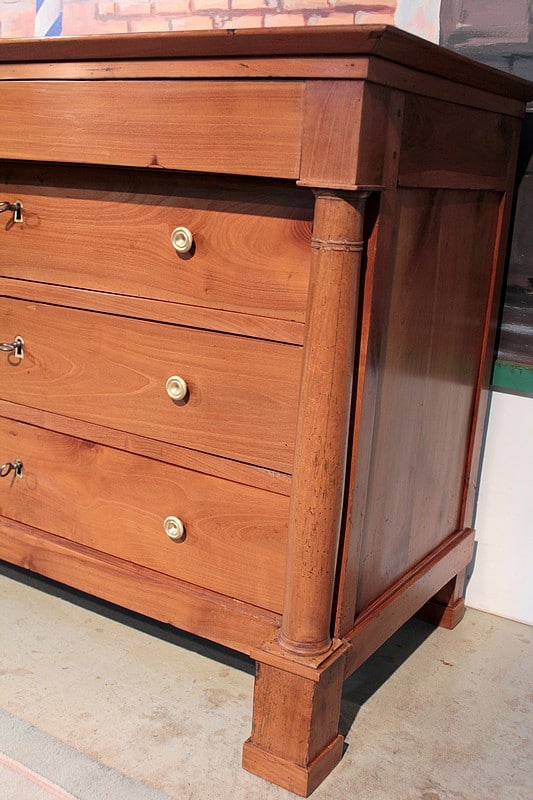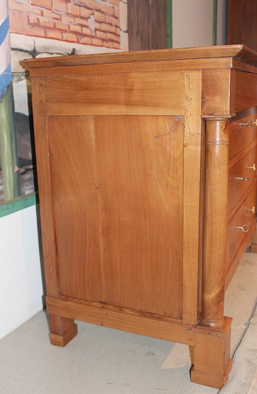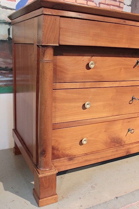 Commode Empire à colonnes détachées en merisier blond massif, ouvrant à 4 tiroirs. Elle repose sur 4 pieds carrés. Facile à placer grâce à ses petites dimensions et sa sobriété. Travail régional nantais du début XIXe (1820).