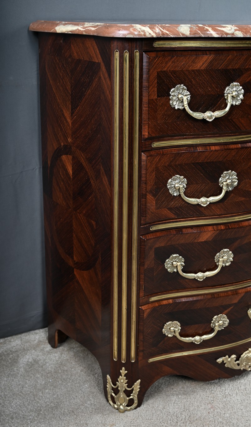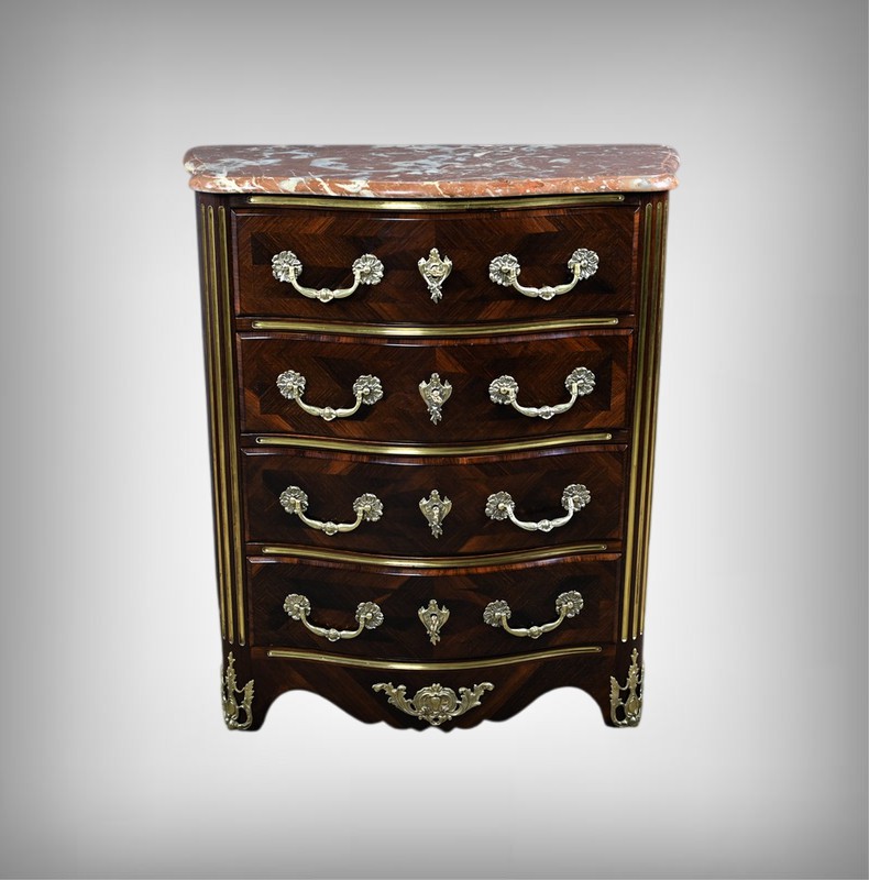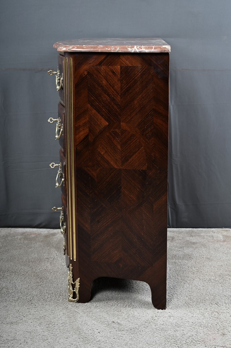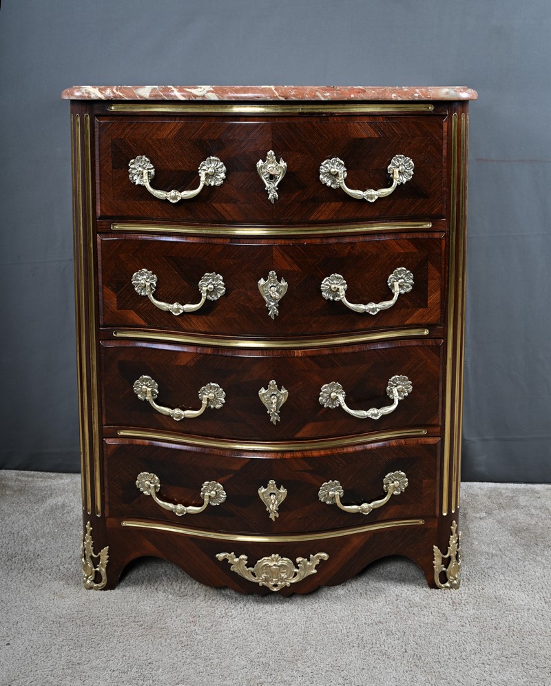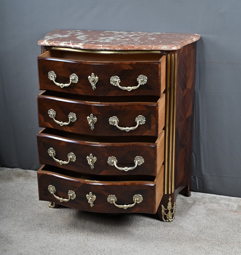 Cette magnifique petite commode Régence du XIXe siècle, séduit par son élégance et son raffinement. Réalisée en marqueterie finement travaillée de palissandre disposé en chevrons, elle présente une façade galbée de forme arbalète, témoignant d’un savoir-faire d’ébénisterie remarquable. Ce meuble rare est couronné d’un superbe marbre brèche rouge de forme mouvementée, encadré d’un bec de corbin qui souligne la noblesse de la pièce. La façade bombée du meuble présente quatre tiroirs, hauts et généreux, ornés de poignées de tirage tombantes en bronze ciselé formant des fleurs en applique. Au centre de chaque tiroir, une entrée de serrure en bronze doré, richement ouvragée, attire le regard. Elle est fonctionnelle et accompagnée de sa clé ajustée. Les montants arrondis se caractérisent par des cannelures de laiton adoucissant les lignes, tandis que la traverse basse, joliment mouvementée, est garnie d’une belle garniture feuillagée en bronze. Les pieds droits sont décorés de belles ornementations ajourées en bronze. Cette commode décorative tout en restant fonctionnelle, trouvera sa place aussi bien dans un intérieur classique que dans une mise en scène plus contemporaine, où elle apportera une note d’histoire et de caractère.
