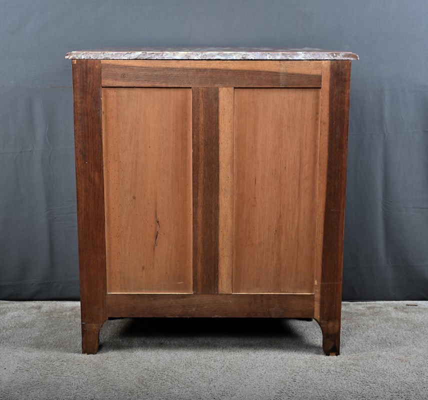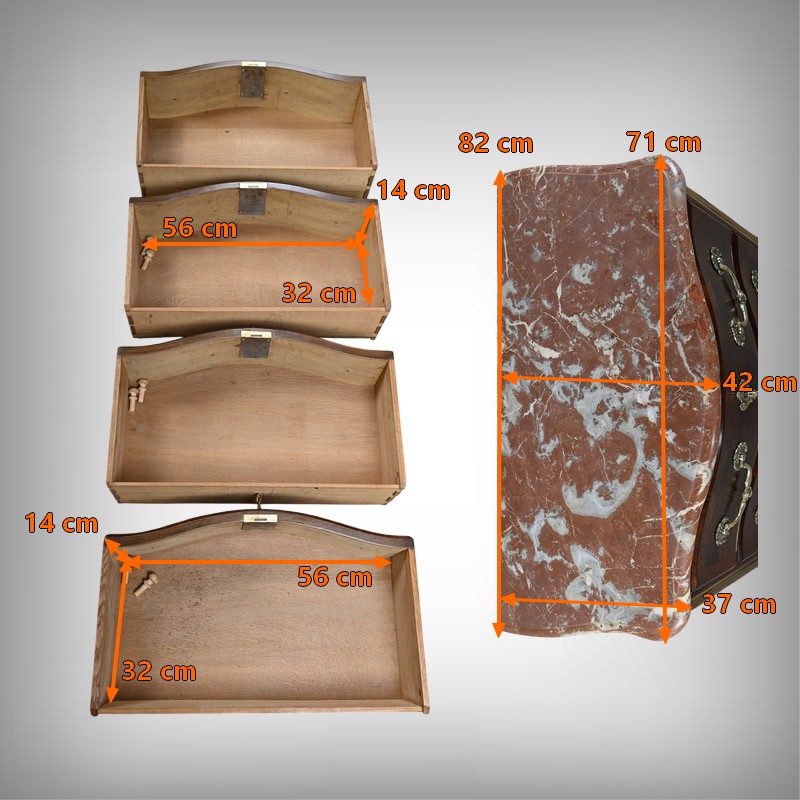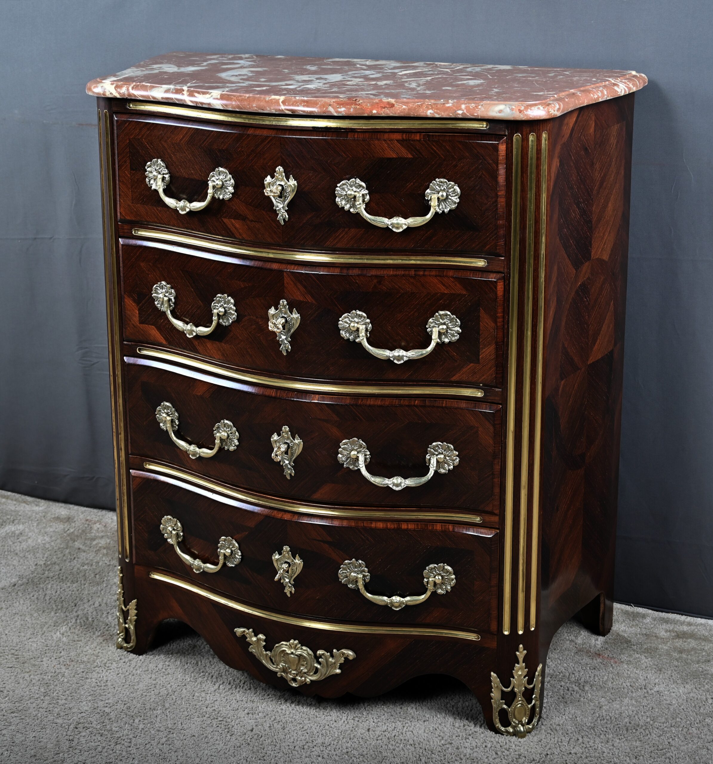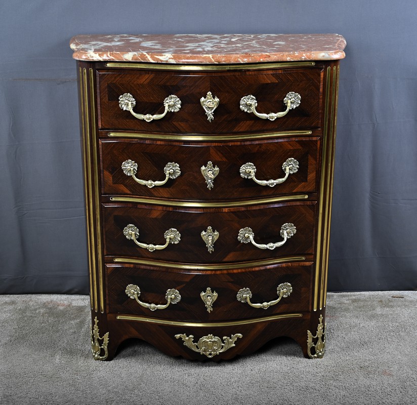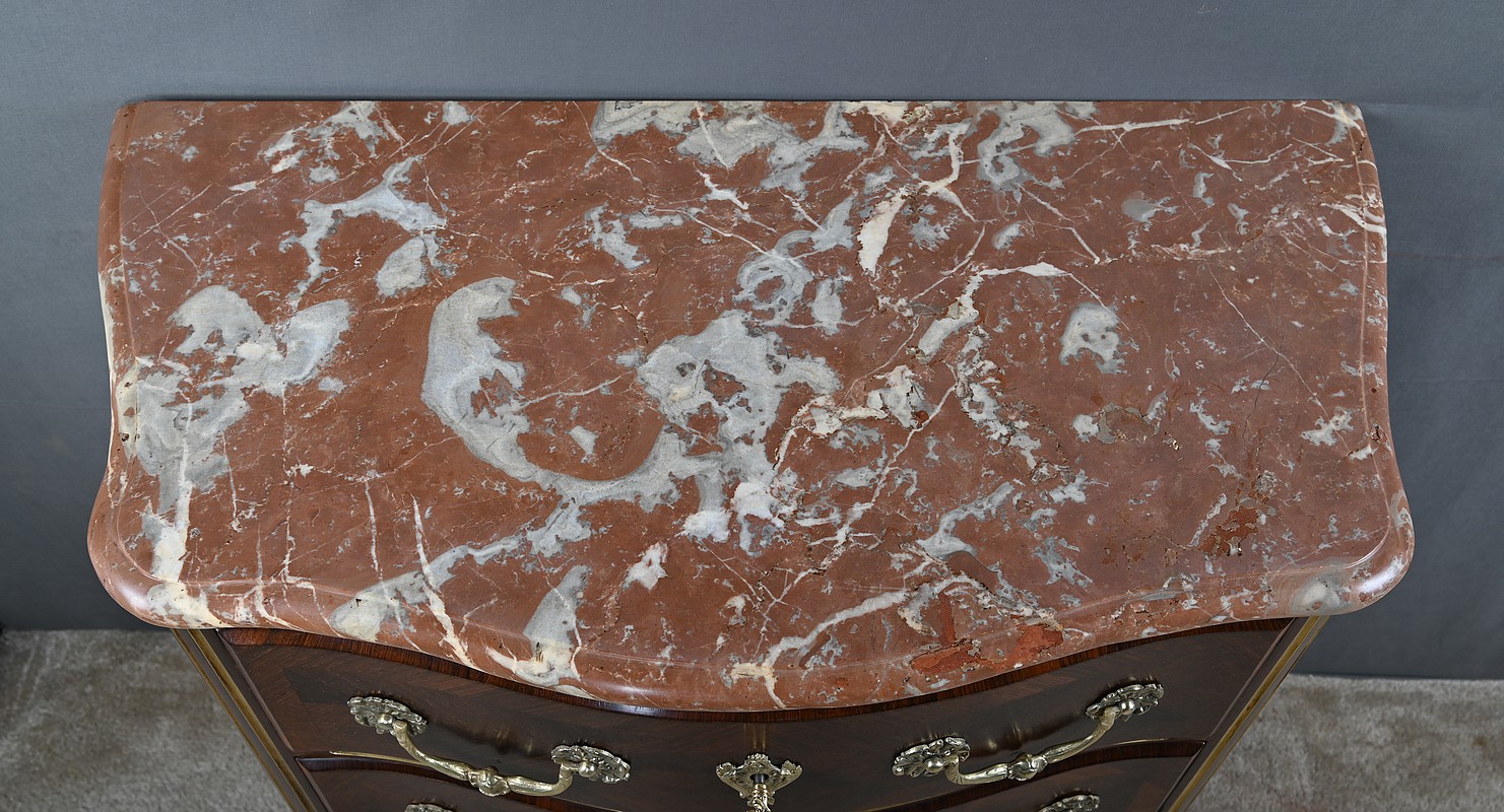 Cette magnifique petite commode Régence du XIXe siècle, séduit par son élégance et son raffinement. Réalisée en marqueterie finement travaillée de palissandre disposé en chevrons, elle présente une façade galbée de forme arbalète, témoignant d’un savoir-faire d’ébénisterie remarquable. Ce meuble rare est couronné d’un superbe marbre brèche rouge de forme mouvementée, encadré d’un bec de corbin qui souligne la noblesse de la pièce. La façade bombée du meuble présente quatre tiroirs, hauts et généreux, ornés de poignées de tirage tombantes en bronze ciselé formant des fleurs en applique. Au centre de chaque tiroir, une entrée de serrure en bronze doré, richement ouvragée, attire le regard. Elle est fonctionnelle et accompagnée de sa clé ajustée. Les montants arrondis se caractérisent par des cannelures de laiton adoucissant les lignes, tandis que la traverse basse, joliment mouvementée, est garnie d’une belle garniture feuillagée en bronze. Les pieds droits sont décorés de belles ornementations ajourées en bronze. Cette commode décorative tout en restant fonctionnelle, trouvera sa place aussi bien dans un intérieur classique que dans une mise en scène plus contemporaine, où elle apportera une note d’histoire et de caractère.