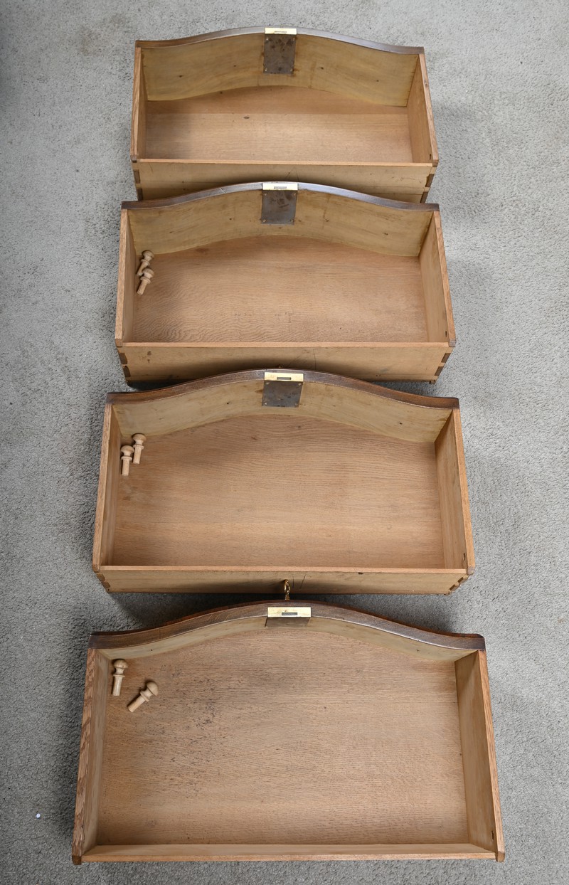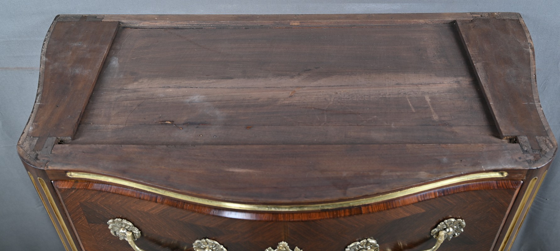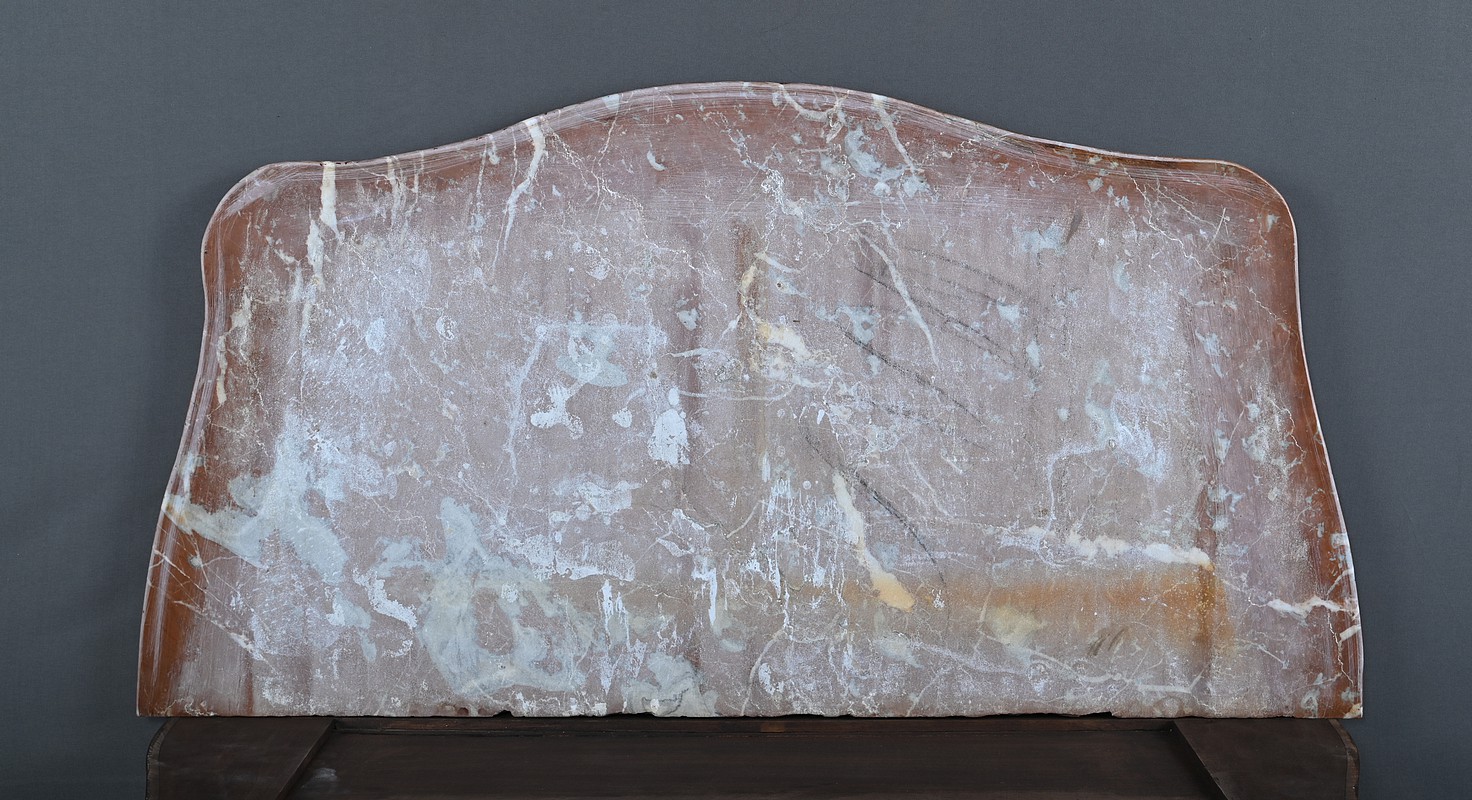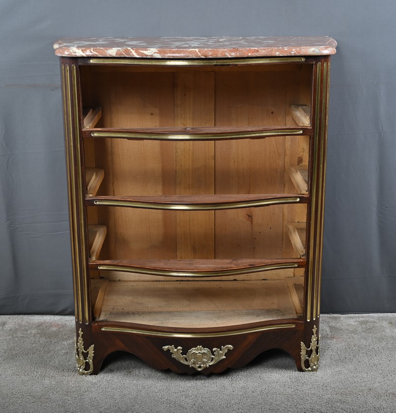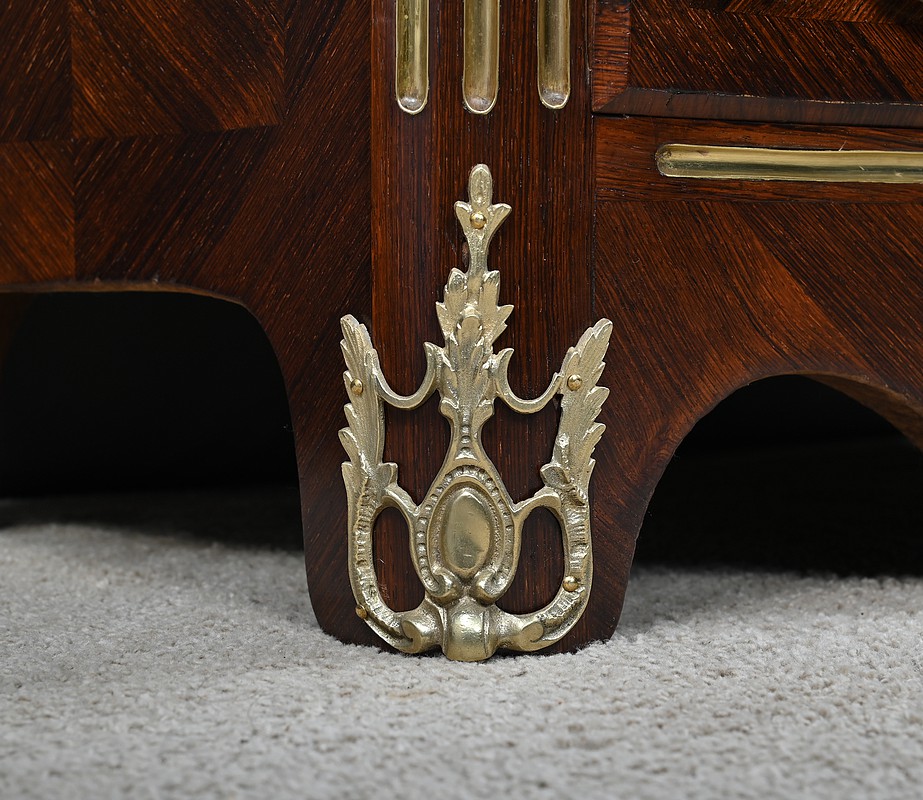 Cette magnifique petite commode Régence du XIXe siècle, séduit par son élégance et son raffinement. Réalisée en marqueterie finement travaillée de palissandre disposé en chevrons, elle présente une façade galbée de forme arbalète, témoignant d’un savoir-faire d’ébénisterie remarquable. Ce meuble rare est couronné d’un superbe marbre brèche rouge de forme mouvementée, encadré d’un bec de corbin qui souligne la noblesse de la pièce. La façade bombée du meuble présente quatre tiroirs, hauts et généreux, ornés de poignées de tirage tombantes en bronze ciselé formant des fleurs en applique. Au centre de chaque tiroir, une entrée de serrure en bronze doré, richement ouvragée, attire le regard. Elle est fonctionnelle et accompagnée de sa clé ajustée. Les montants arrondis se caractérisent par des cannelures de laiton adoucissant les lignes, tandis que la traverse basse, joliment mouvementée, est garnie d’une belle garniture feuillagée en bronze. Les pieds droits sont décorés de belles ornementations ajourées en bronze. Cette commode décorative tout en restant fonctionnelle, trouvera sa place aussi bien dans un intérieur classique que dans une mise en scène plus contemporaine, où elle apportera une note d’histoire et de caractère.