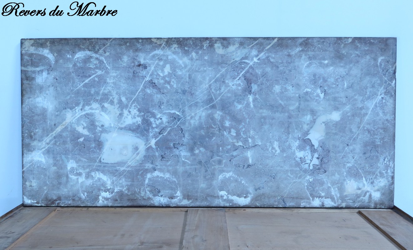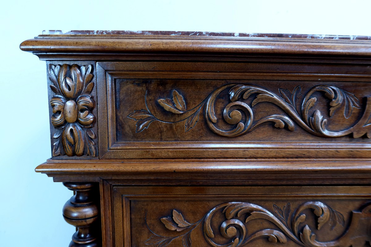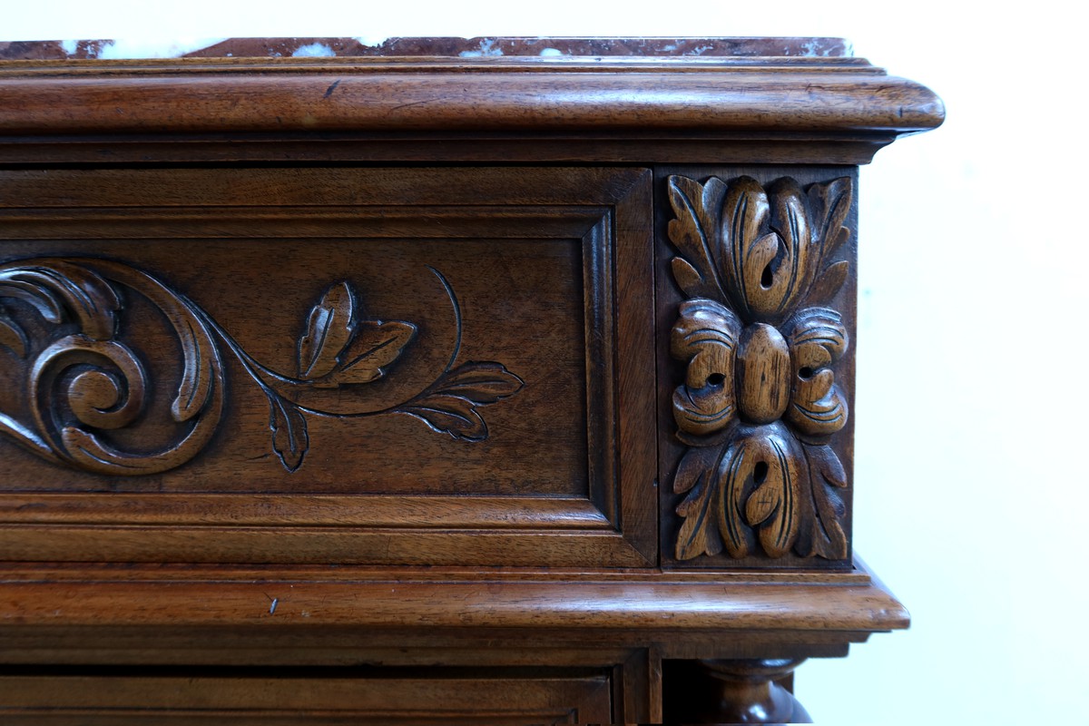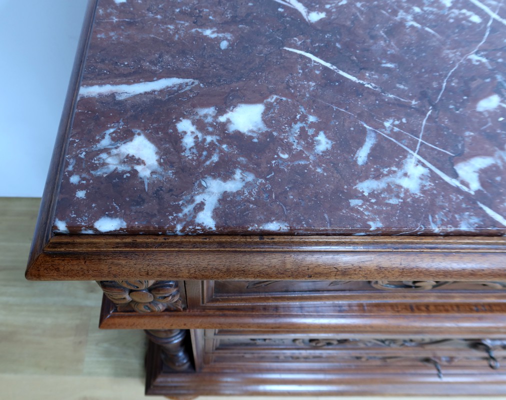 Le dessus en marbre rouge griotte de Belgique encastré ajoute une touche de luxe et de raffinement à ce meuble d’exception.
