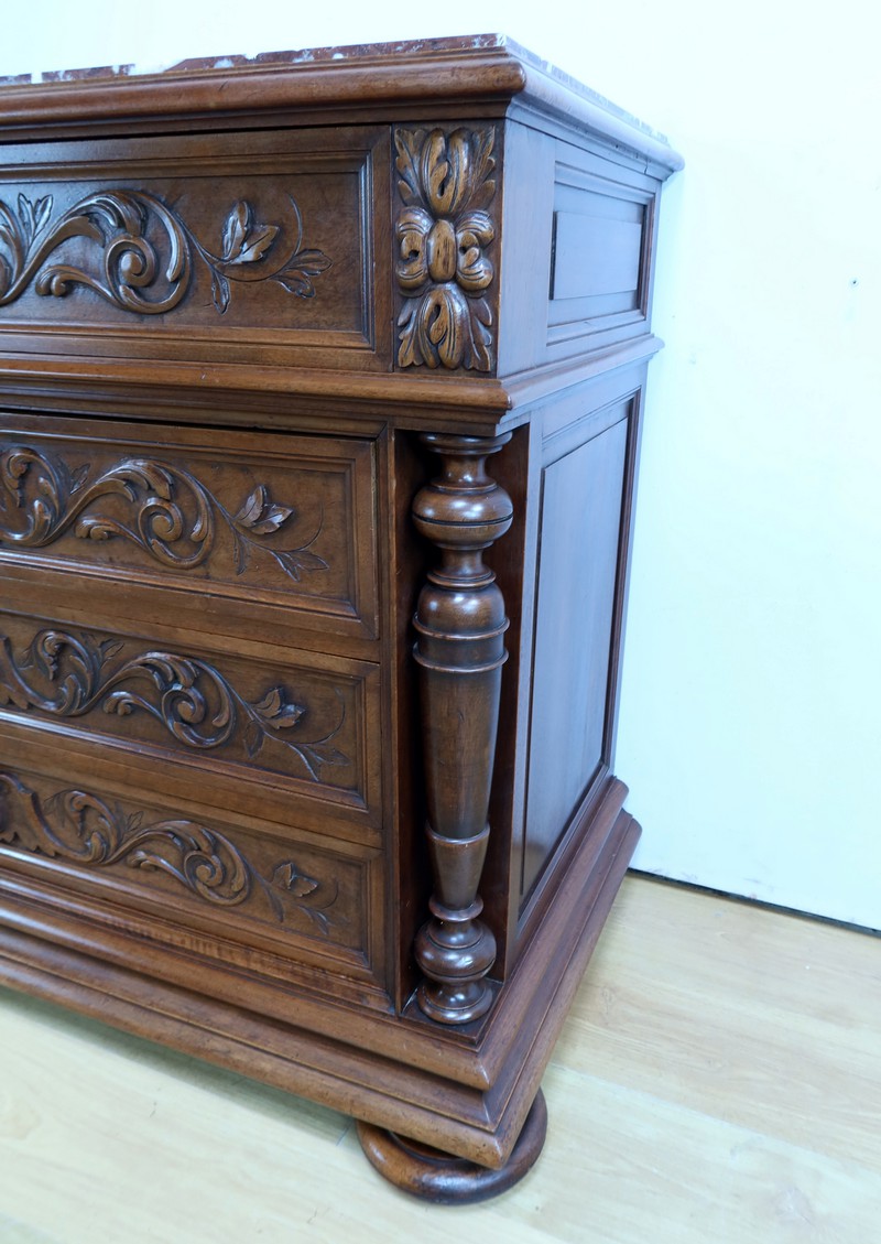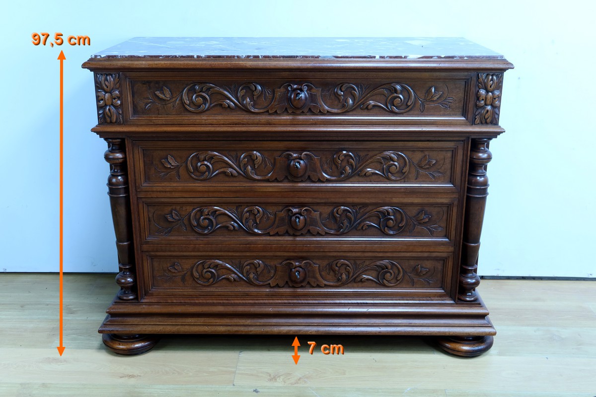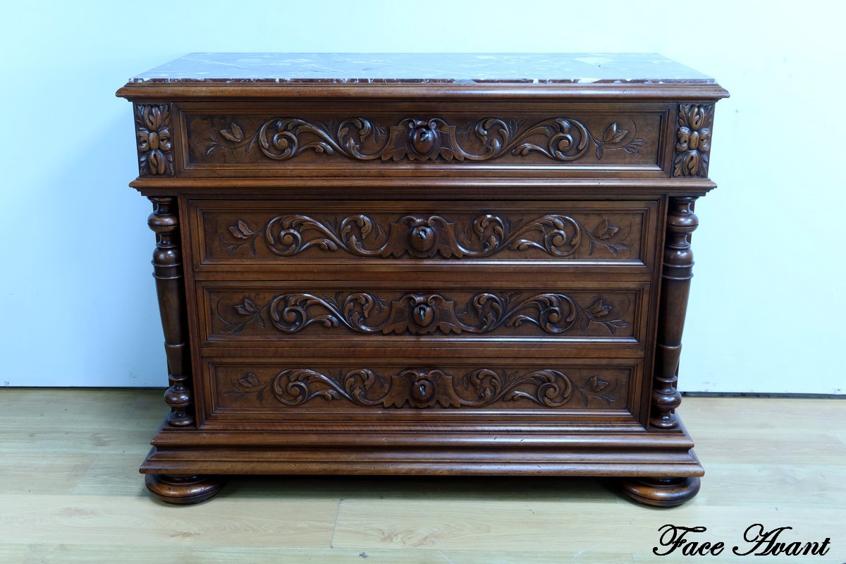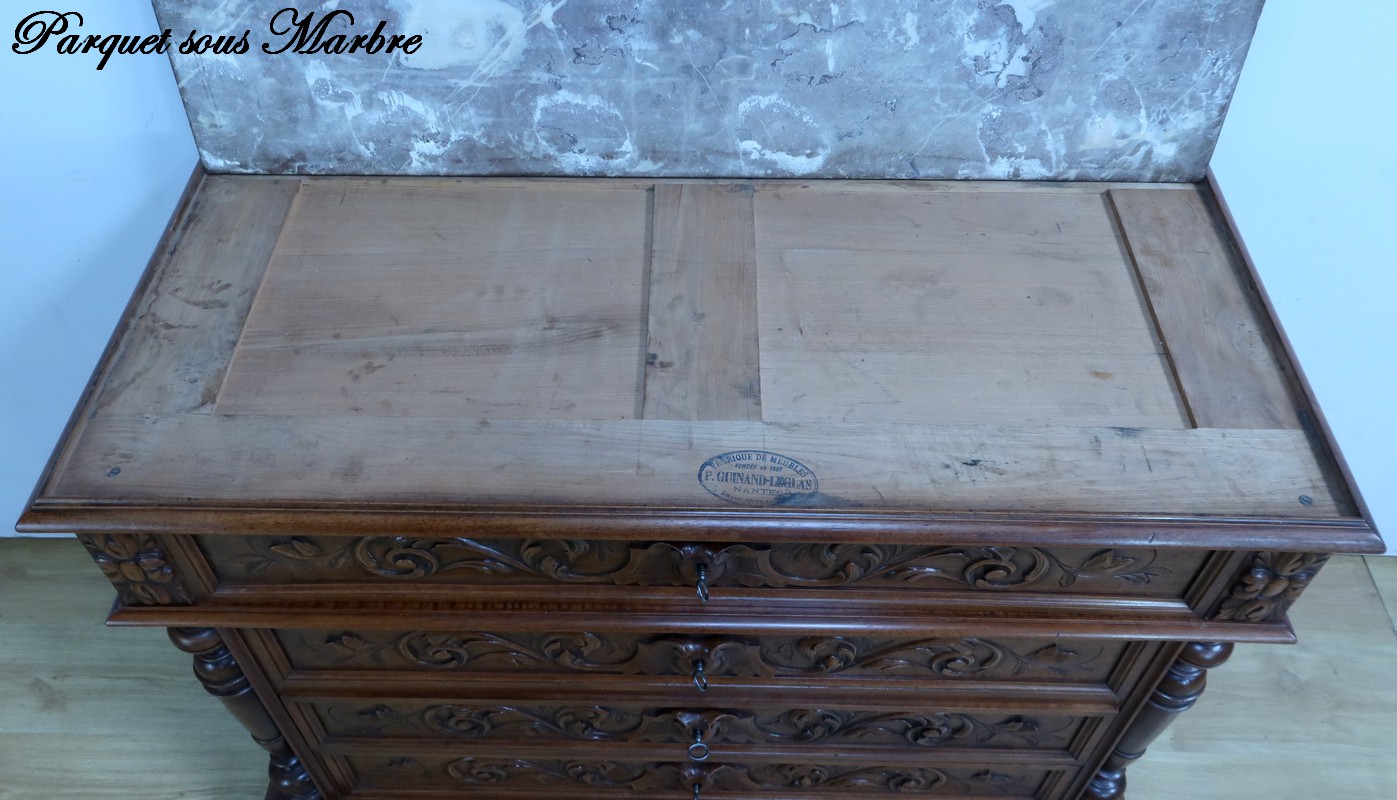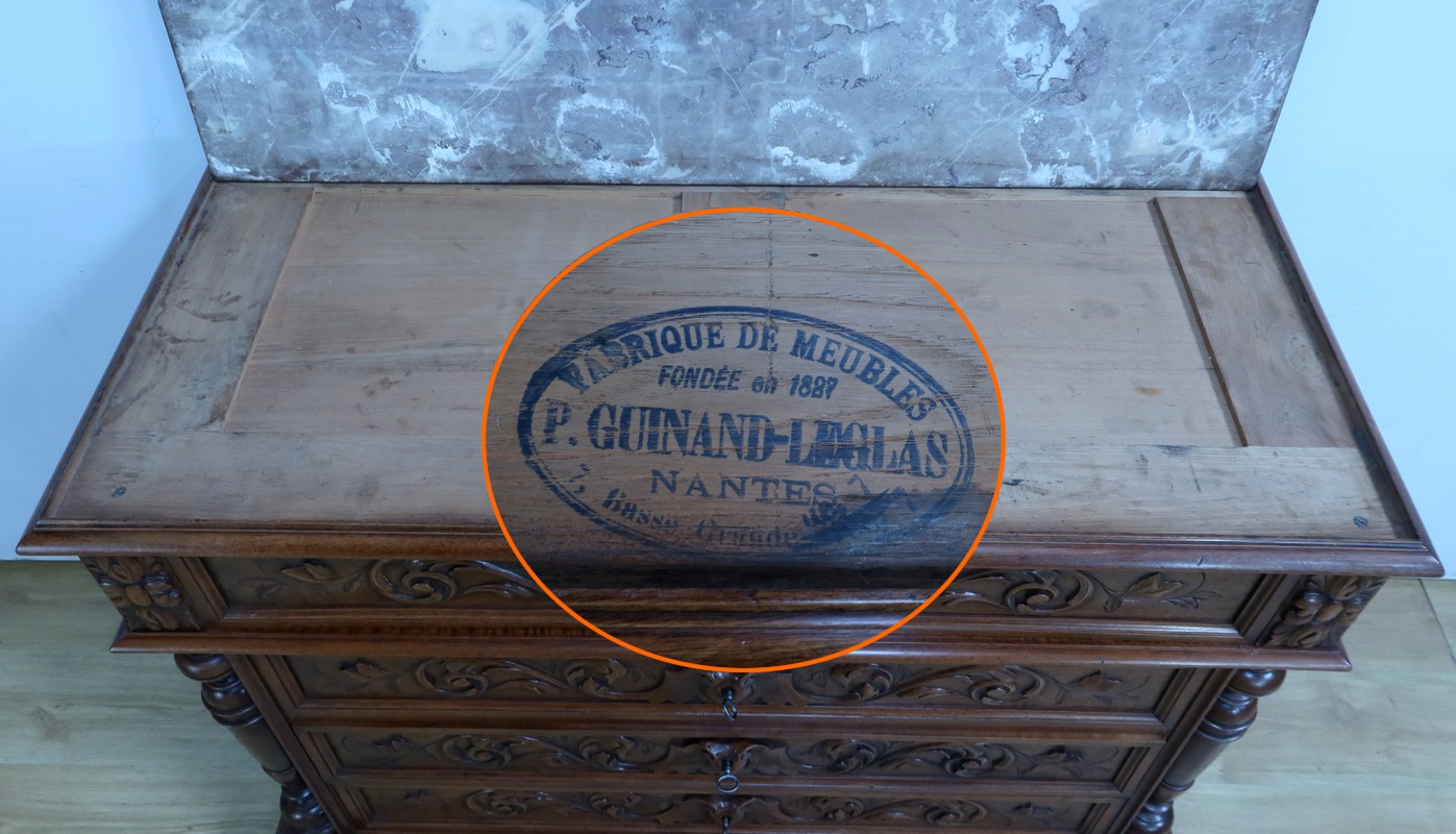 Cette superbe commode en noyer, estampillée par les ébénistes de la maison nantaise P.Guinand-Leglas, est un véritable chef-d’œuvre du style Renaissance.