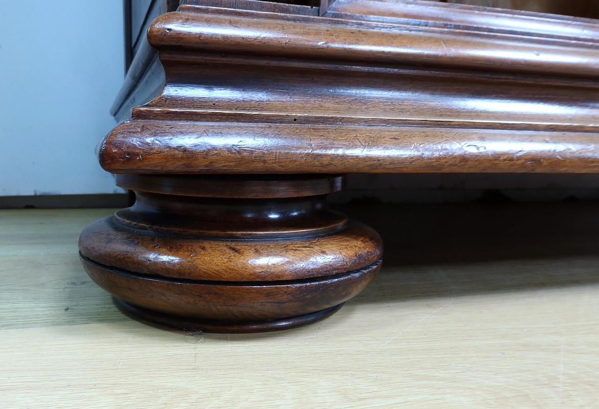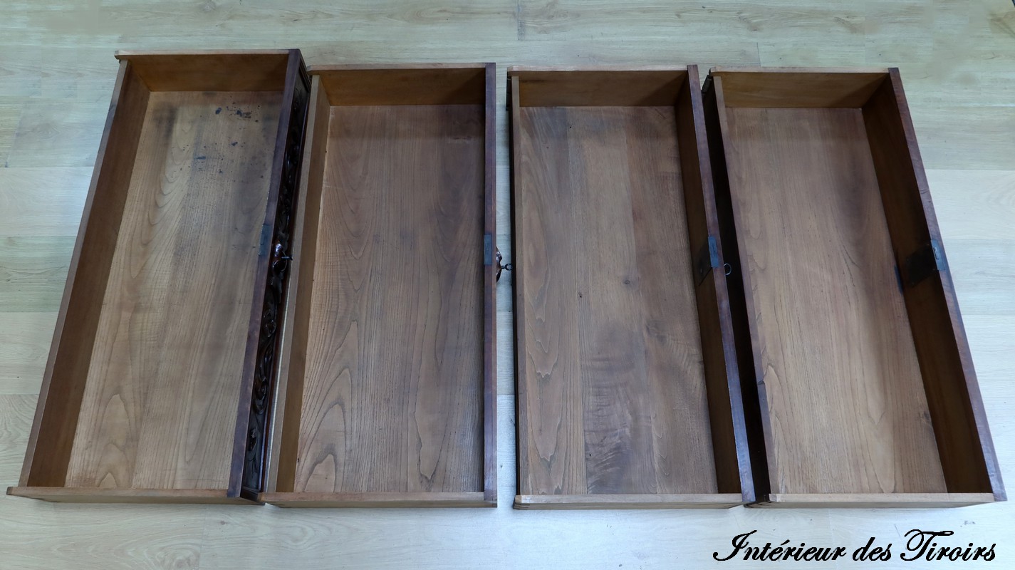Les façades des tiroirs sont intégralement moulurées de rinceaux et de volutes avec des entrées en bois, ajoutant une touche de sophistication à l’ensemble.