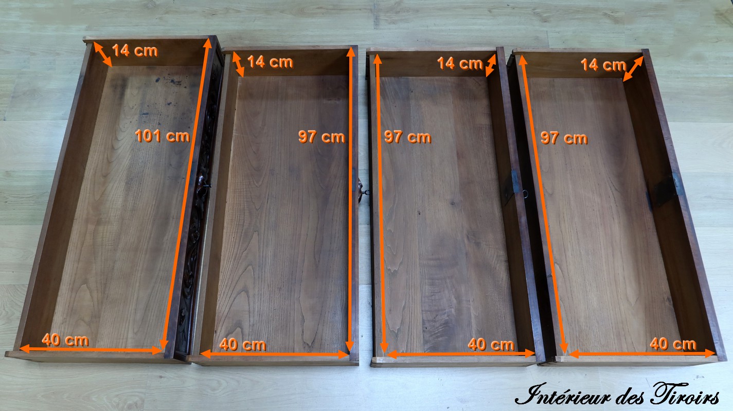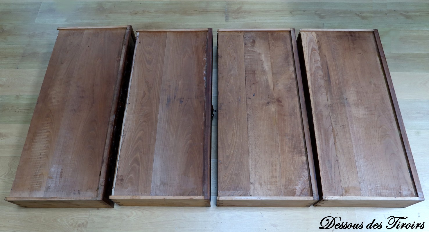 La commode s’ouvre par un tiroir en ceinture, suivi de trois tiroirs plus petits en retrait, tous équipés de serrures authentiques.