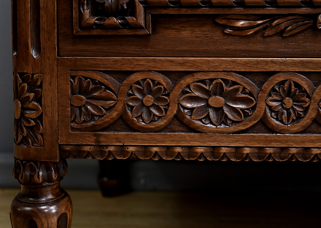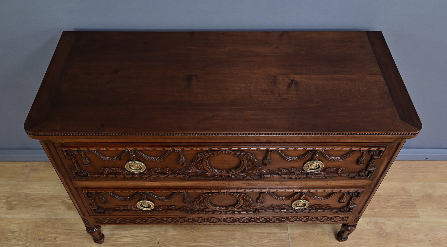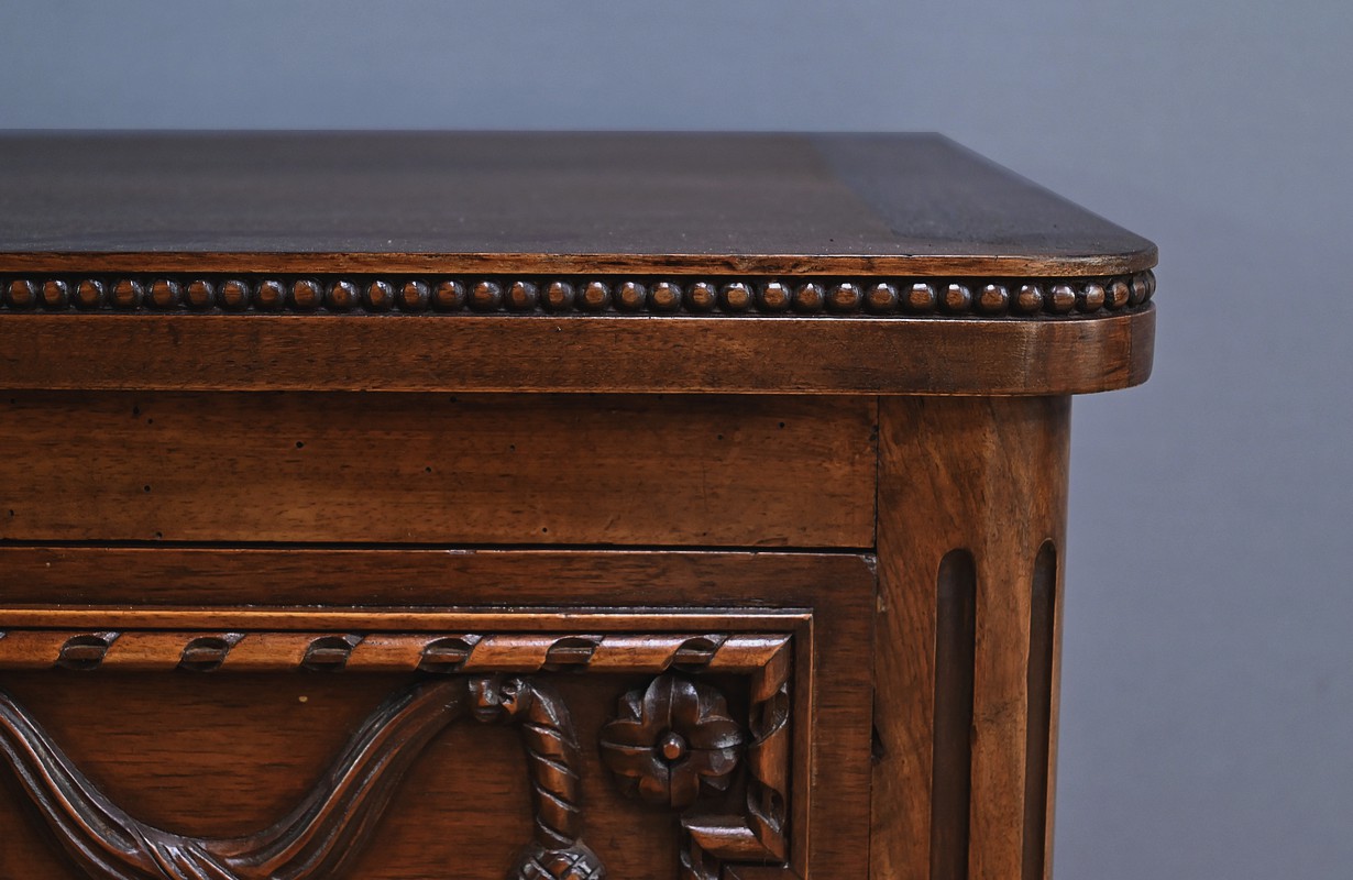 Cette élégante commode en noyer sculpté, réalisée dans le style Louis XVI au milieu du XXe siècle, incarne le raffinement du mobilier classique français. Son plateau est délicatement bordé d’une guirlande de perles, apportant une touche de finesse à l’ensemble. La façade présente deux tiroirs richement ornés de médaillons, de rubans et de feuillages finement sculptés en relief. Chaque tiroir est équipé de poignées anneaux en bronze doré, qui ajoutent une note précieuse à l’ensemble. La traverse inférieure est décorée de motifs floraux stylisés, évoquant une géométrie harmonieuse et équilibrée. Les montants sont à cannelures arrêtées, typiques du style Louis XVI, et se prolongent jusqu’à des pieds en toupie sculptés d’oves, assurant à la fois stabilité et élégance. Cette pièce, à la fois décorative et fonctionnelle, trouvera parfaitement sa place dans un intérieur raffiné, qu’il soit classique ou éclectique.
