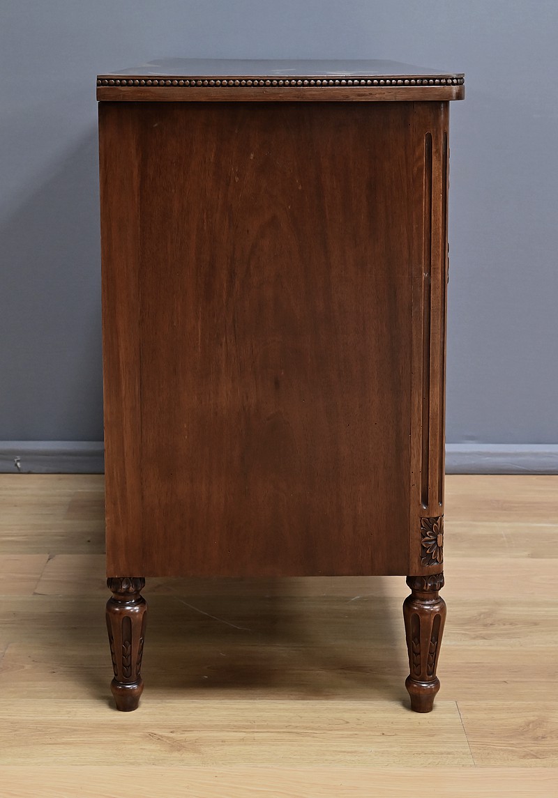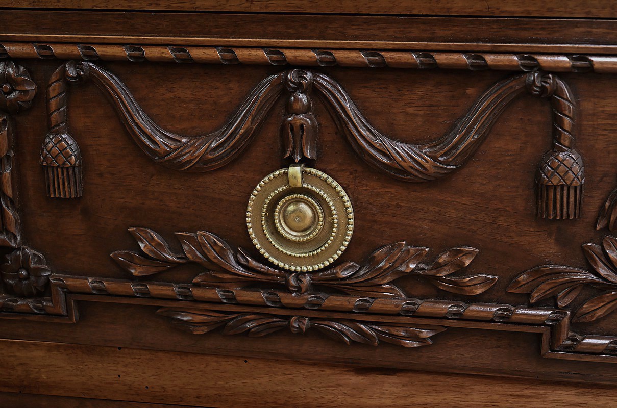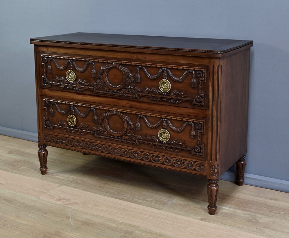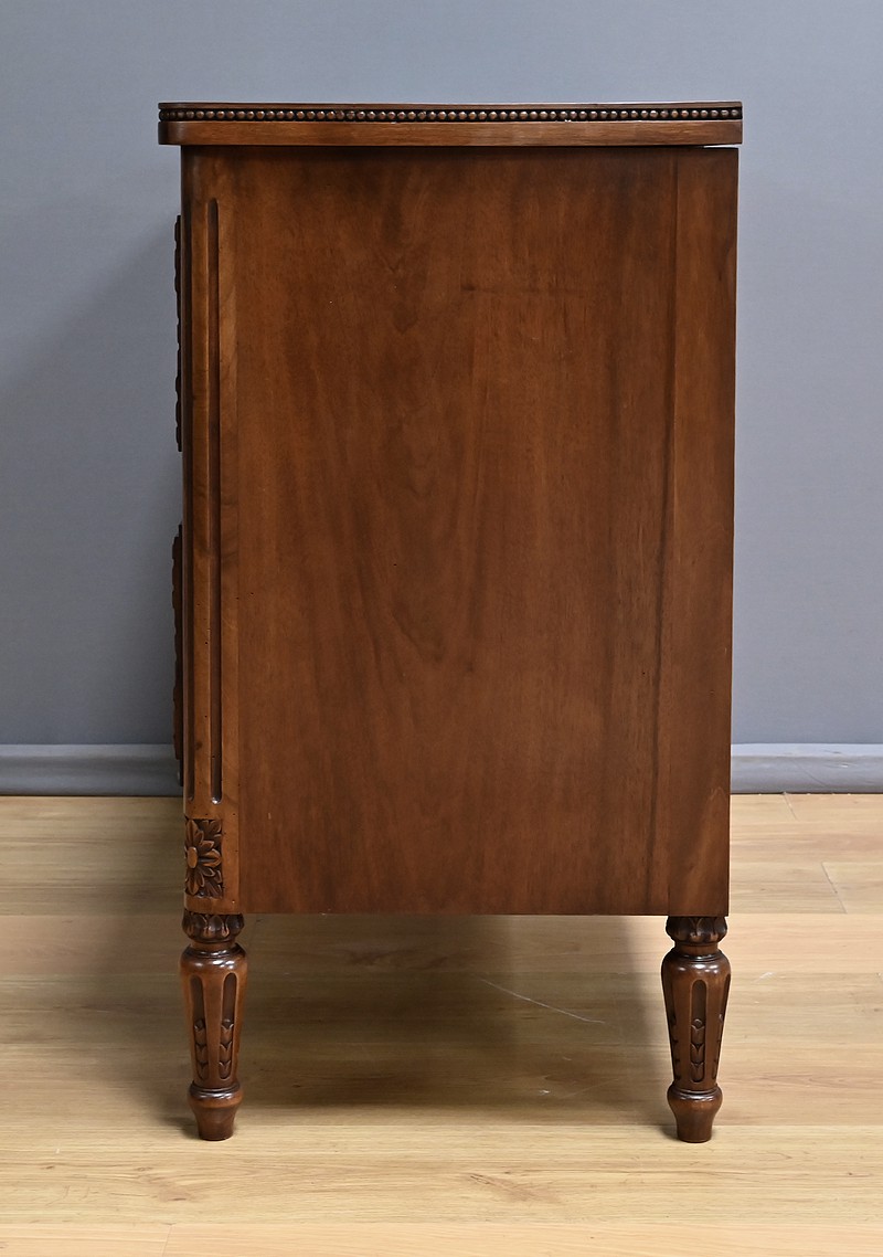 Cette élégante commode en noyer sculpté, réalisée dans le style Louis XVI au milieu du XXe siècle, incarne le raffinement du mobilier classique français. Son plateau est délicatement bordé d’une guirlande de perles, apportant une touche de finesse à l’ensemble. La façade présente deux tiroirs richement ornés de médaillons, de rubans et de feuillages finement sculptés en relief. Chaque tiroir est équipé de poignées anneaux en bronze doré, qui ajoutent une note précieuse à l’ensemble. La traverse inférieure est décorée de motifs floraux stylisés, évoquant une géométrie harmonieuse et équilibrée. Les montants sont à cannelures arrêtées, typiques du style Louis XVI, et se prolongent jusqu’à des pieds en toupie sculptés d’oves, assurant à la fois stabilité et élégance. Cette pièce, à la fois décorative et fonctionnelle, trouvera parfaitement sa place dans un intérieur raffiné, qu’il soit classique ou éclectique.