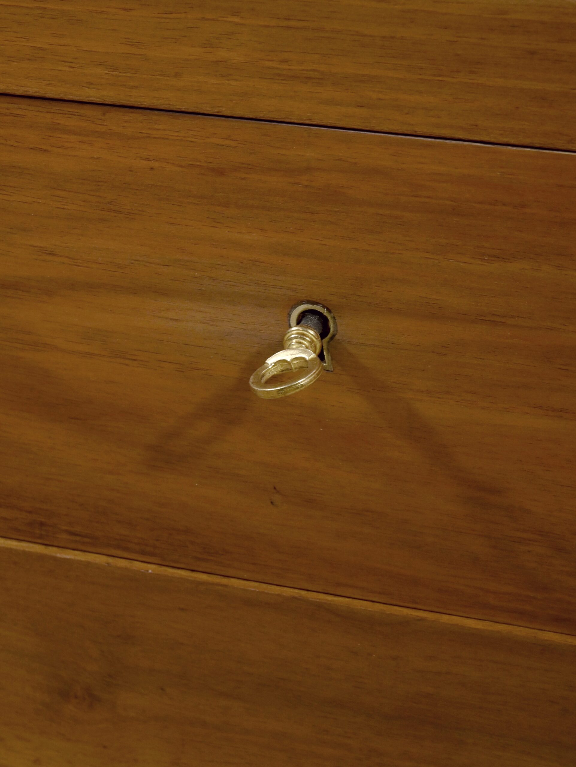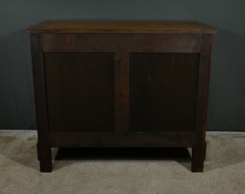 Élégante commode en noyer massif de style Restauration, datant de la fin du XIXe siècle. Ce meuble se distingue par la qualité de son bois et ses lignes épurées. Dotée de trois tiroirs spacieux, chacun muni d’une clé avec entrée laiton et serrure fonctionnelle, cette commode offre un espace de rangement généreux pour vos effets personnels. Elle repose sur des pieds avant en forme de disque. Les lignes épurées de cette commode en font un meuble intemporel qui s’intègre harmonieusement dans tout type de décoration, qu’elle soit traditionnelle ou contemporaine.